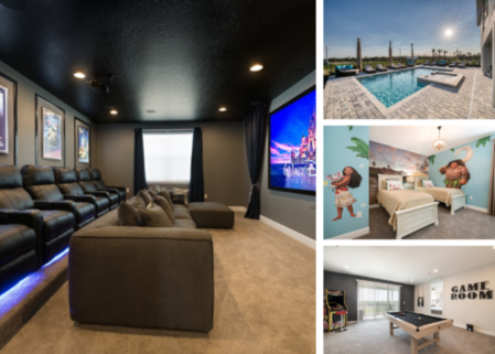 Sleeping up to 24 people, EC270 has bedrooms across both floors including 3 children's themed bedrooms such as Galactic and Pirates as well as a home theater, themed games room with a foosball table, and upper floor loft area with a pool table, for all your entertainment needs, so the fun does not have to end at the theme parks!