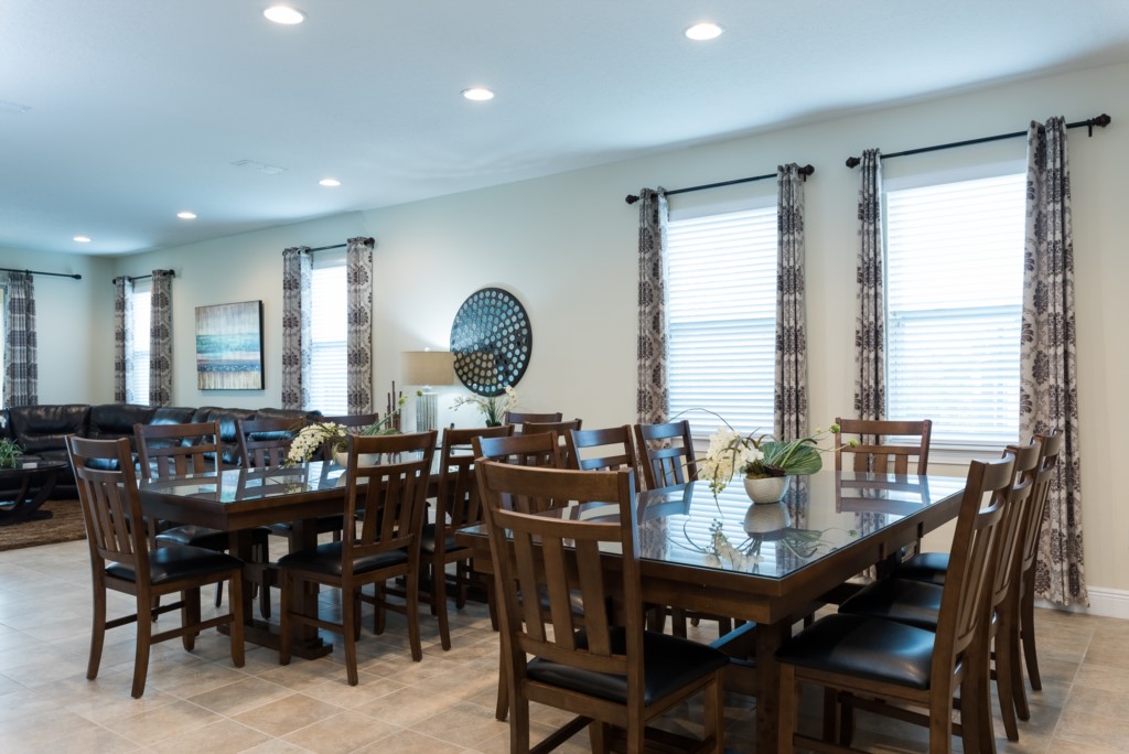 The open layout of the main family living area, includes pool deck views, comfortable seating, and a fully equipped kitchen and dining area for snacks, meals and quality family time together.