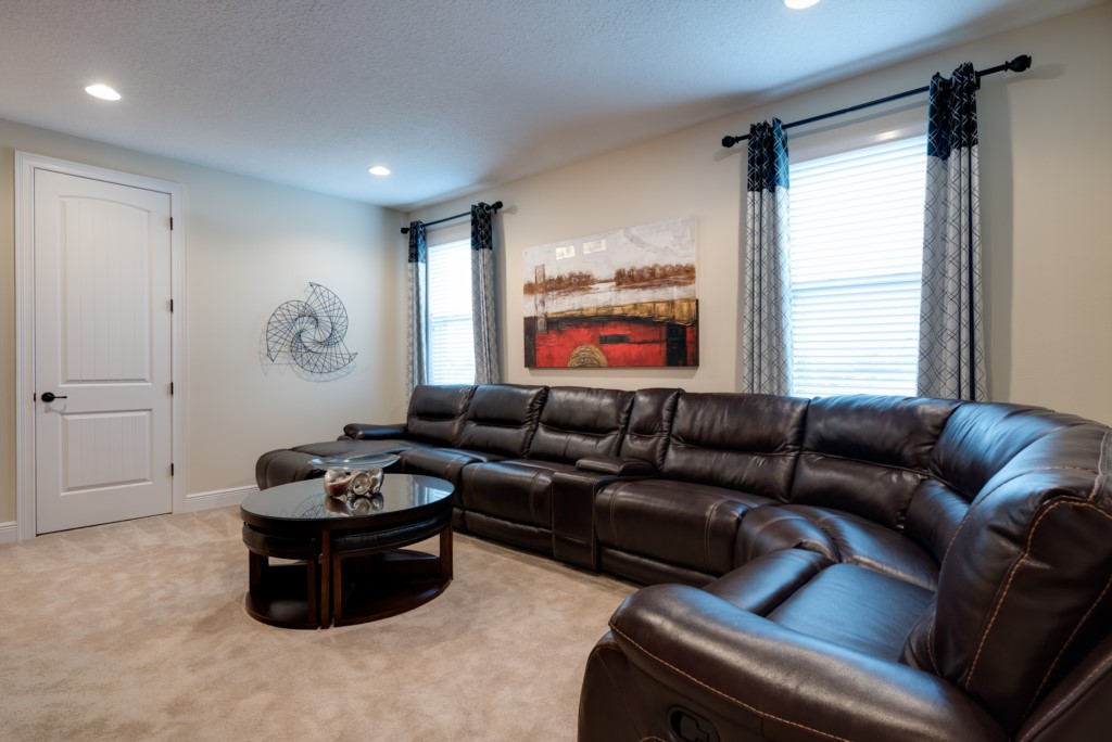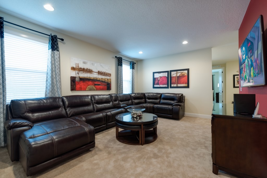 Second Floor loft area with Smart TV, sectional leather sofa and XBox