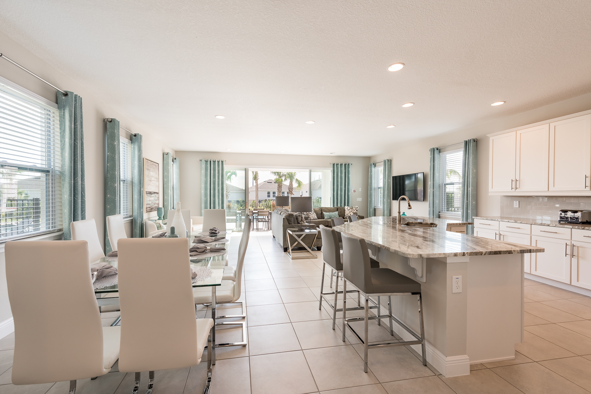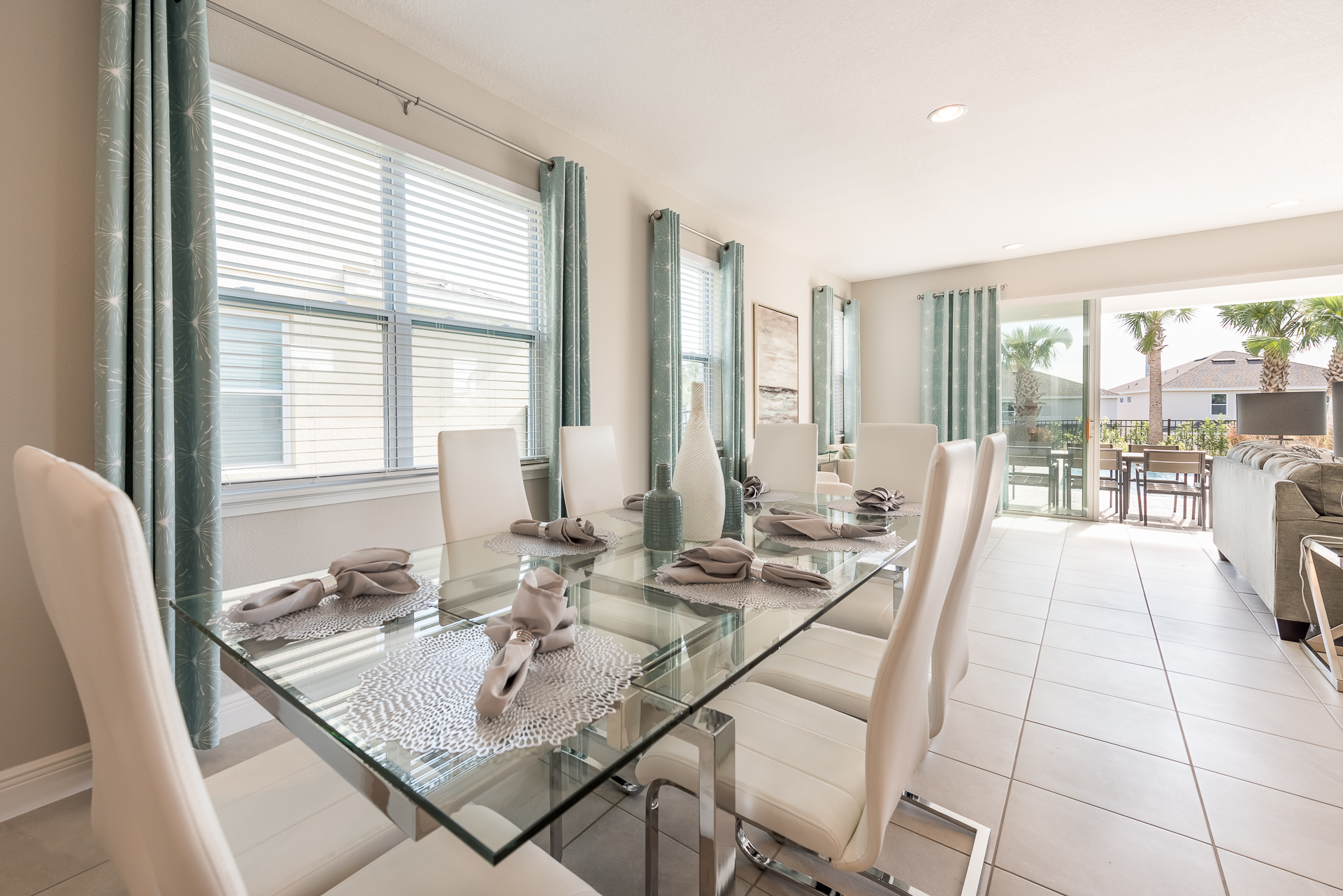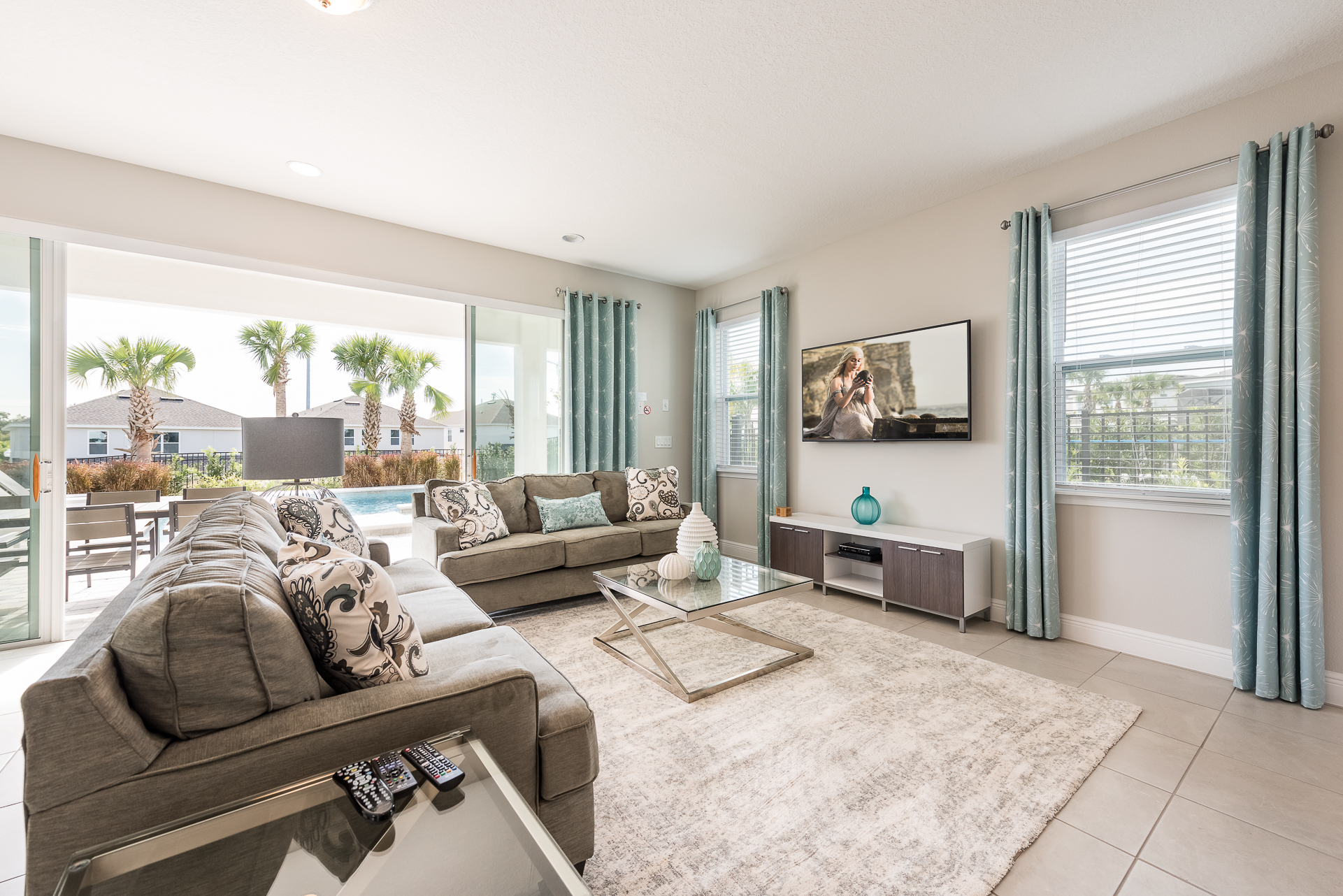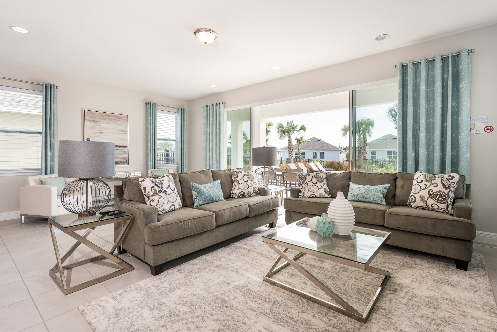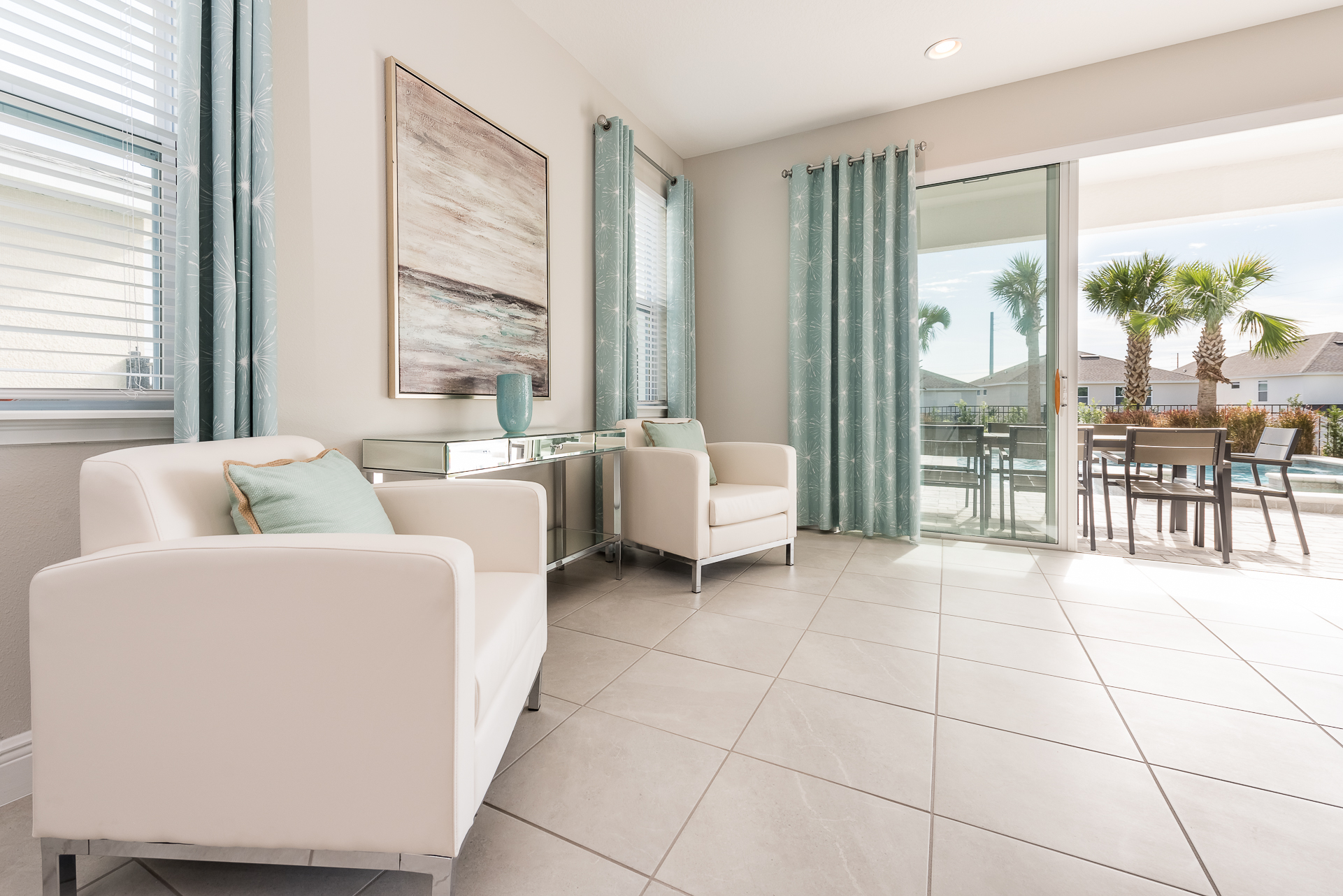 Spacious comfortable seating area with 2x sofas and 2x leather accent chairs overlooking the private pool deck through sliding glass doors