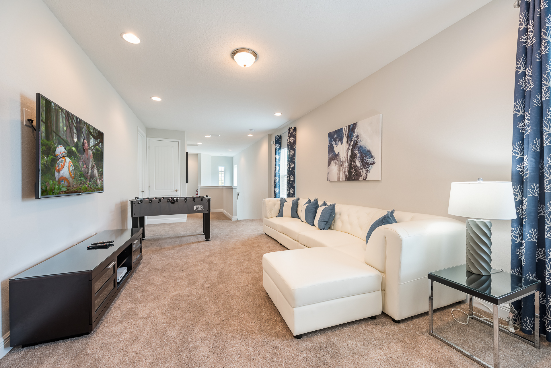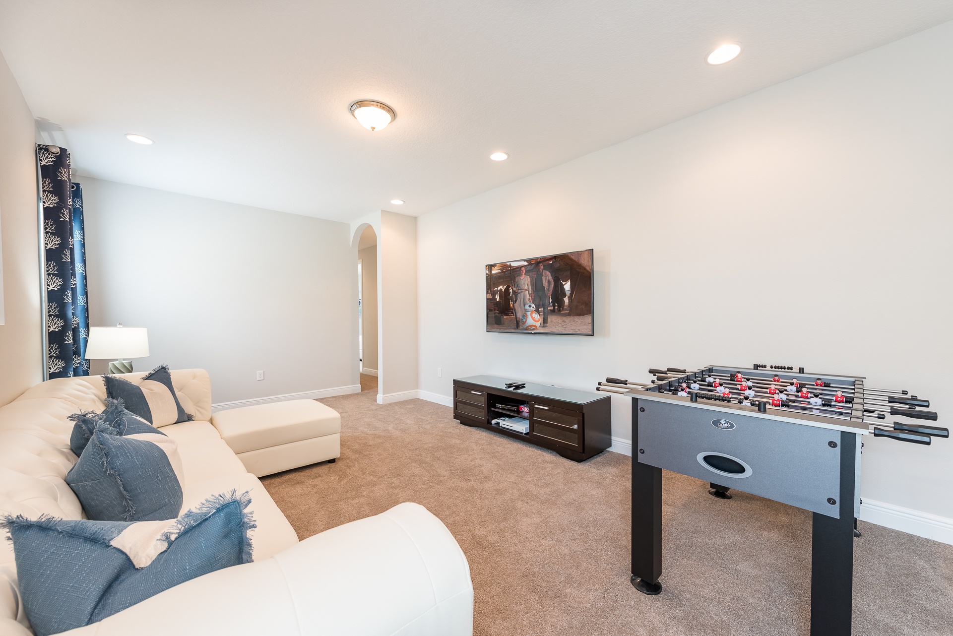 Upper floor loft area has a large flat screen TV with an X-Box One video game console, leather sectional, and foosball table