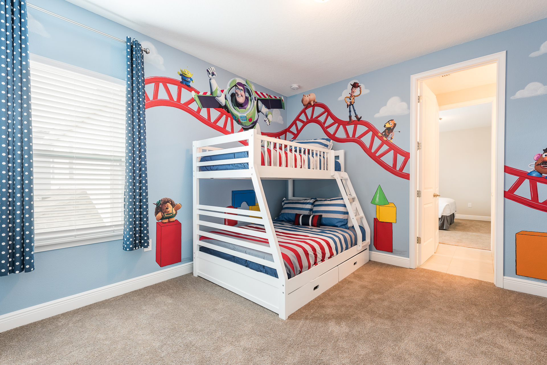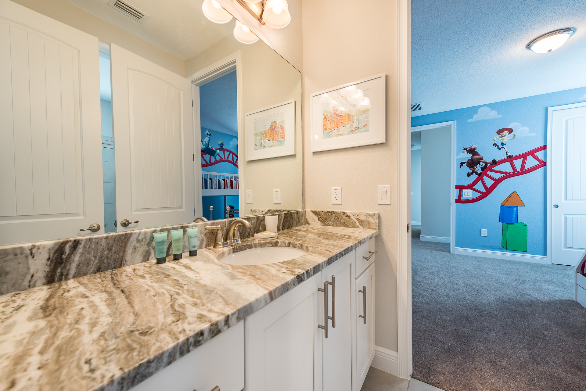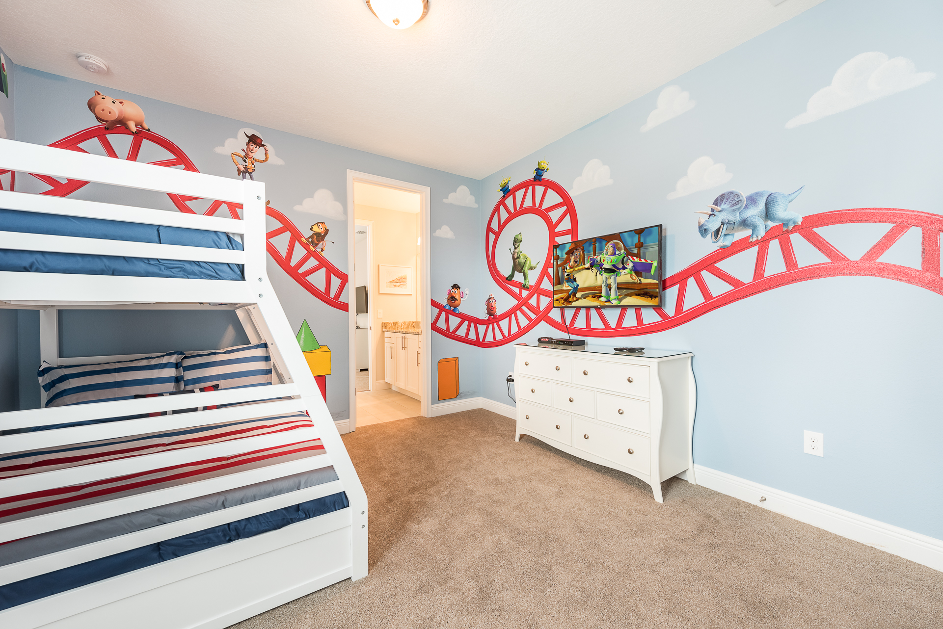 Queen sized bedroom with en suite (Jack/Jill style-shower) connecting to a Themed bedroom with bunk beds (Twin/Full sized bed, additional Twin sized bed underneath)