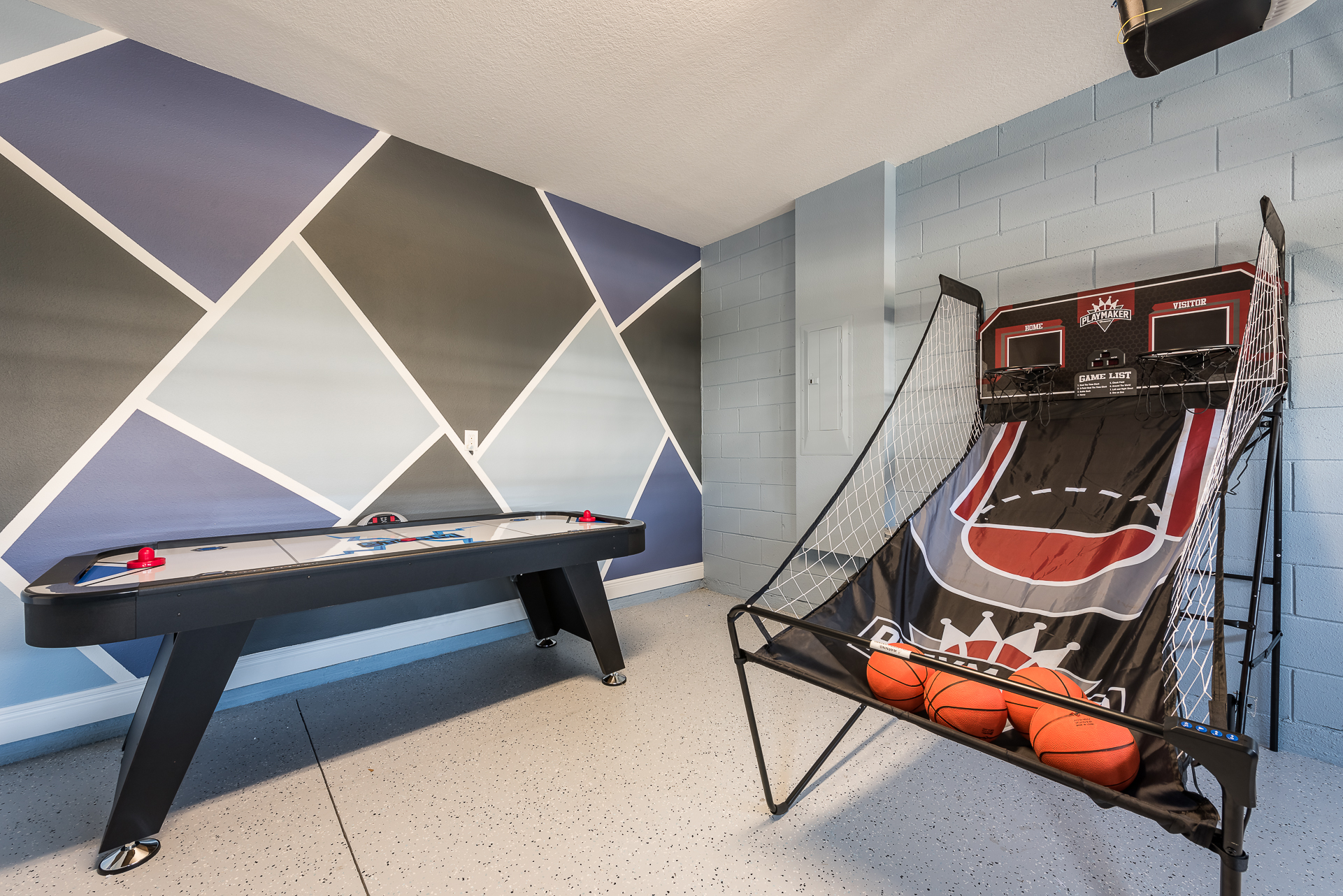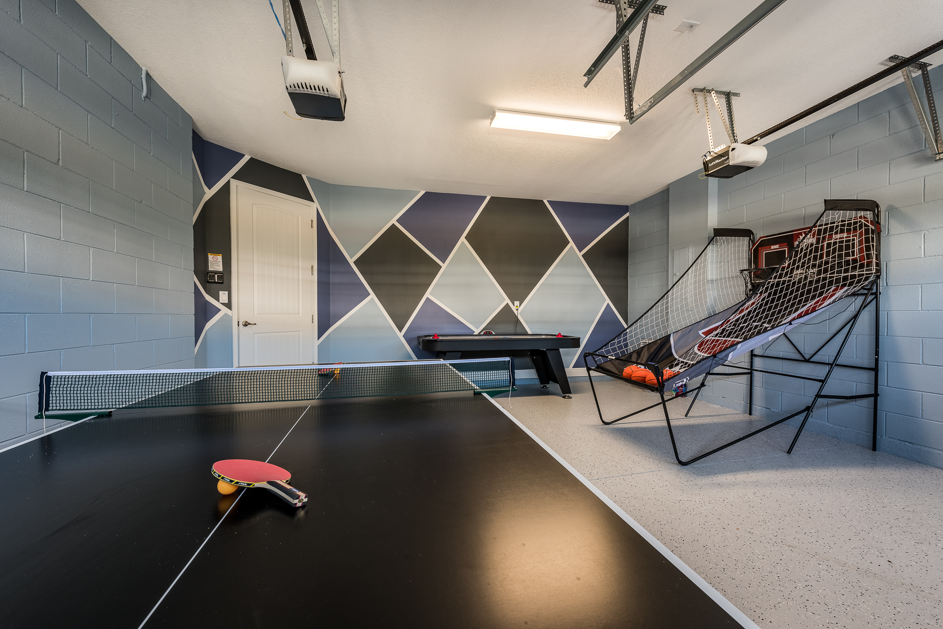 Games room has a ping pong and air hockey table, basketball shooting game