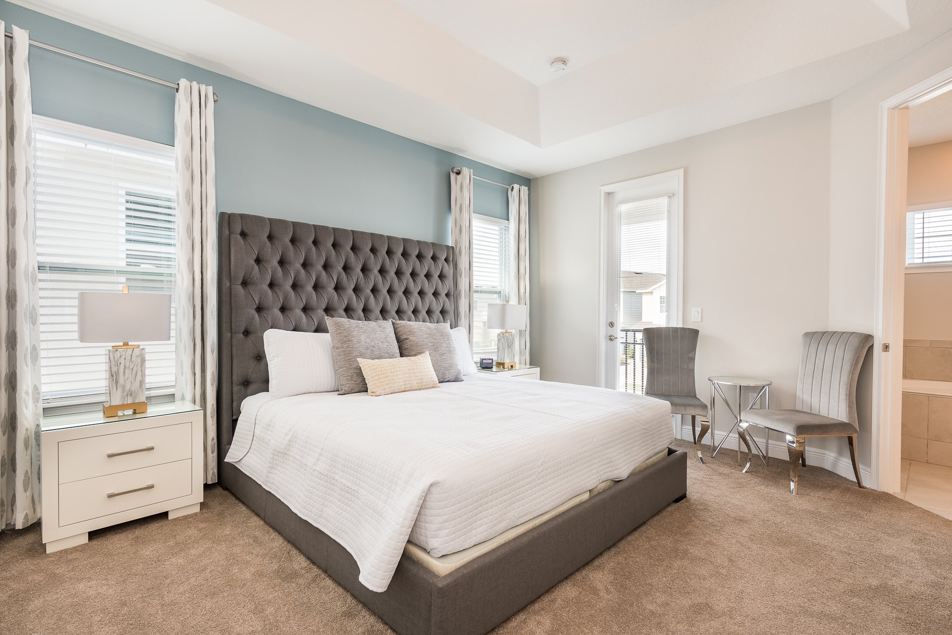 King sized Master with en suite (shower, tub, twin vanities), 2x accent chairs, and a private balcony over the front of the home