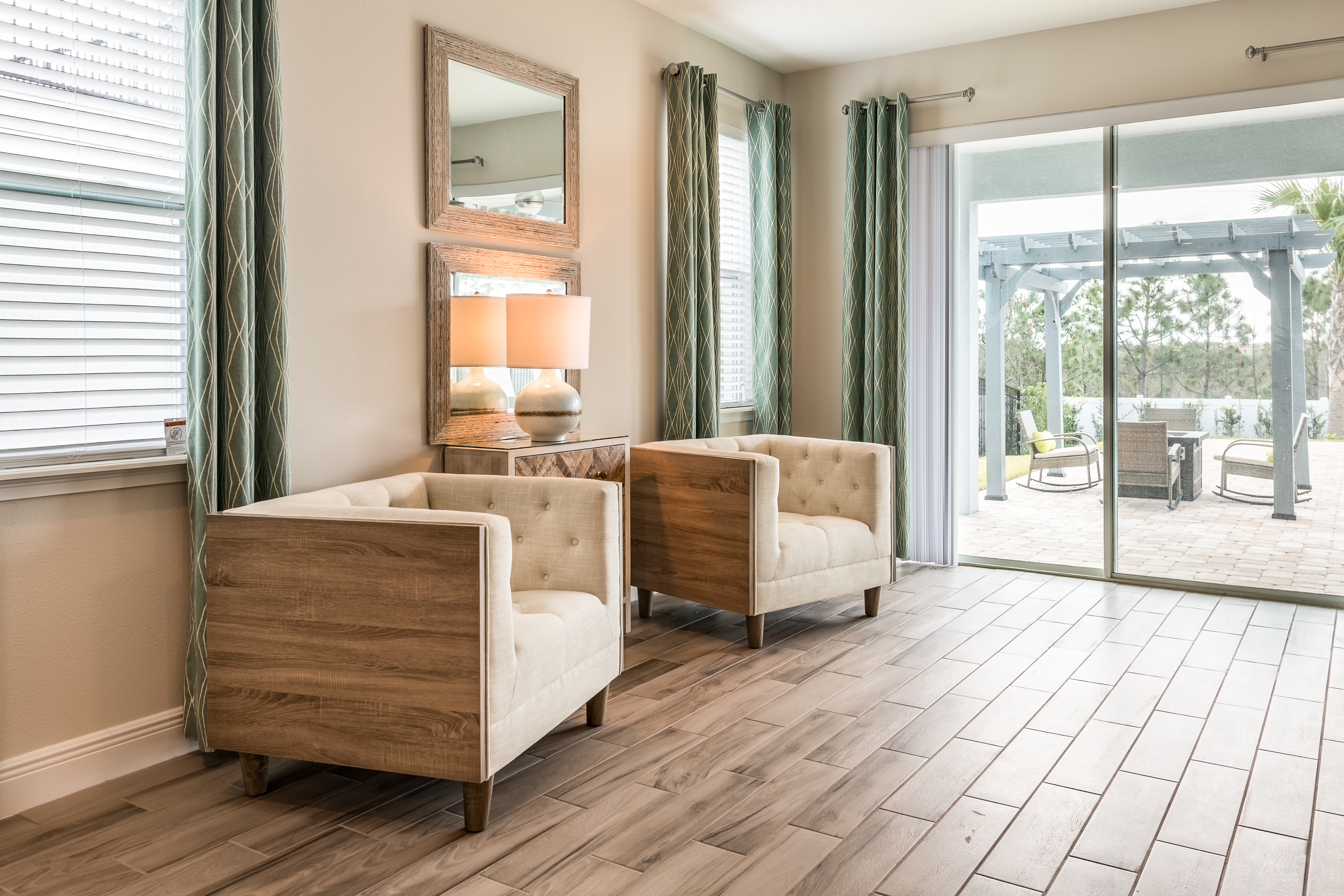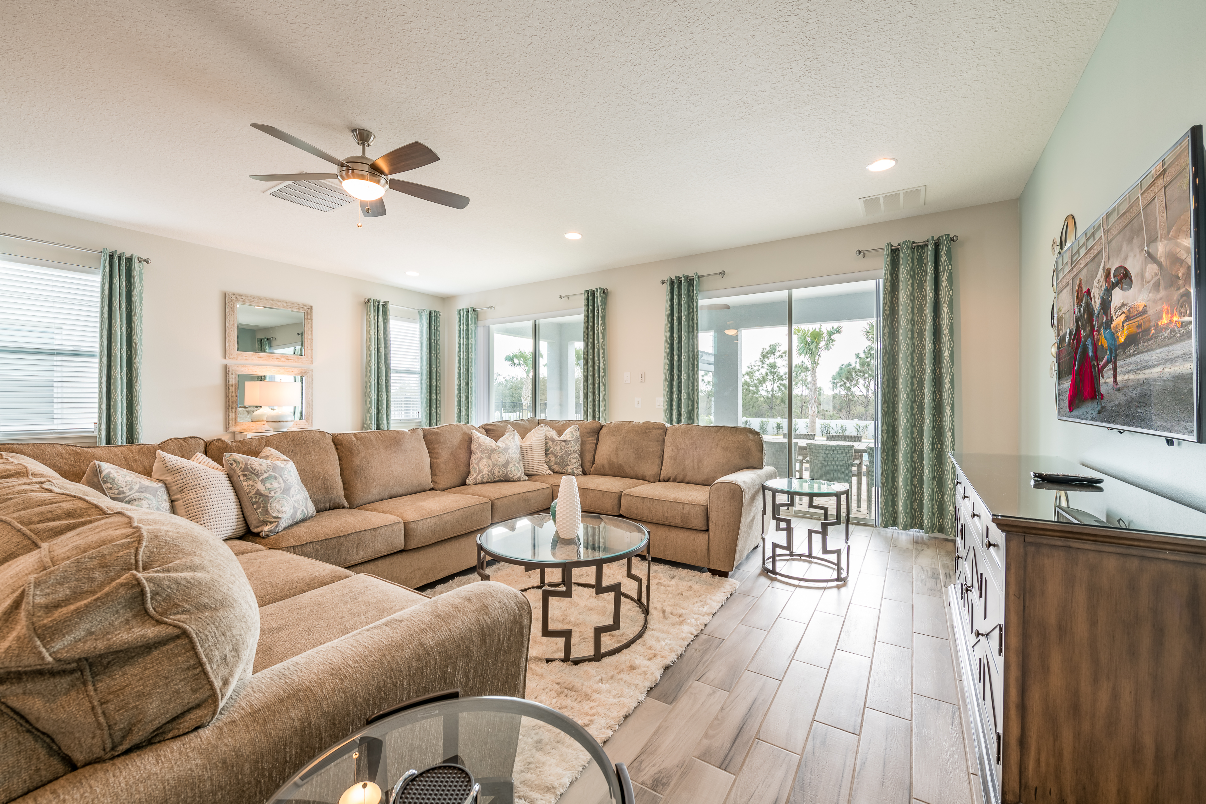 Spacious comfortable seating area with a large sectional and 2x accent chairs overlooking the private pool deck through sliding glass doors