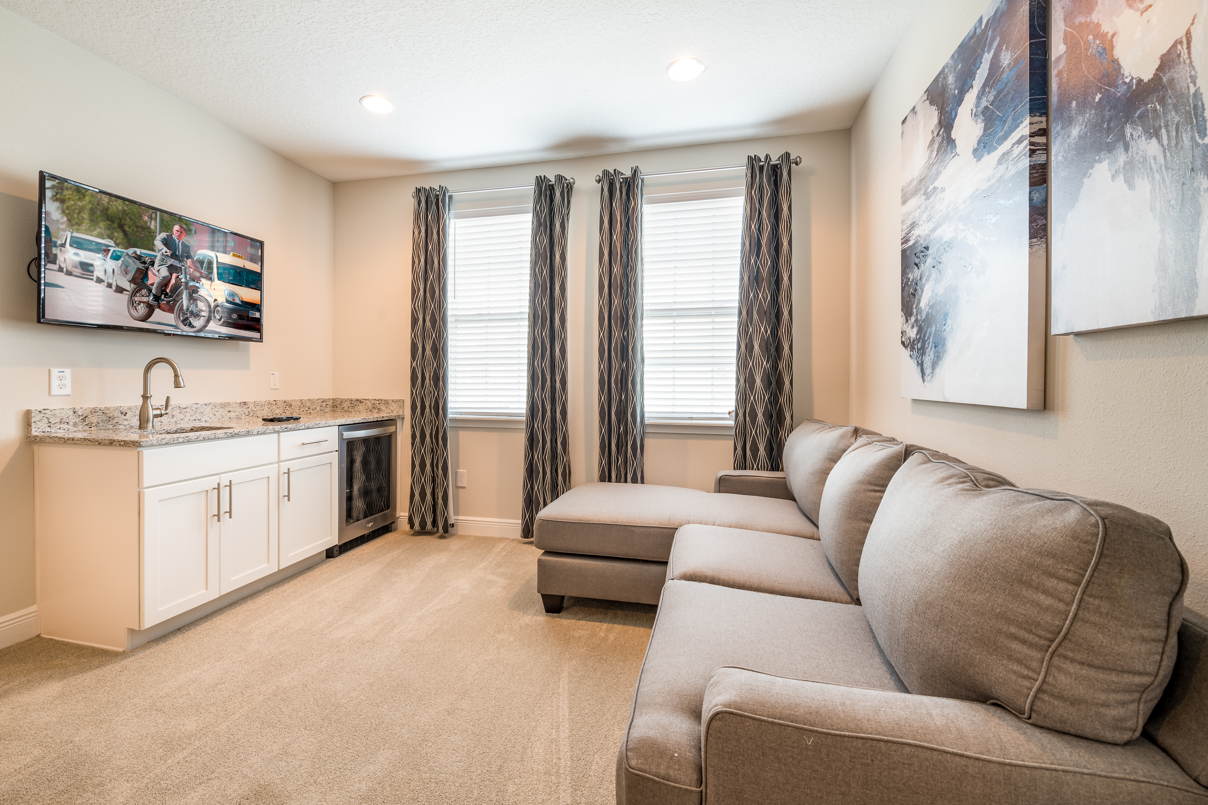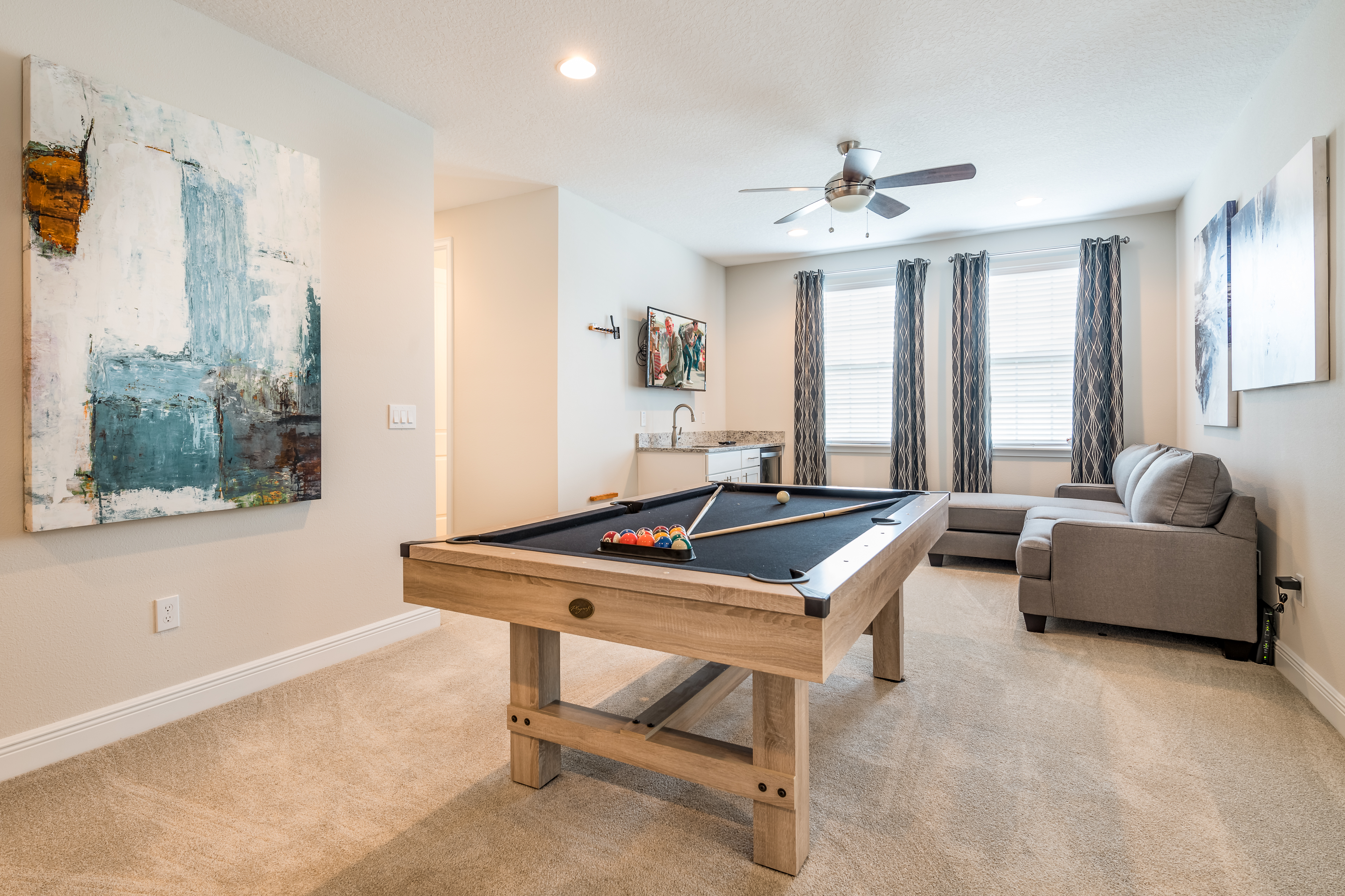 Upper floor loft area has a large flat screen TV, comfortable sectional, wet bar, and pool table