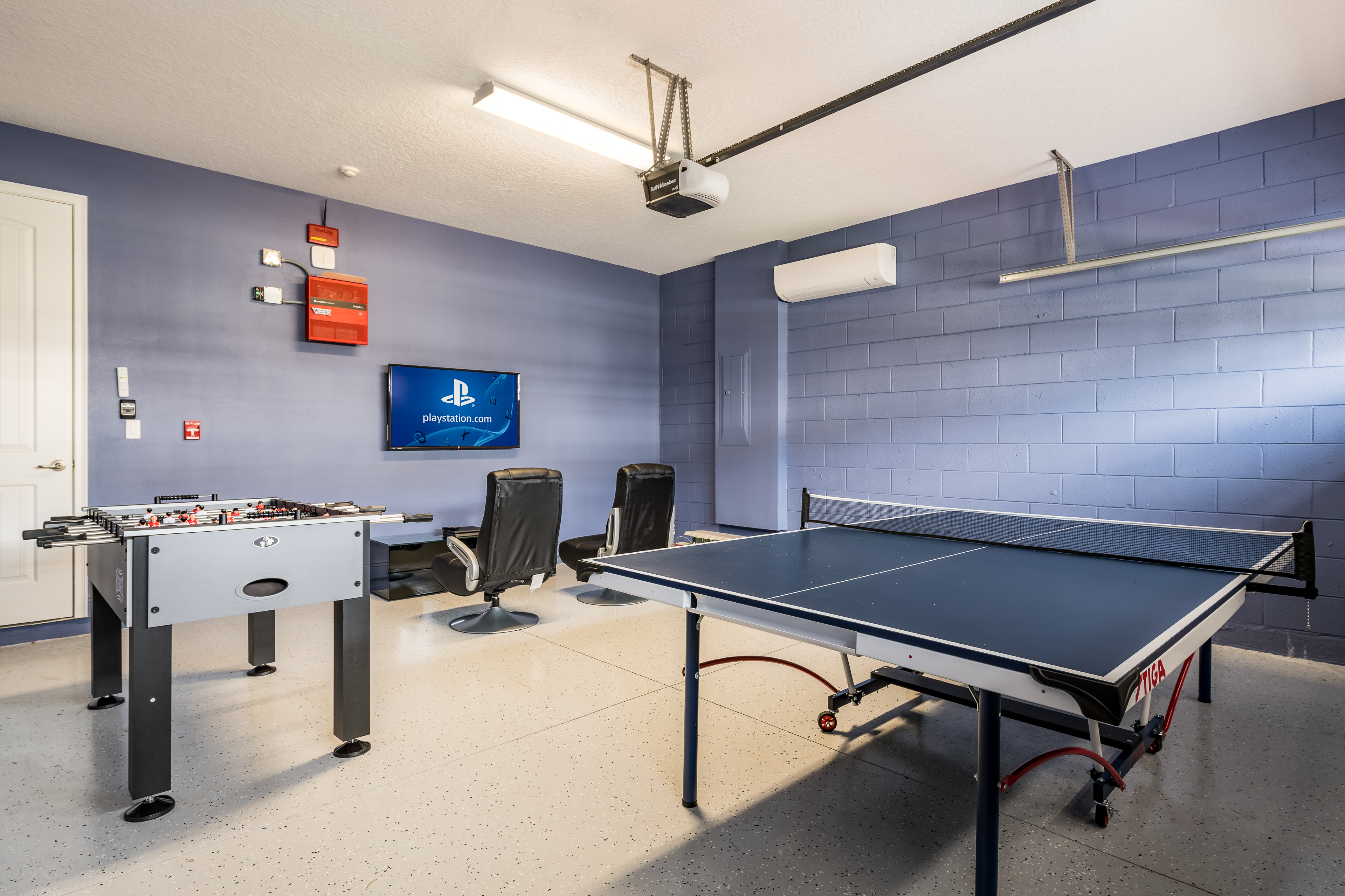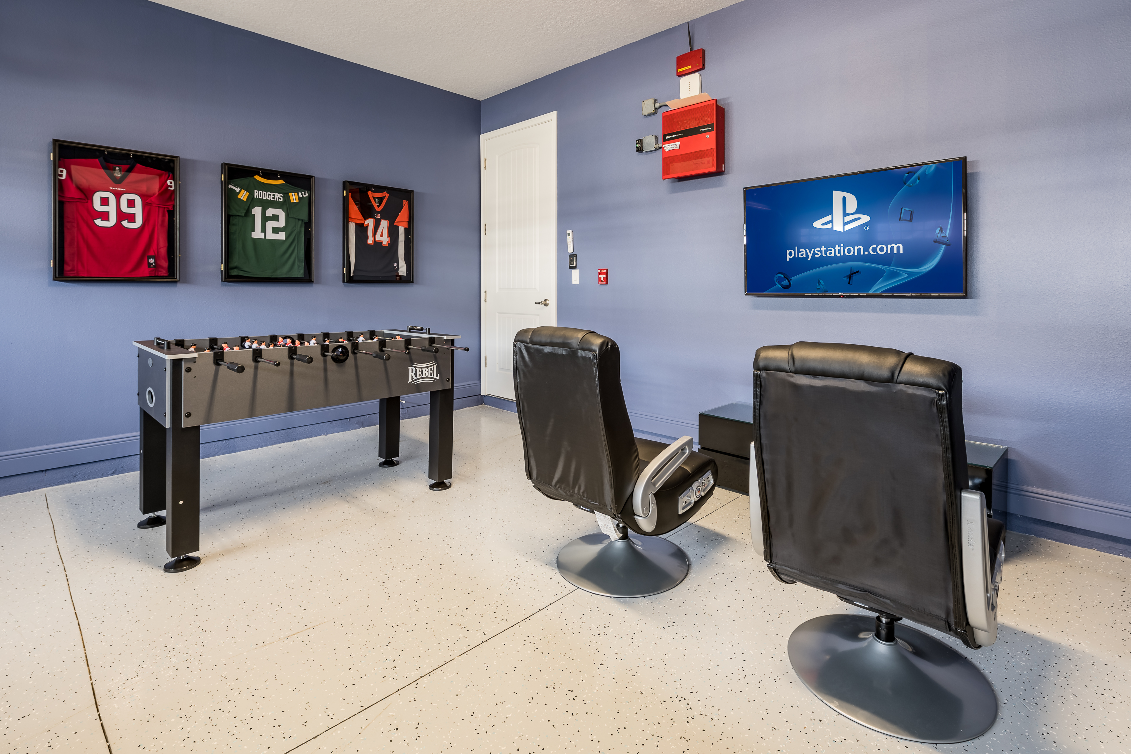 Games room has a foosball and ping pong table, large flat screen TV with a PS4 video game console, 2x video gaming chairs