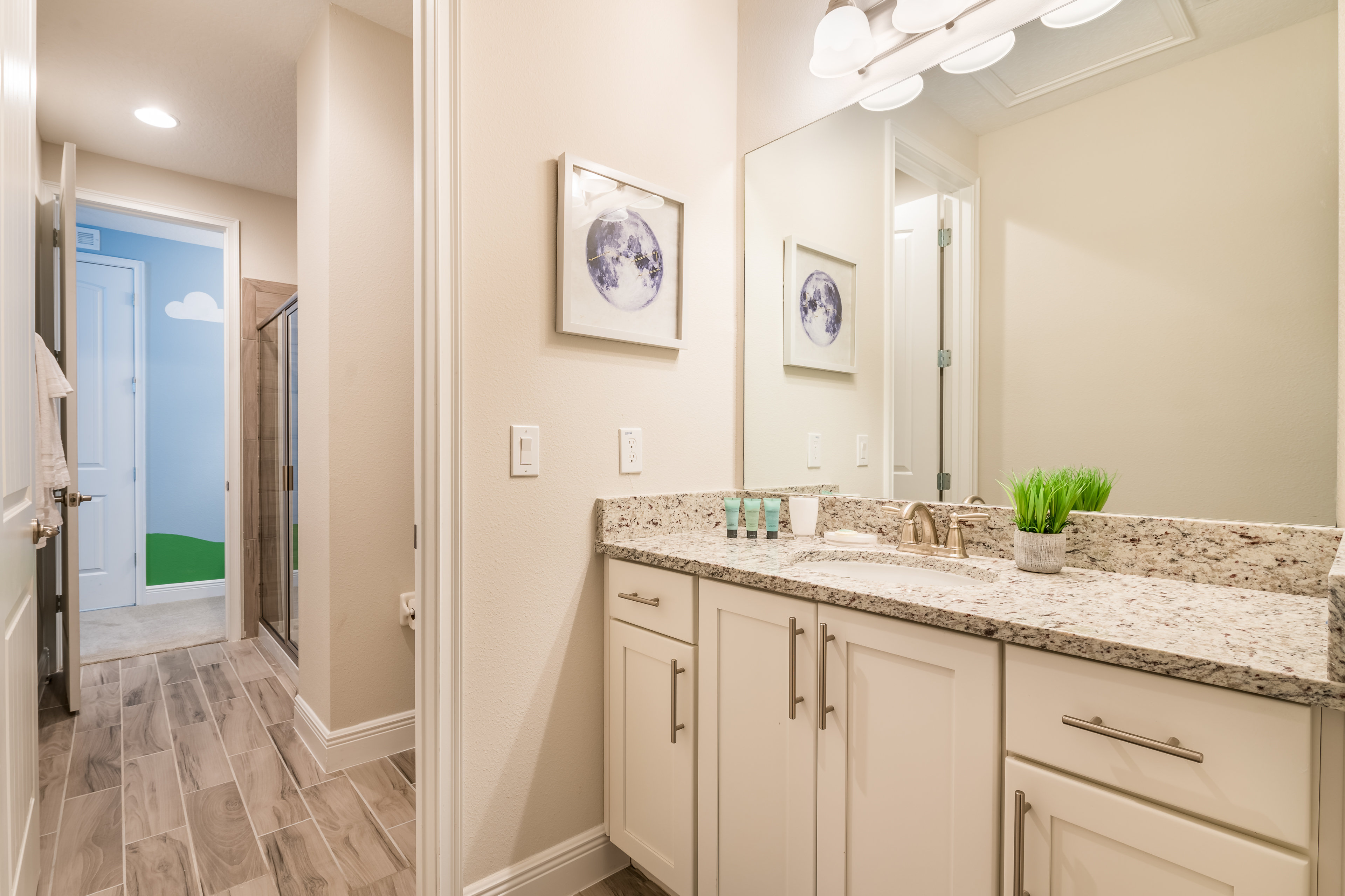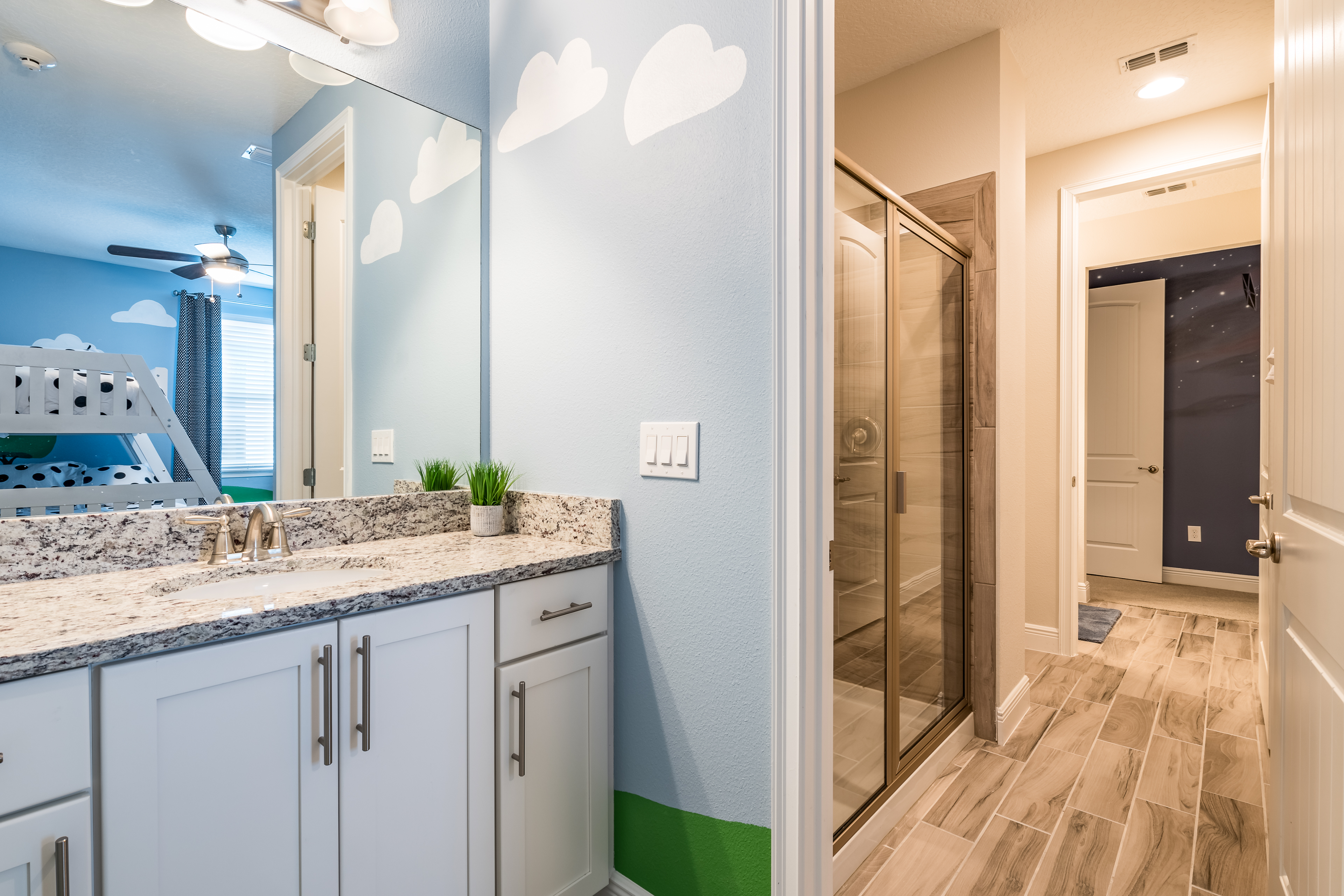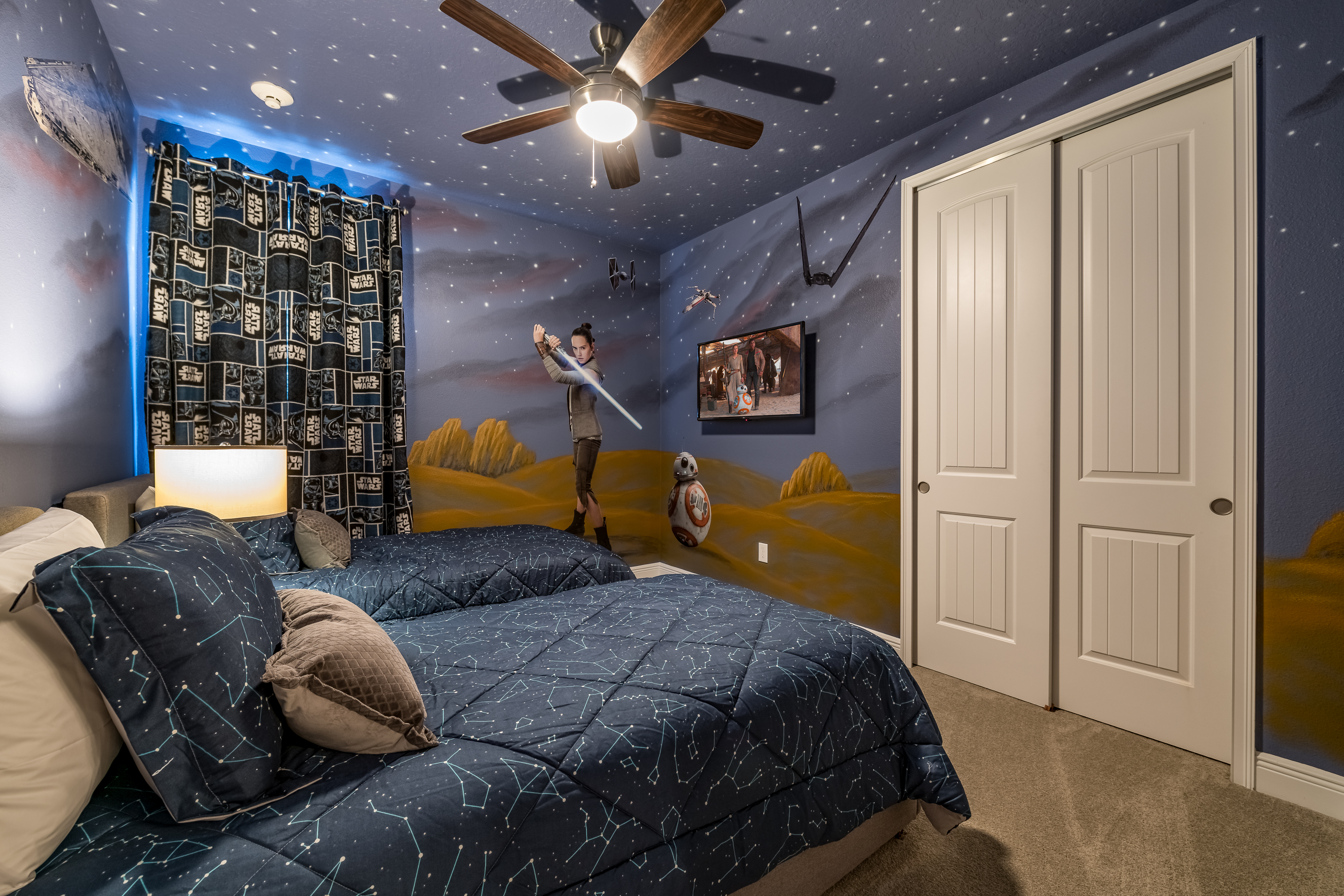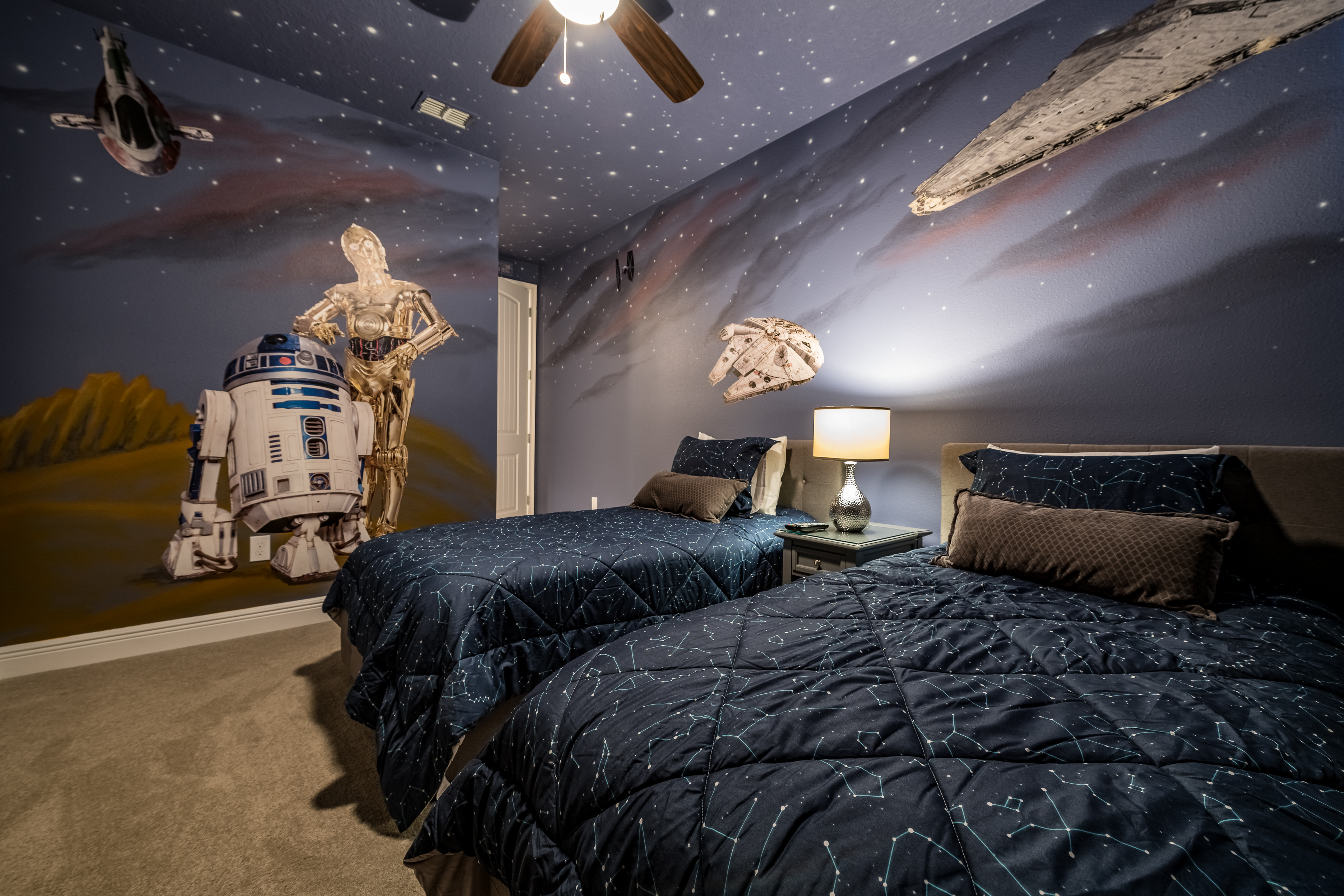 Themed bedroom with bunk beds (Full/Twin sized beds) and an en suite (Jack/Jill style-shower, 2x separate vanities) connecting to a Galactic themed bedroom with 2x Twin sized beds