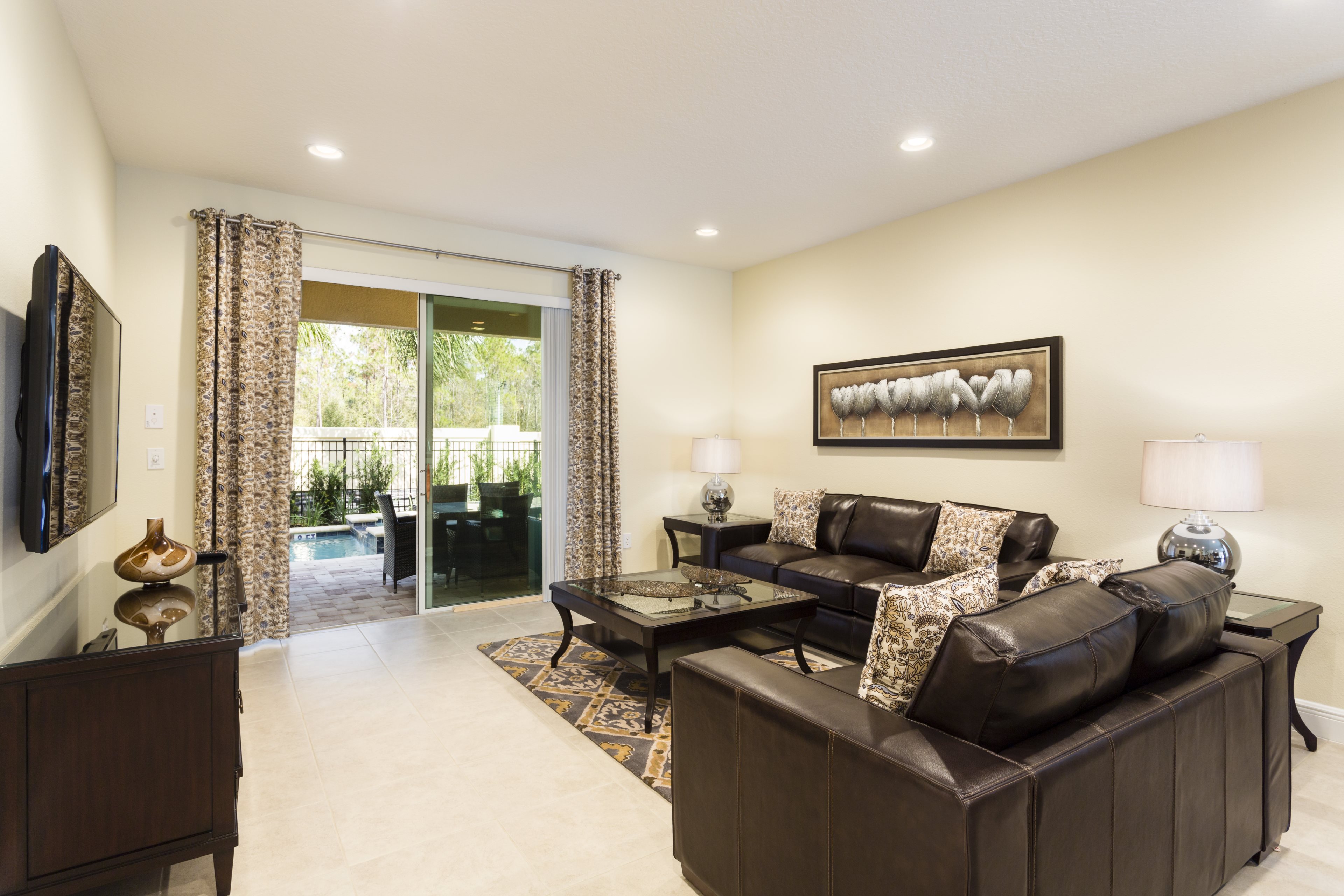 Spacious comfortable seating area with a leather sofa and love seat overlooking the private pool deck through sliding glass doors