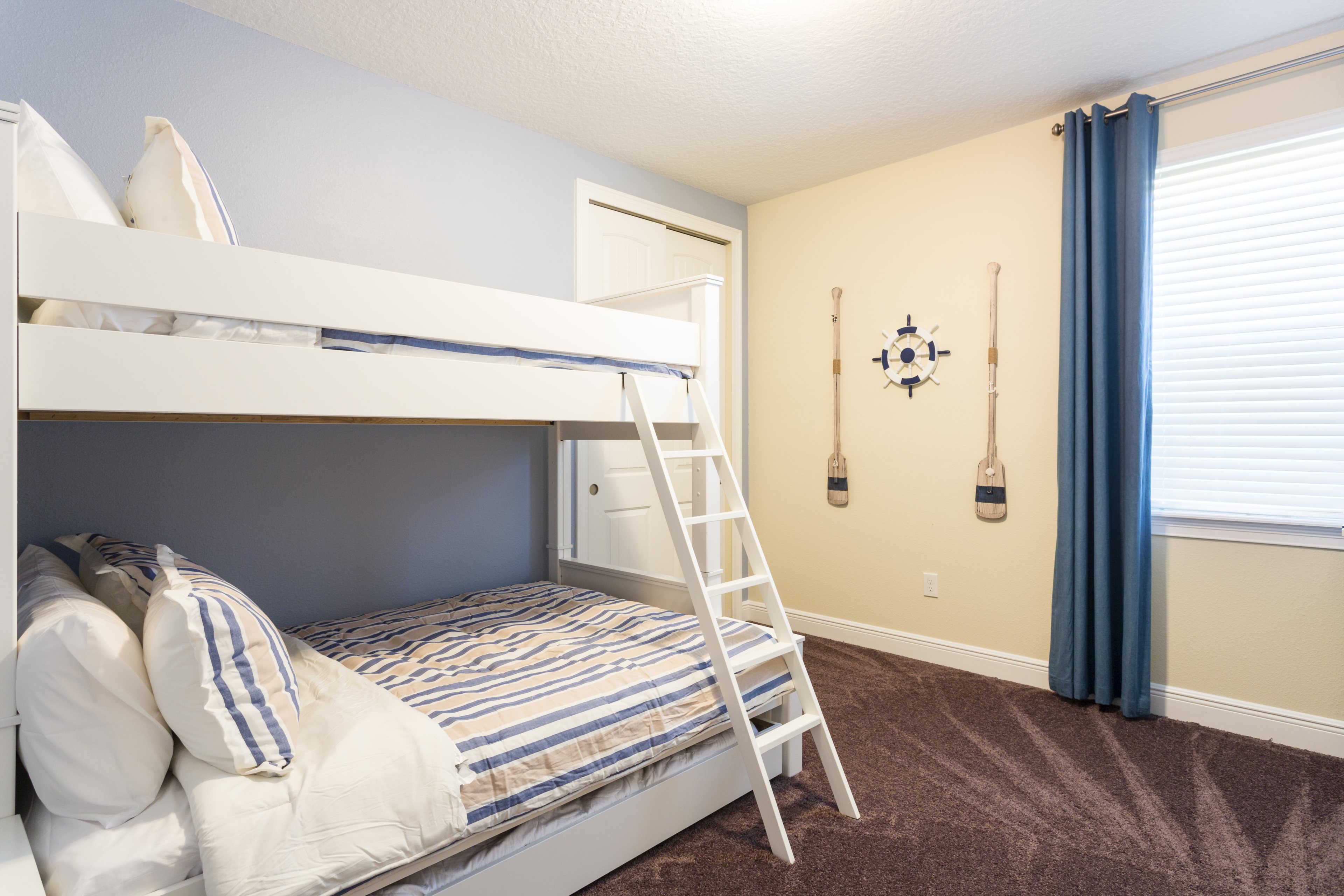 A bedroom with bunk beds (Twin and Full sized bed, trundle bed underneath) and an en suite (shower)