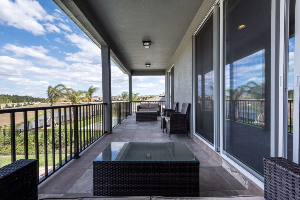 Upstairs balcony is furnished with 2x patio chairs and 2x outdoor love seats