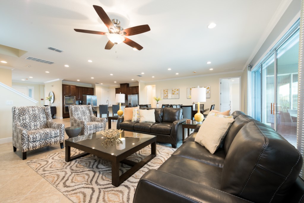 Spacious comfortable seating area with 2x sofas and 2x accent chairs overlooking the private pool deck through sliding glass doors