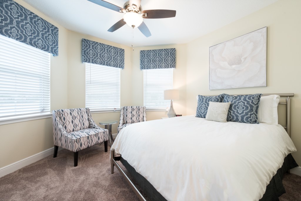 Queen sized bedroom with 2x accent chairs