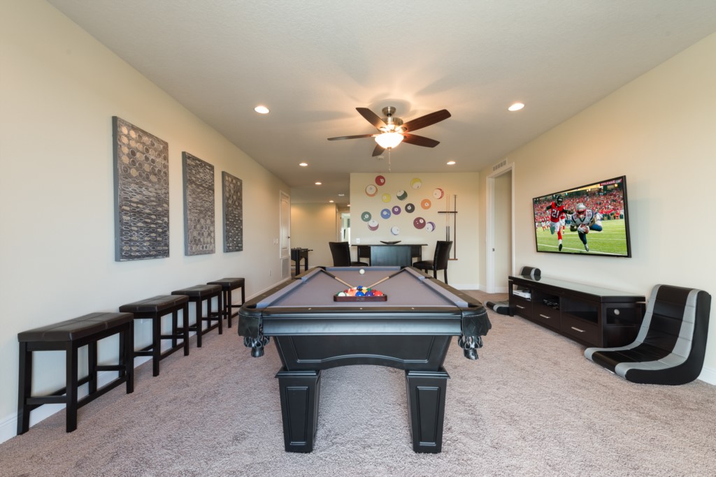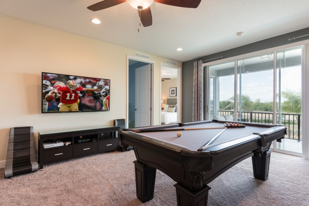 A home theater and entertainment loft area provides hours of endless entertainment where you and your loved ones can watch your favorite movies on a large projection screen or find out who is the best at pool, foosball, or video games!