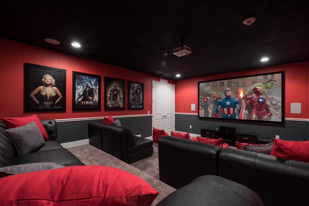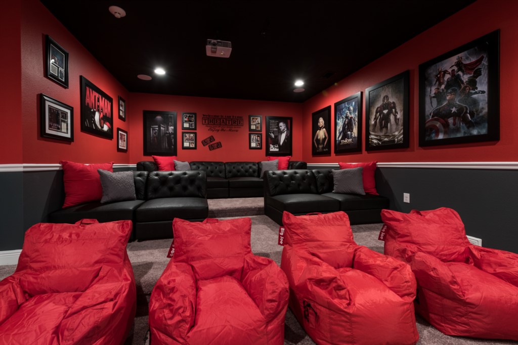 Home theater has a large projection screen, 4x bean bags, a large sofa, and 2x 2 seat sofas