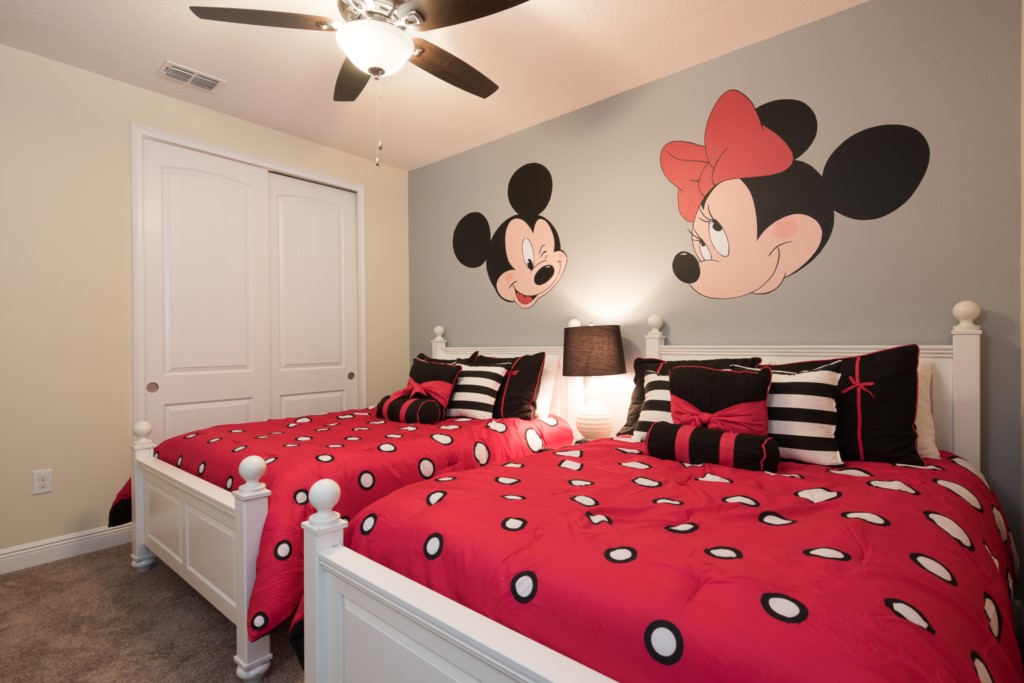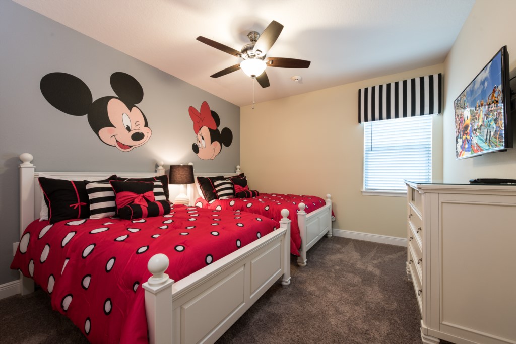 'Mickey and Minnie Mouse' themed bedroom with 2x Full sized beds and an en suite (shower)
