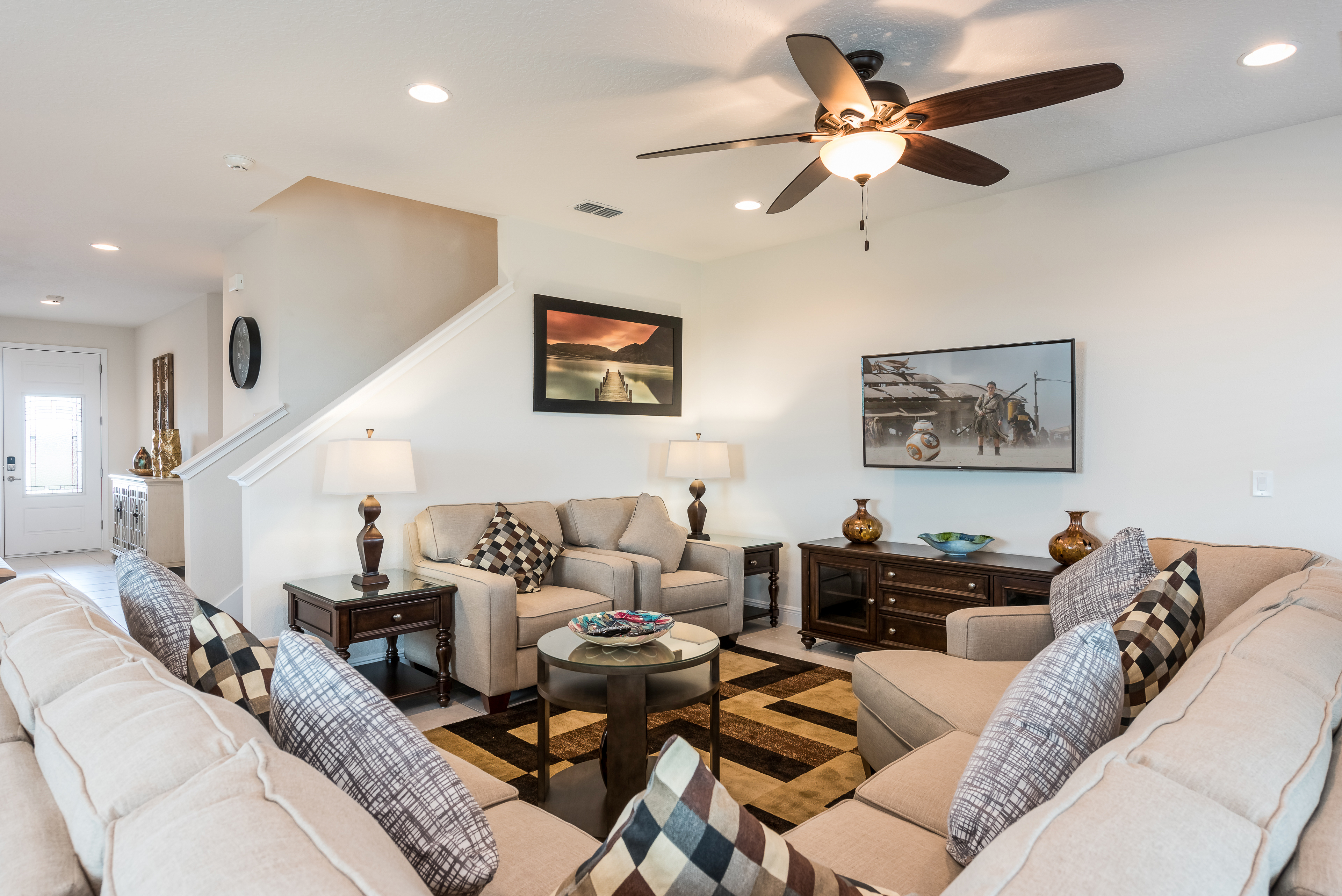 Spacious comfortable seating area with a large sectional and 2x accent chairs