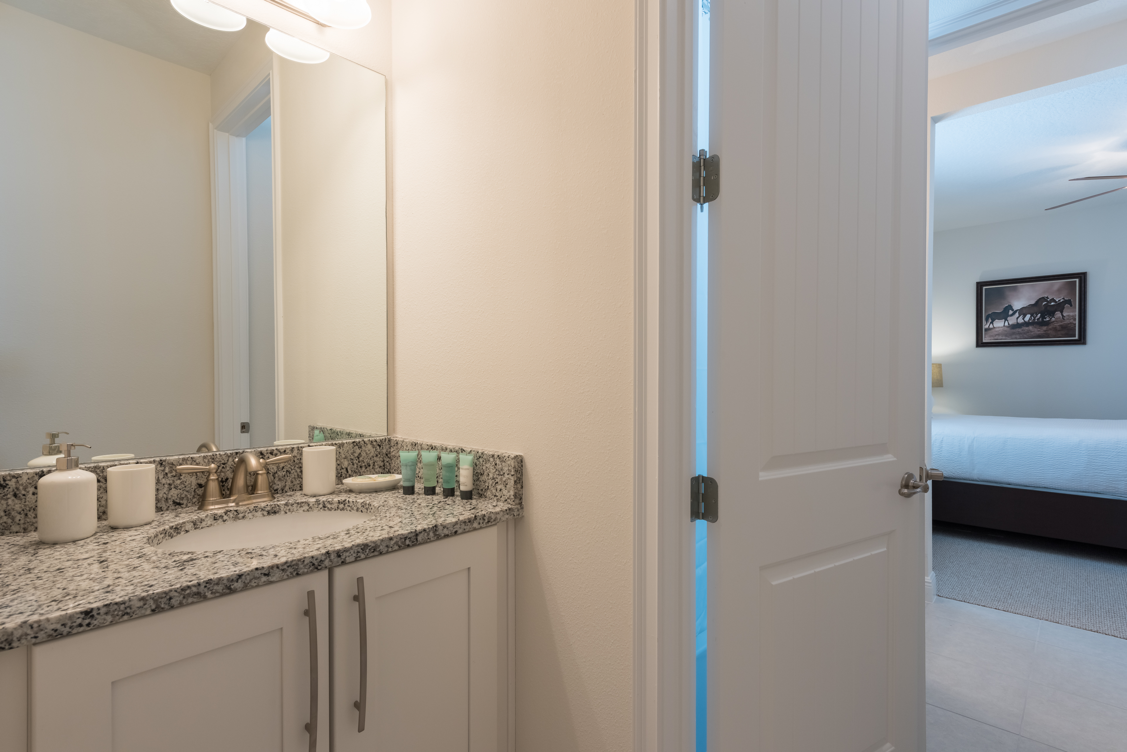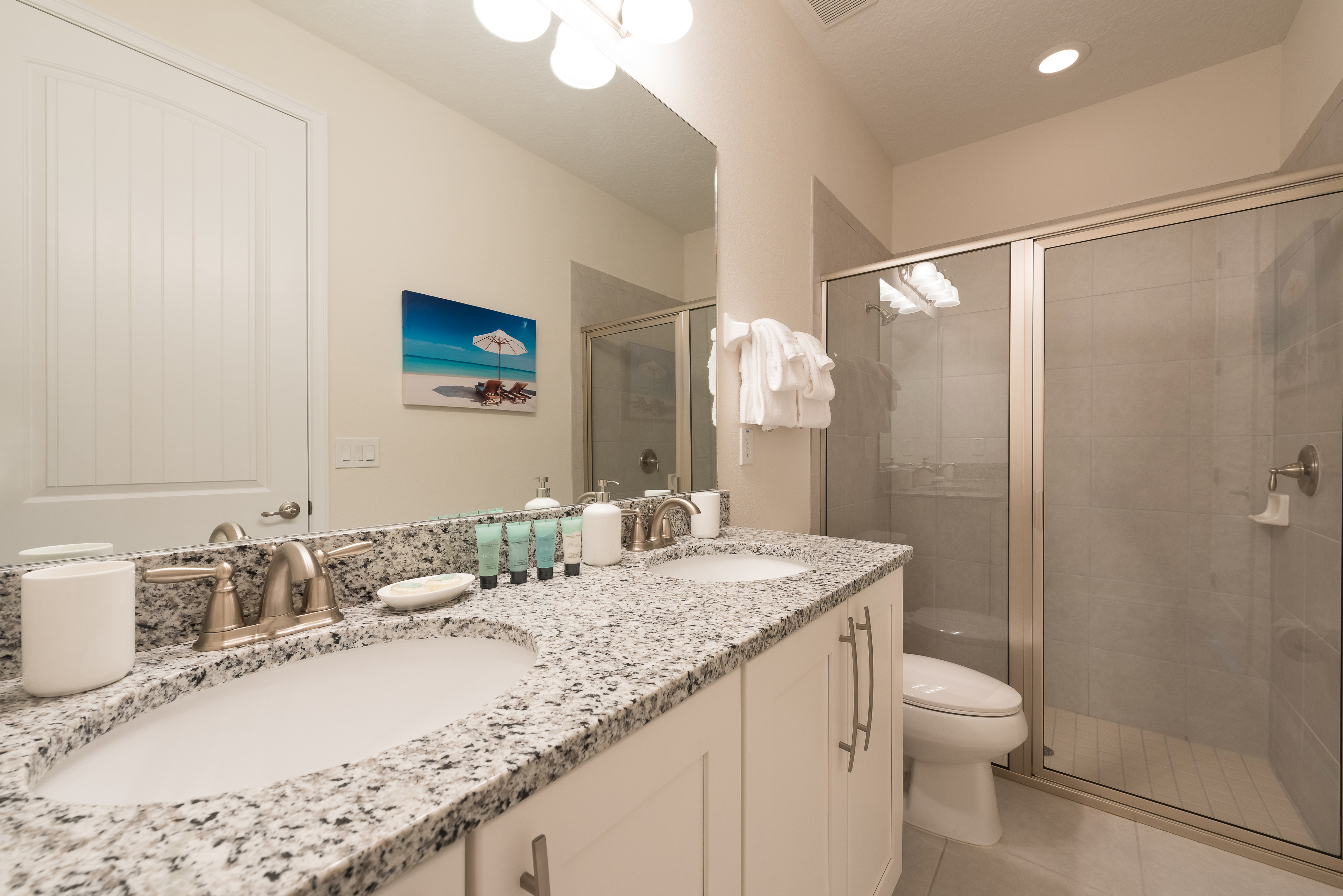 Queen sized bedroom with en suite (Jack/Jill style-shower, twin vanities) connecting to a bedroom with 2x Twin sized beds