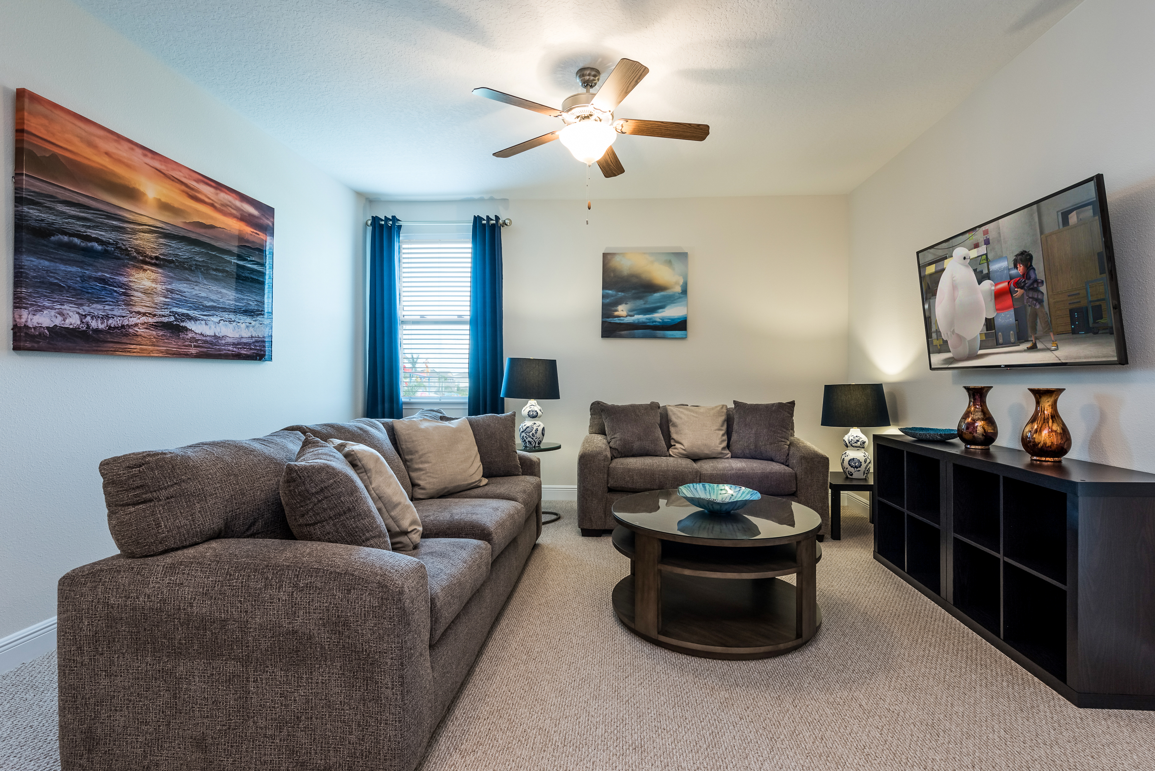 Upper floor loft area has a large flat screen TV, comfortable sofa and love seat