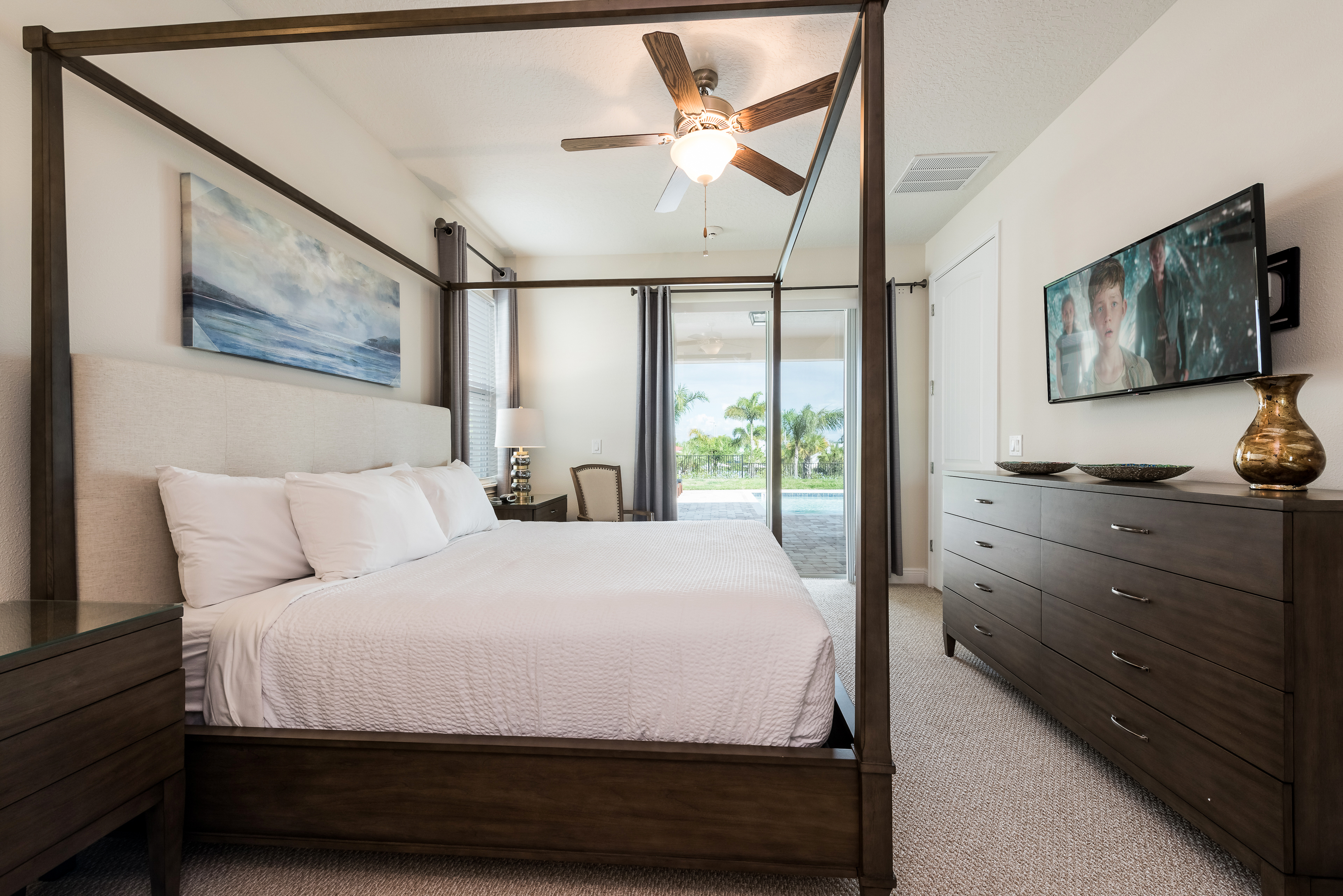 King sized Master with en suite (shower, tub, twin vanities), accent chair, and patio access