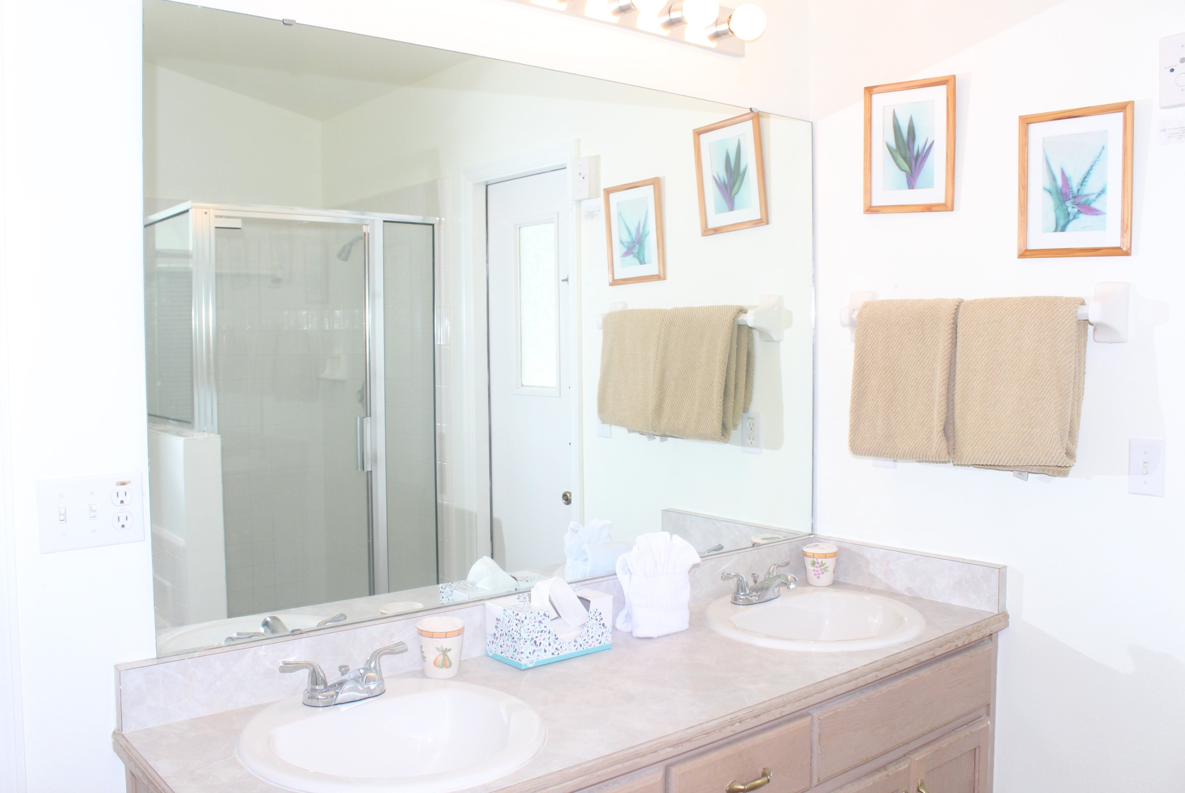 The master bedroom has a king size bed and full bath and separate shower with spacious sink with storage below. There are hairdryers in both of the bathrooms so no need to bring your own. There is a Flatscreen TV in the bedroom and a walk-in closet.