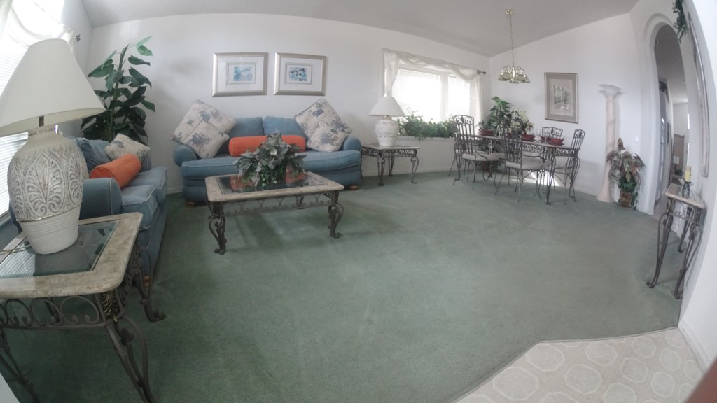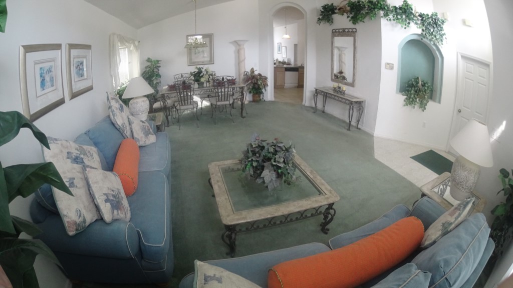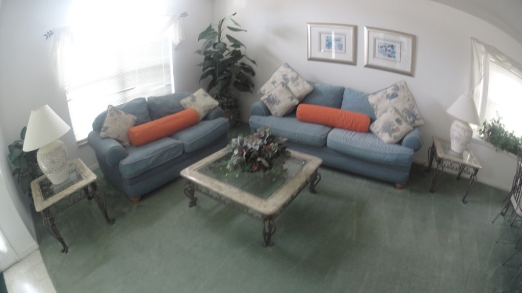 Family room with TV, PlayStation 2 and sliding glass doors to the fully screened pool area