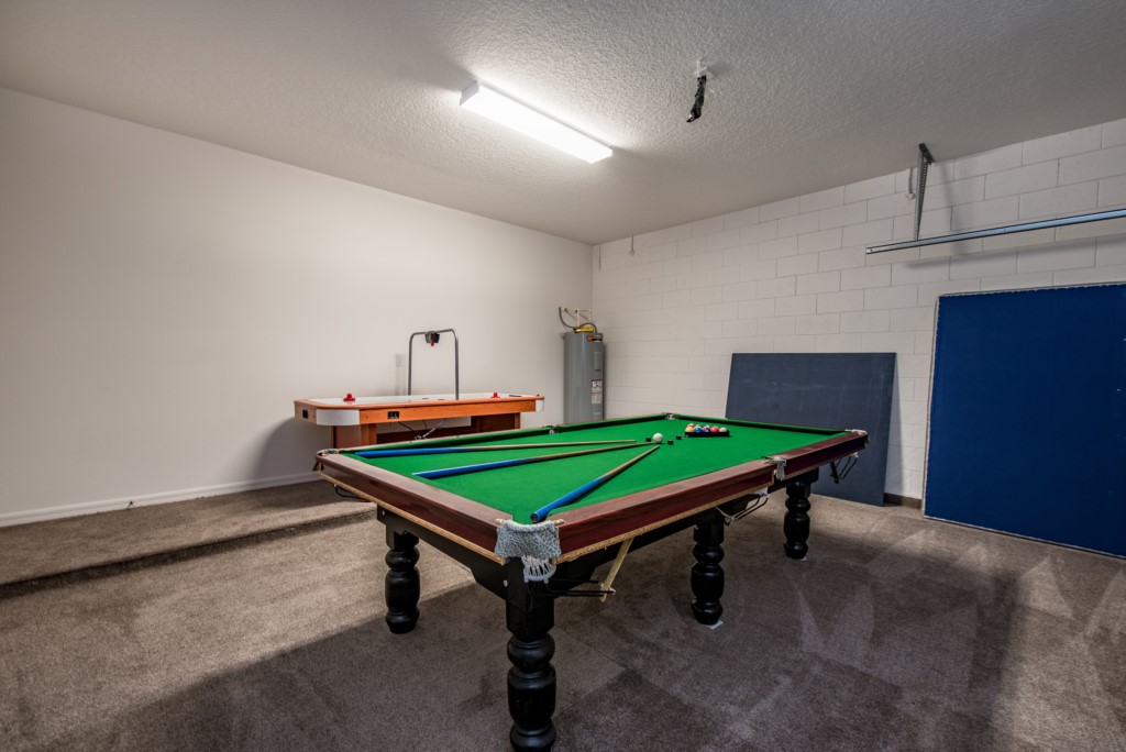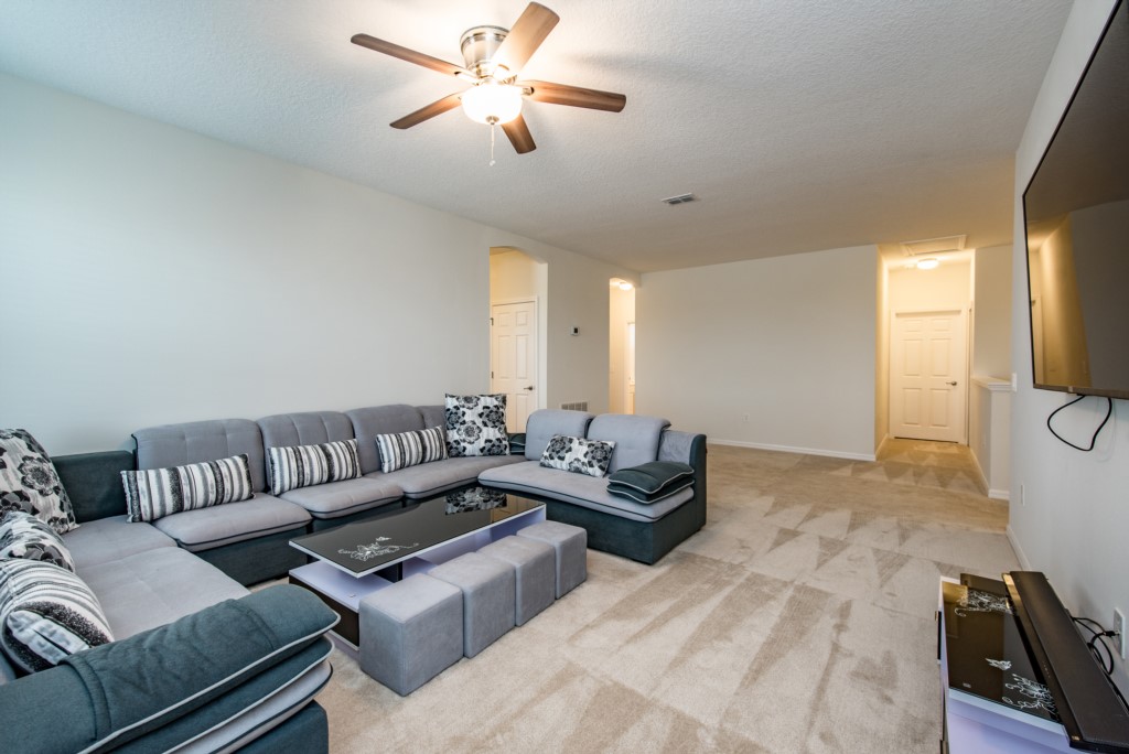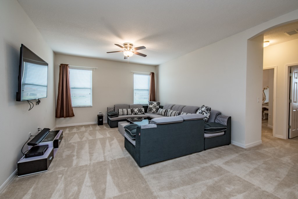 Upstairs, the loft area provides a second social gathering area, with comfortable seating, games area and flat screen TV.