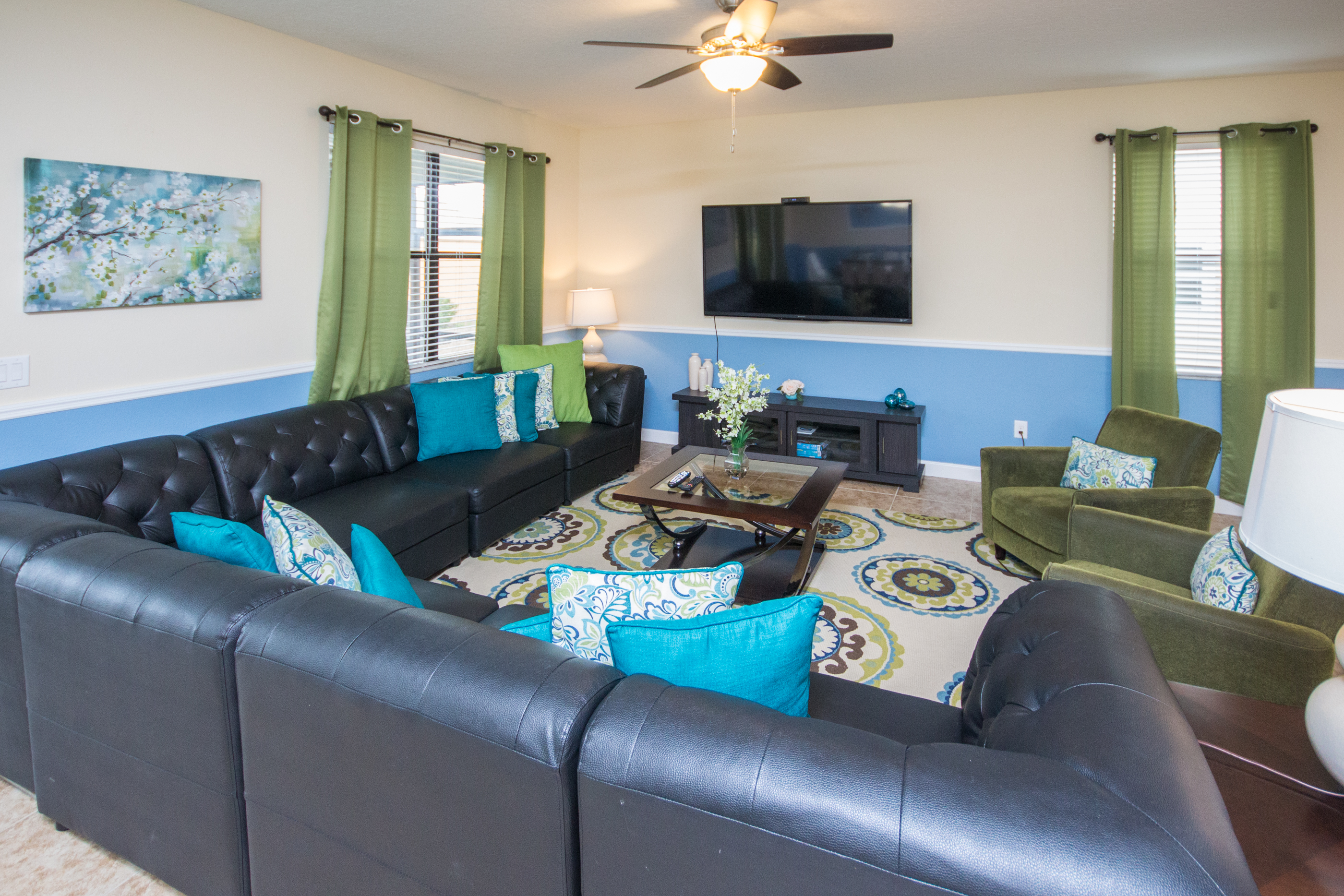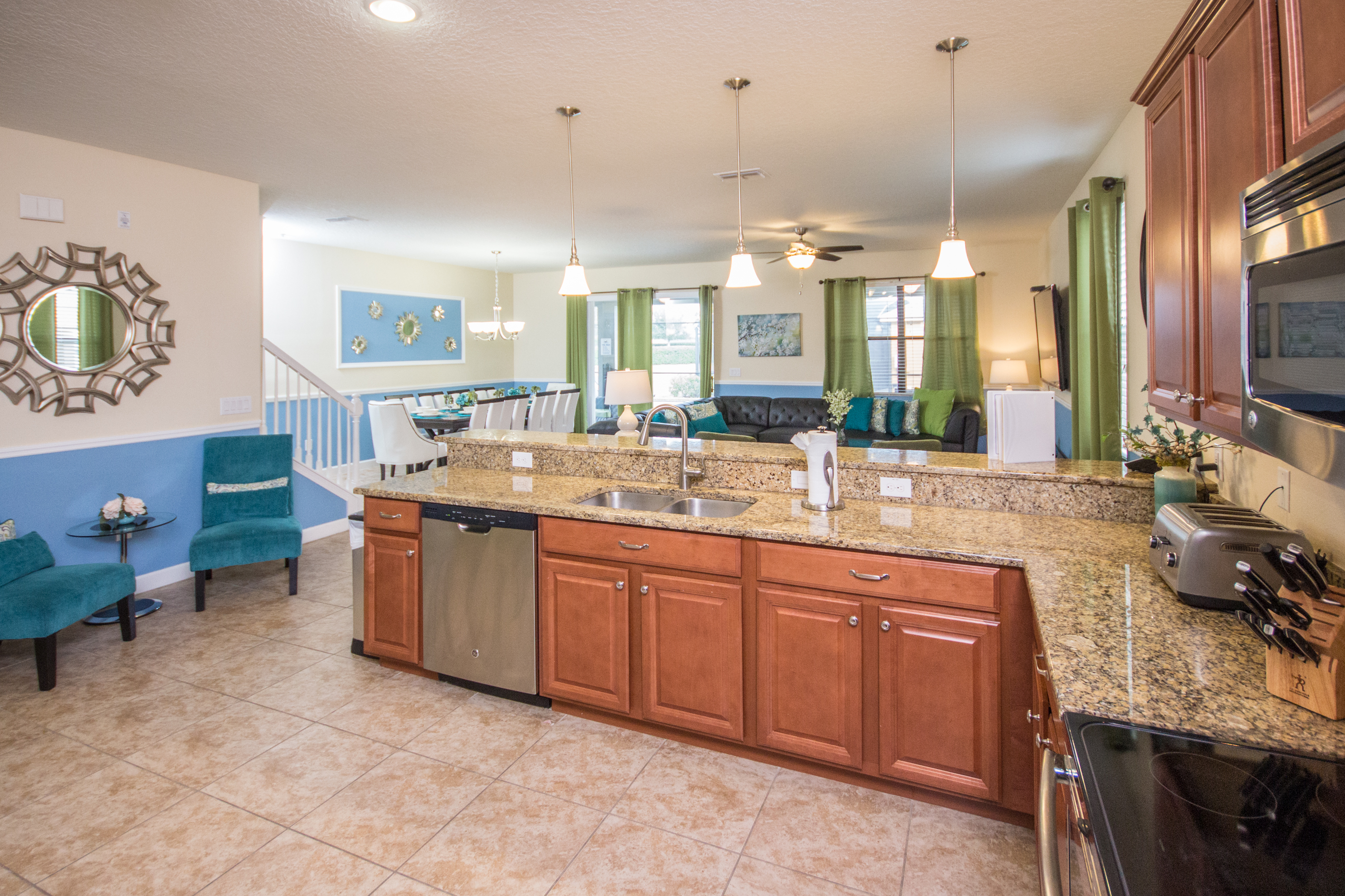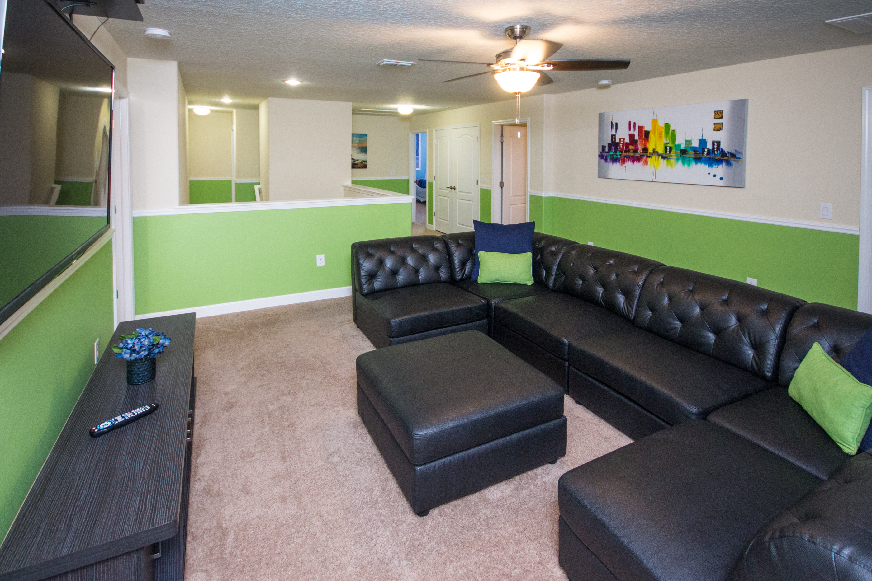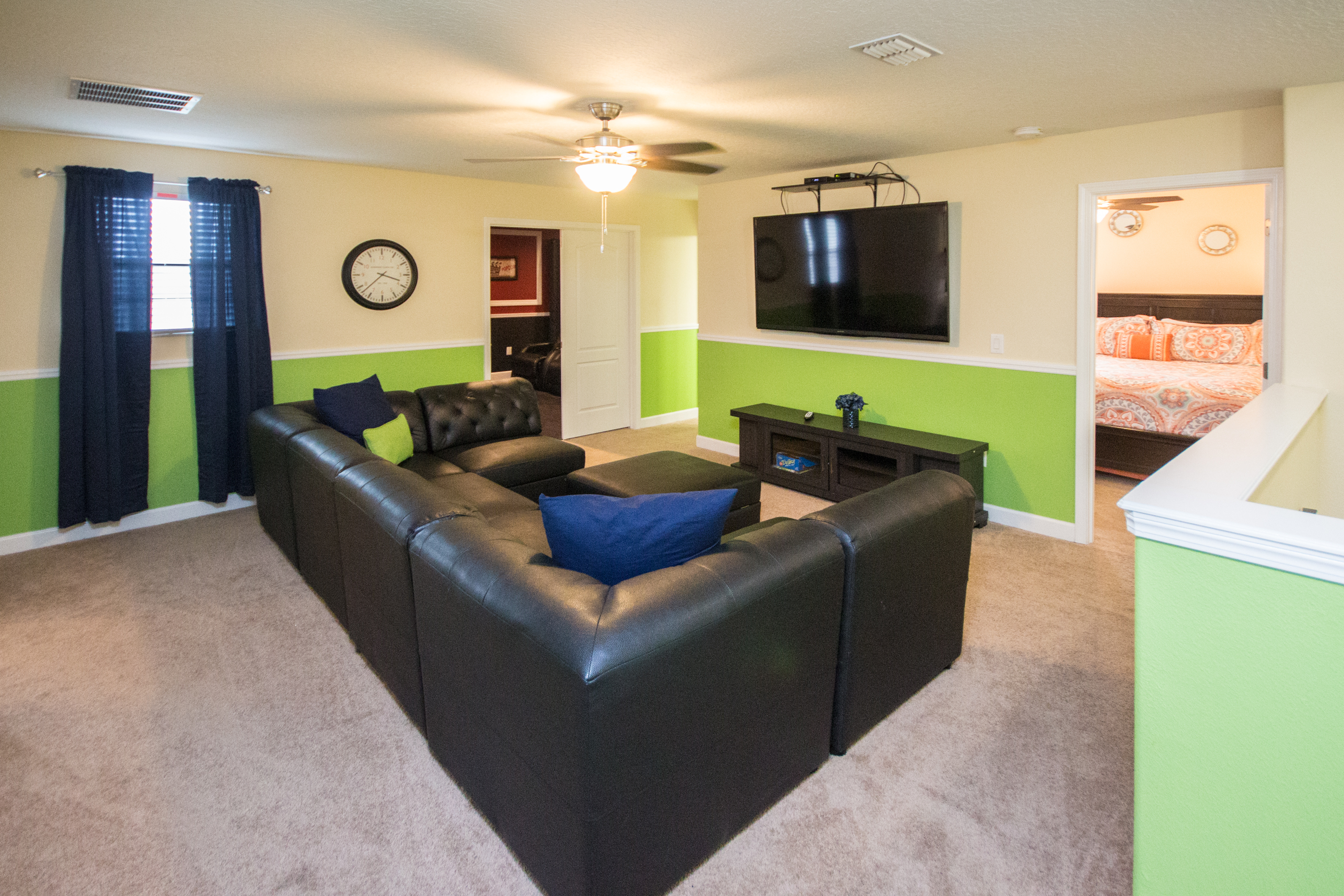 Where to start? Let’s go with the kitchen. It’s awesome! It’s L-shaped, has stainless steel appliances, granite countertops, comes fully equipped, and has a large breakfast bar with seating for up to five people. If seating for five isn’t enough, there’s a formal dining table that has seating for ten people. This is the perfect place for everyone to gather around and have something to eat. Just off of the dining room is the living area. It’s large! It has a big L-shaped sectional, two comfortable arm chairs, and a large flat screen TV mounted to the wall. This is the ideal place for everyone to relax and watch a movie together after a long day out at the parks. If one living area won’t do it, there’s a second living area upstairs. It has a L-shaped leather sectional and a flat screen TV mounted to the wall.