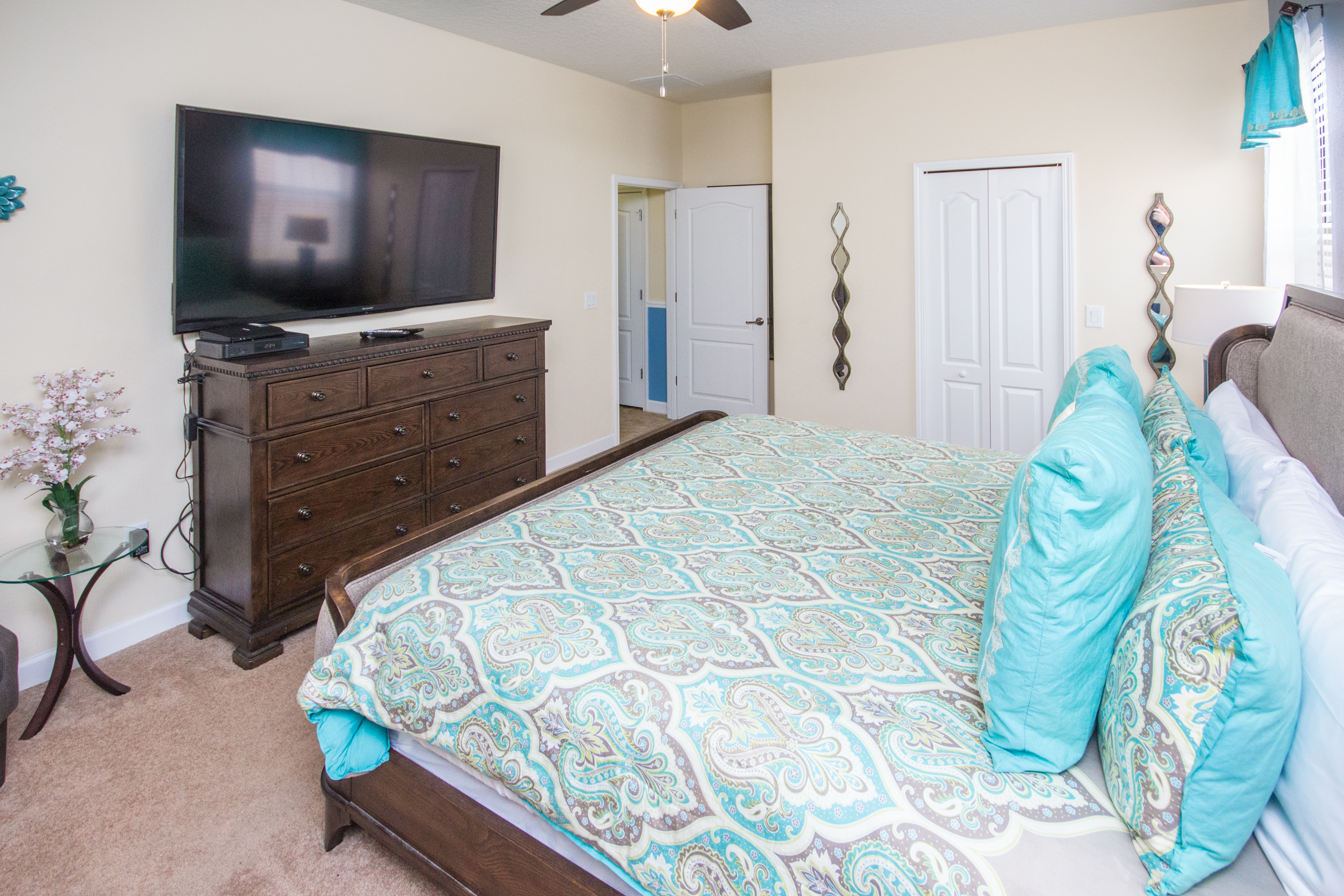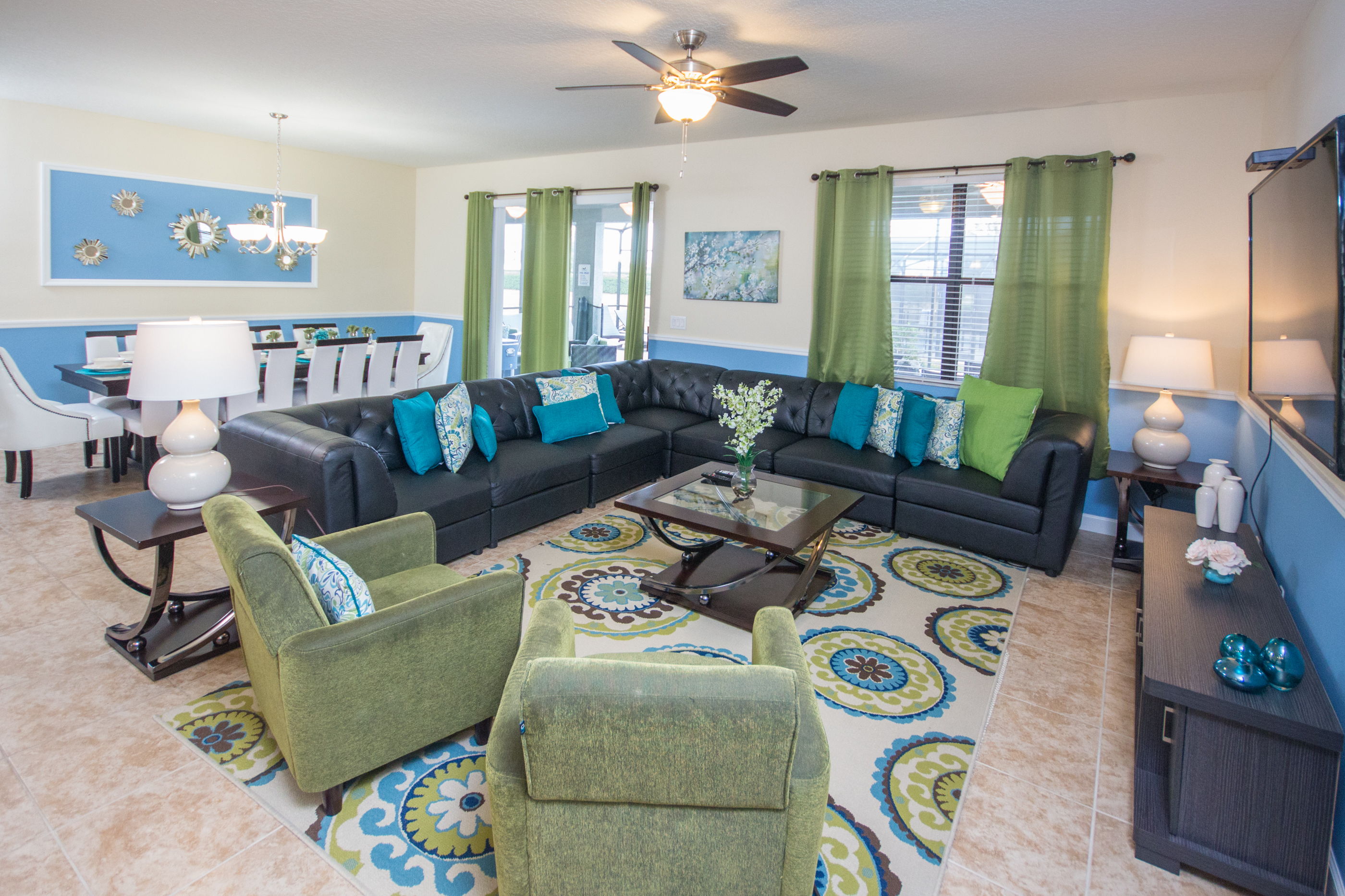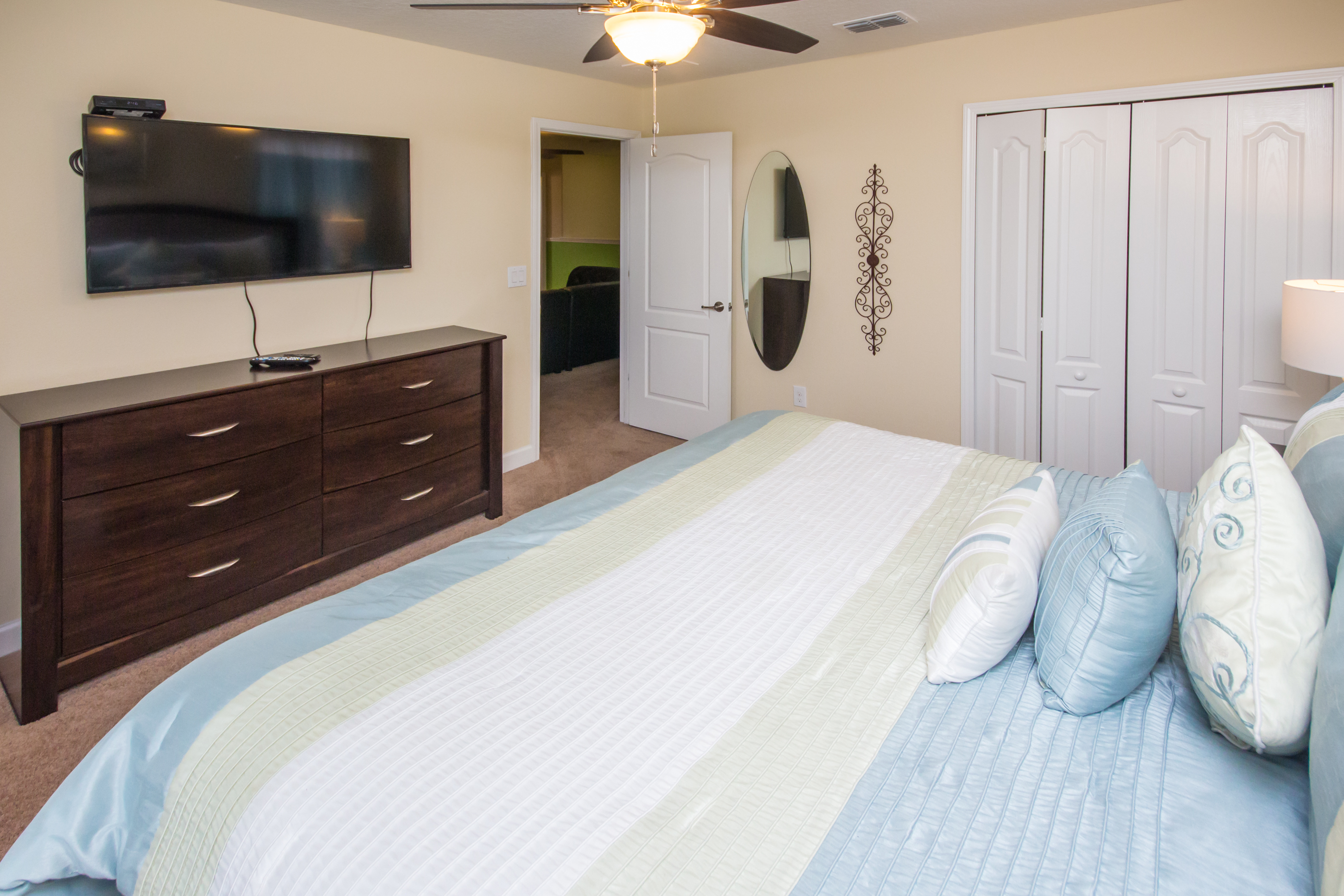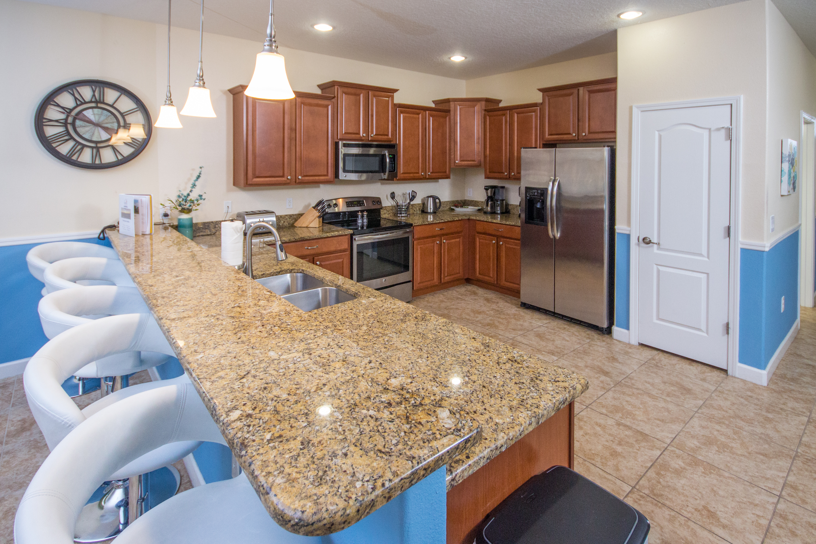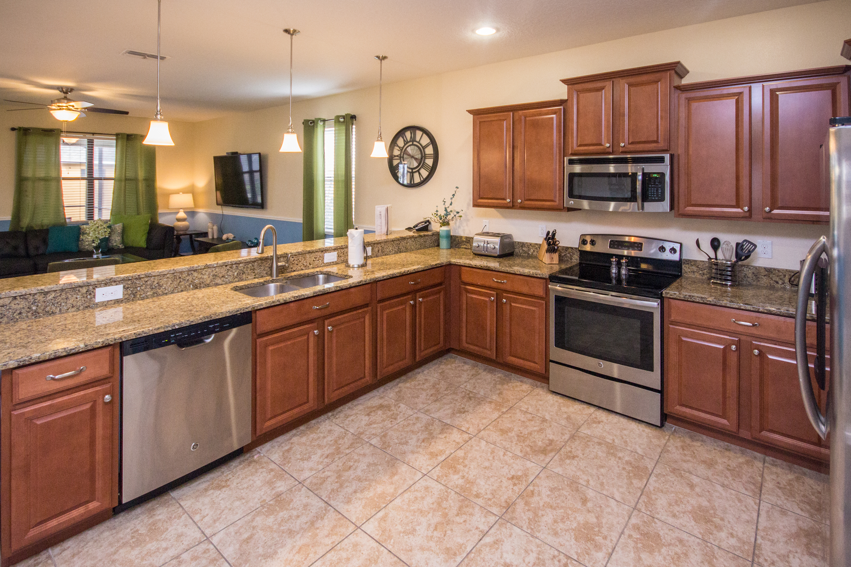 Where to start? Let’s go with the kitchen. It’s awesome! It’s L-shaped, has stainless steel appliances, granite countertops, comes fully equipped, and has a large breakfast bar with seating for up to five people. If seating for five isn’t enough, there’s a formal dining table that has seating for ten people. This is the perfect place for everyone to gather around and have something to eat. Just off of the dining room is the living area. It’s large! It has a big L-shaped sectional, two comfortable arm chairs, and a large flat screen TV mounted to the wall. This is the ideal place for everyone to relax and watch a movie together after a long day out at the parks. If one living area won’t do it, there’s a second living area upstairs. It has a L-shaped leather sectional and a flat screen TV mounted to the wall.