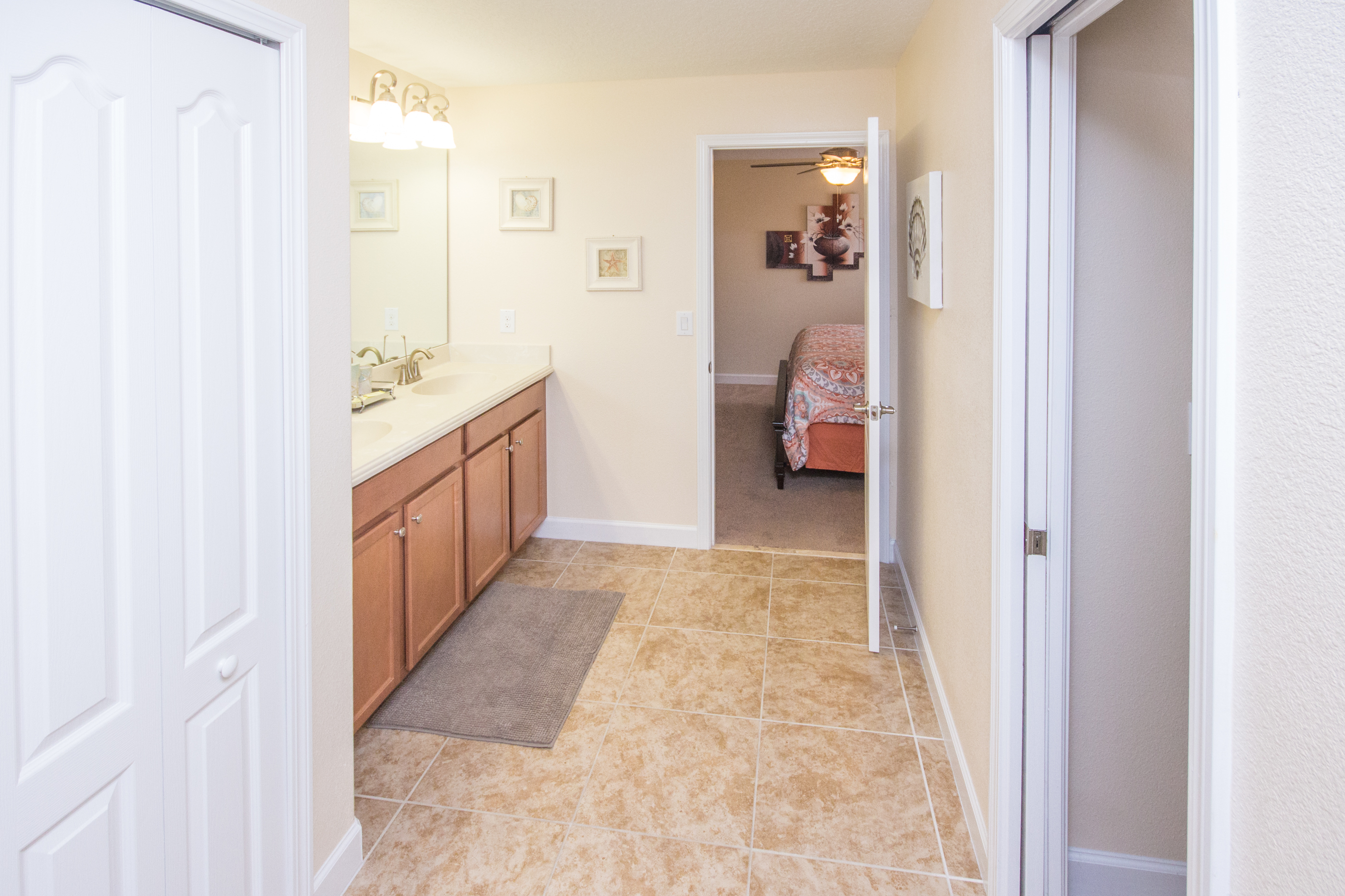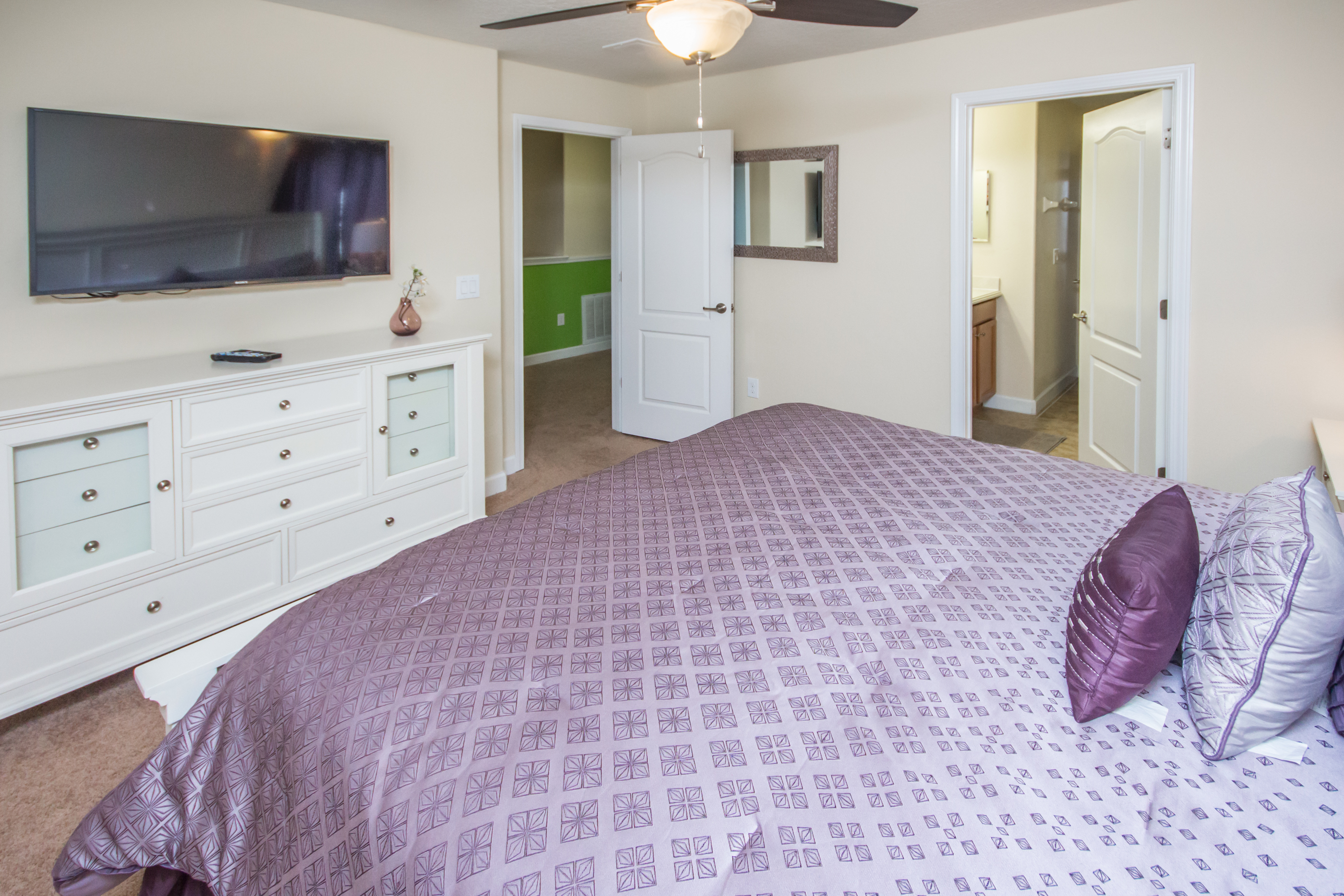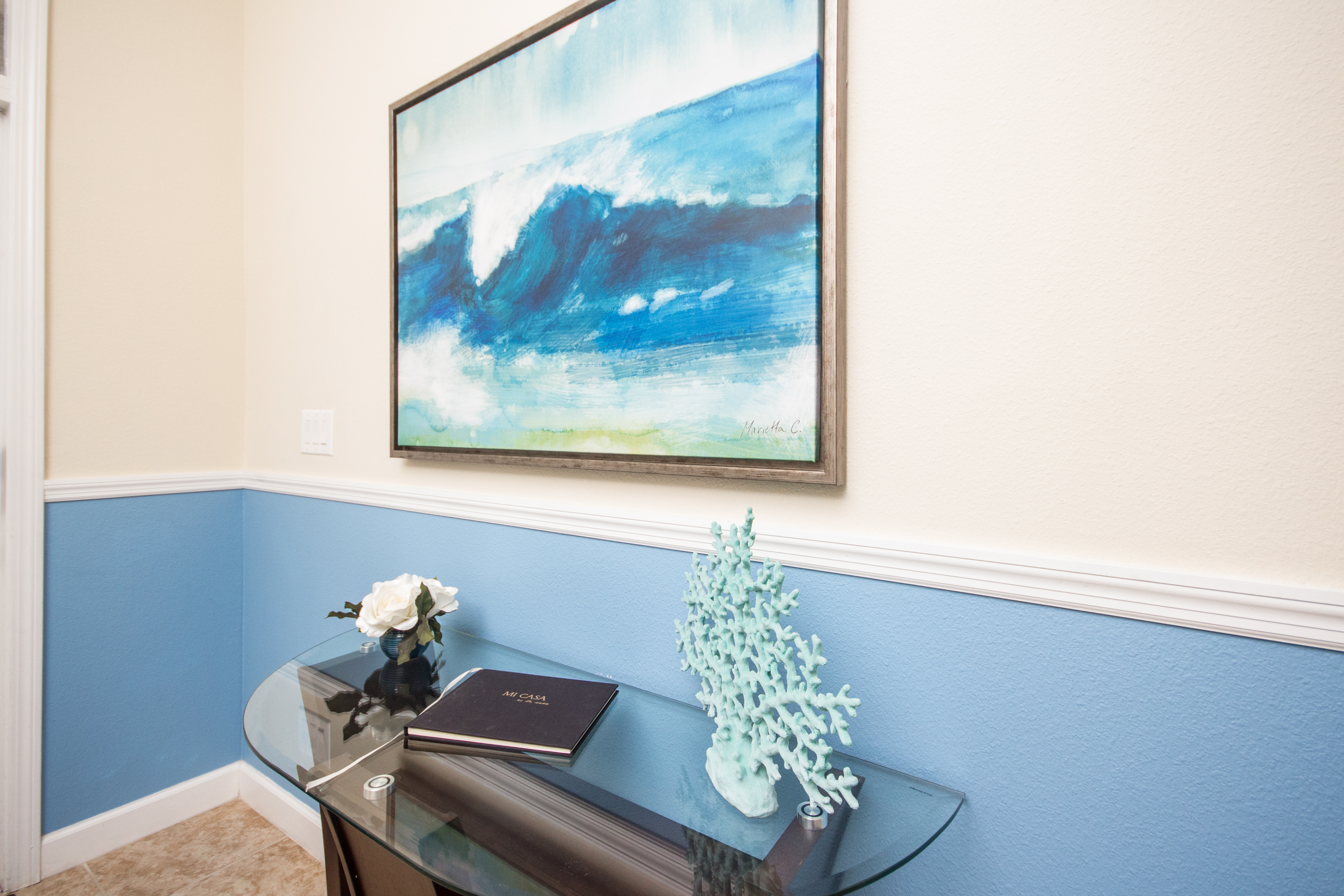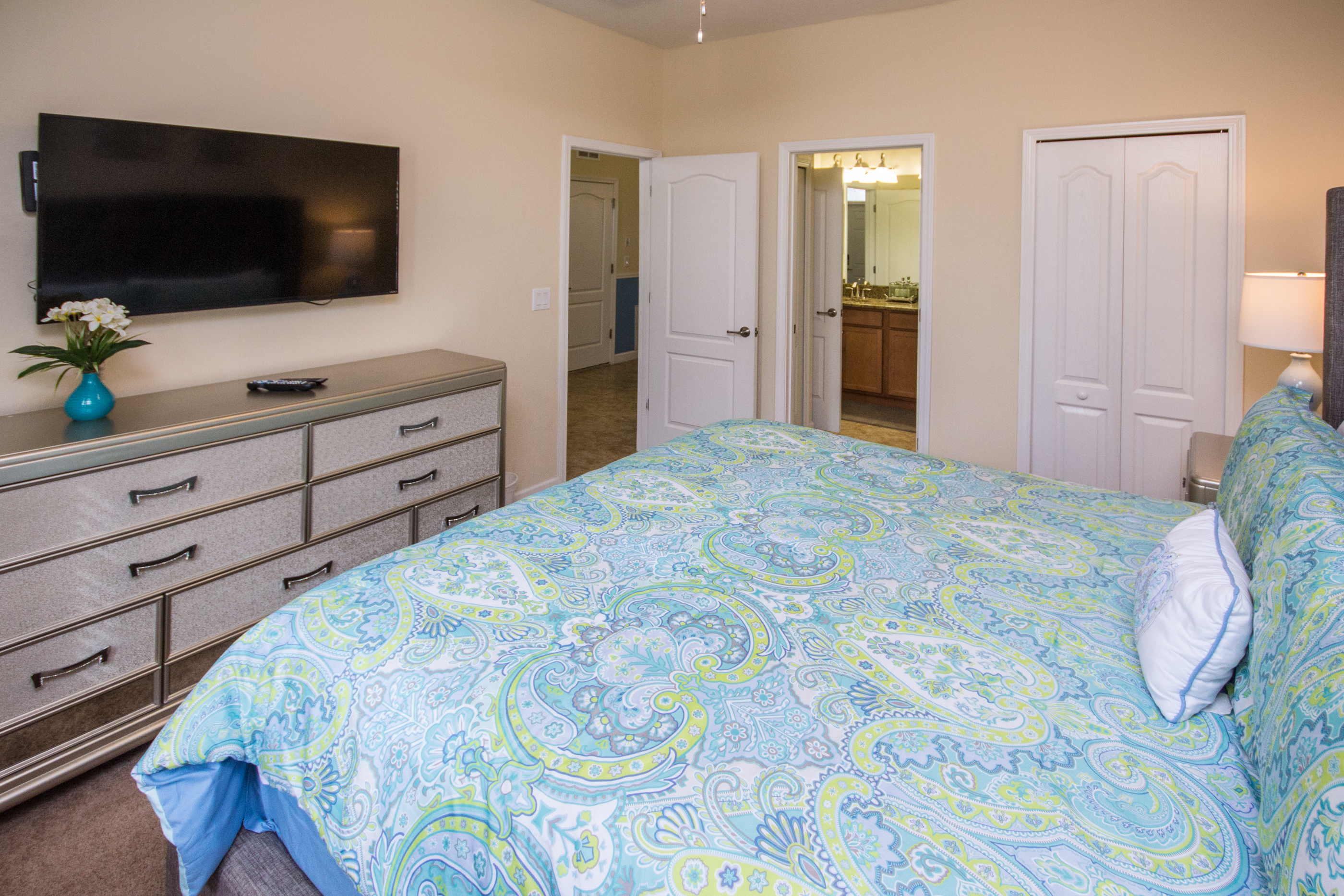 Where to start? Let’s go with the kitchen. It’s awesome! It’s L-shaped, has stainless steel appliances, granite countertops, comes fully equipped, and has a large breakfast bar with seating for up to five people. If seating for five isn’t enough, there’s a formal dining table that has seating for ten people. This is the perfect place for everyone to gather around and have something to eat. Just off of the dining room is the living area. It’s large! It has a big L-shaped sectional, two comfortable arm chairs, and a large flat screen TV mounted to the wall. This is the ideal place for everyone to relax and watch a movie together after a long day out at the parks. If one living area won’t do it, there’s a second living area upstairs. It has a L-shaped leather sectional and a flat screen TV mounted to the wall.