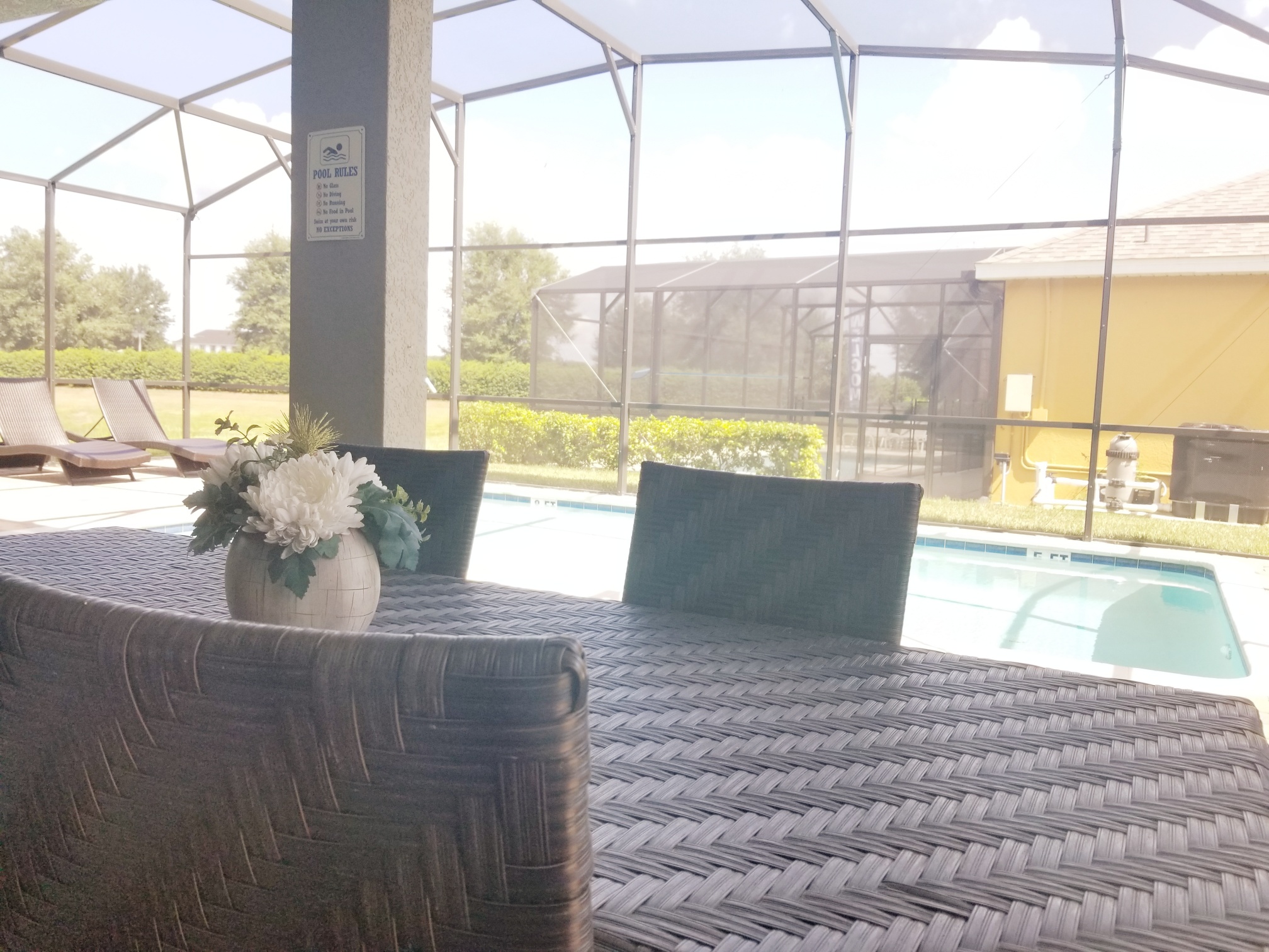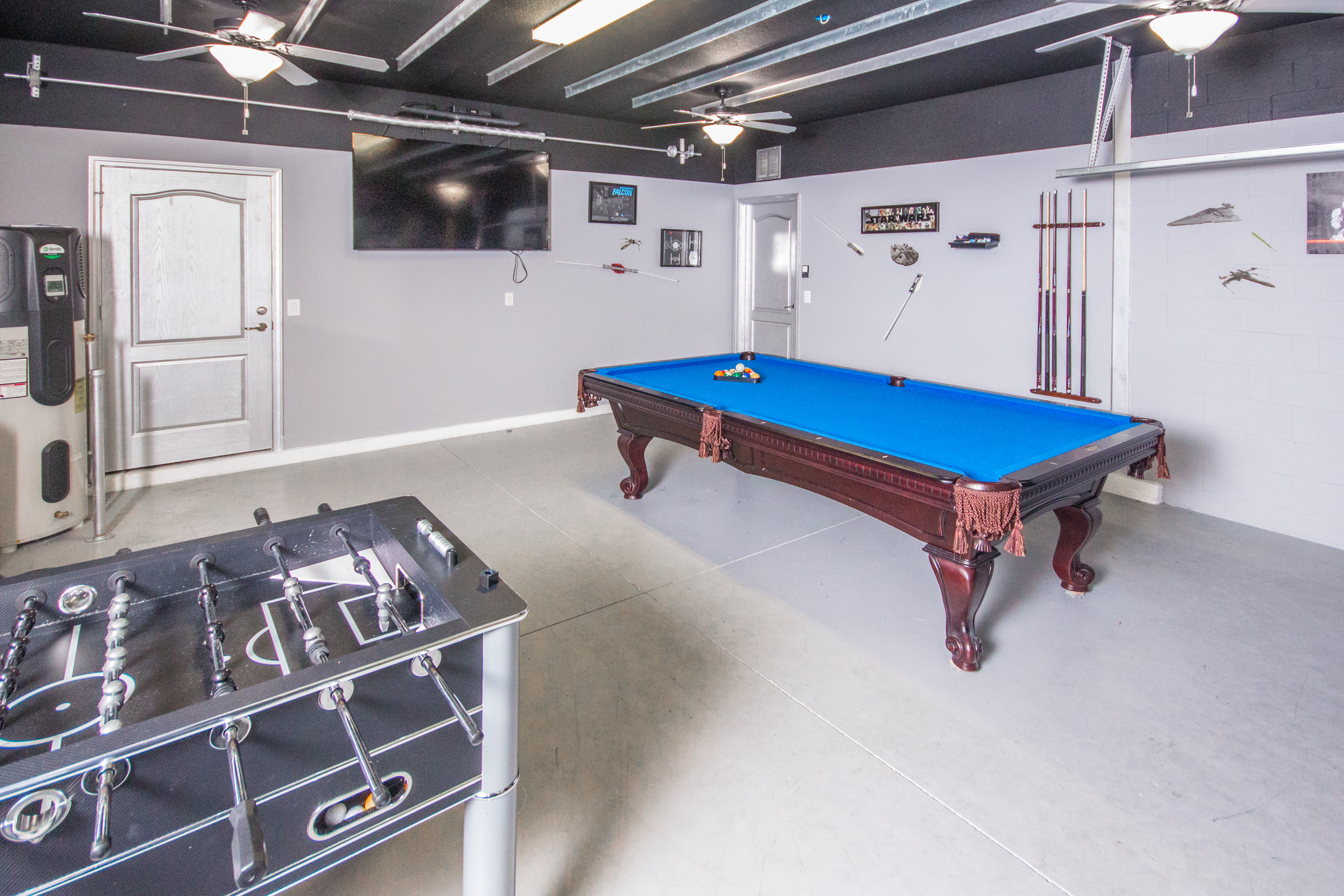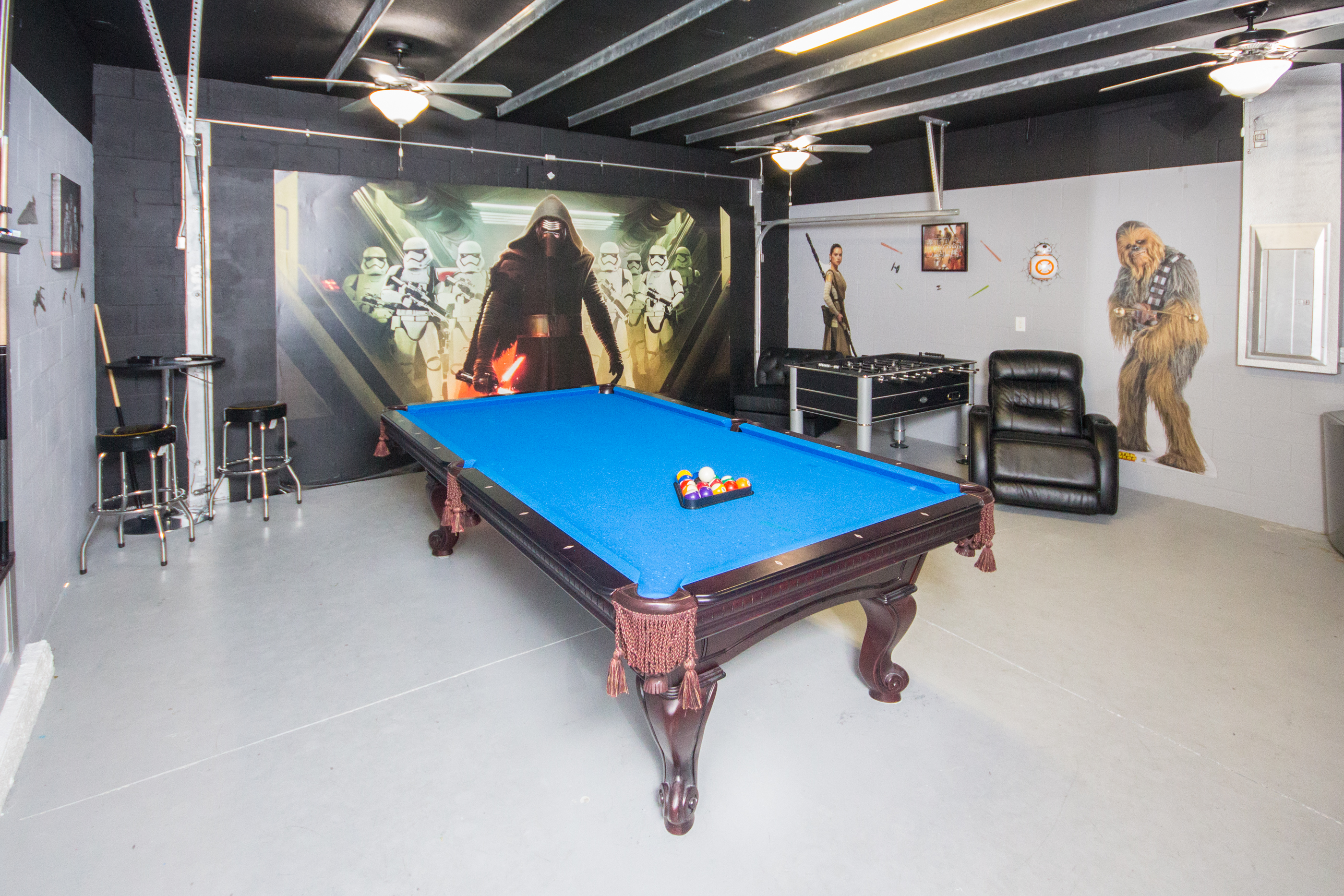 The two best parts of the house? The pool and games room. The Star Wars themed games room is in the converted garage and has a foosball table and a pool table. If you’d rather be outside, there’s a nice-size pool at the back. The pool area is screened in to keep out those pesky Florida bugs. There are sun loungers for those who want to work on their tan, and there’s a covered lanai with wicker furniture to sit on under it.