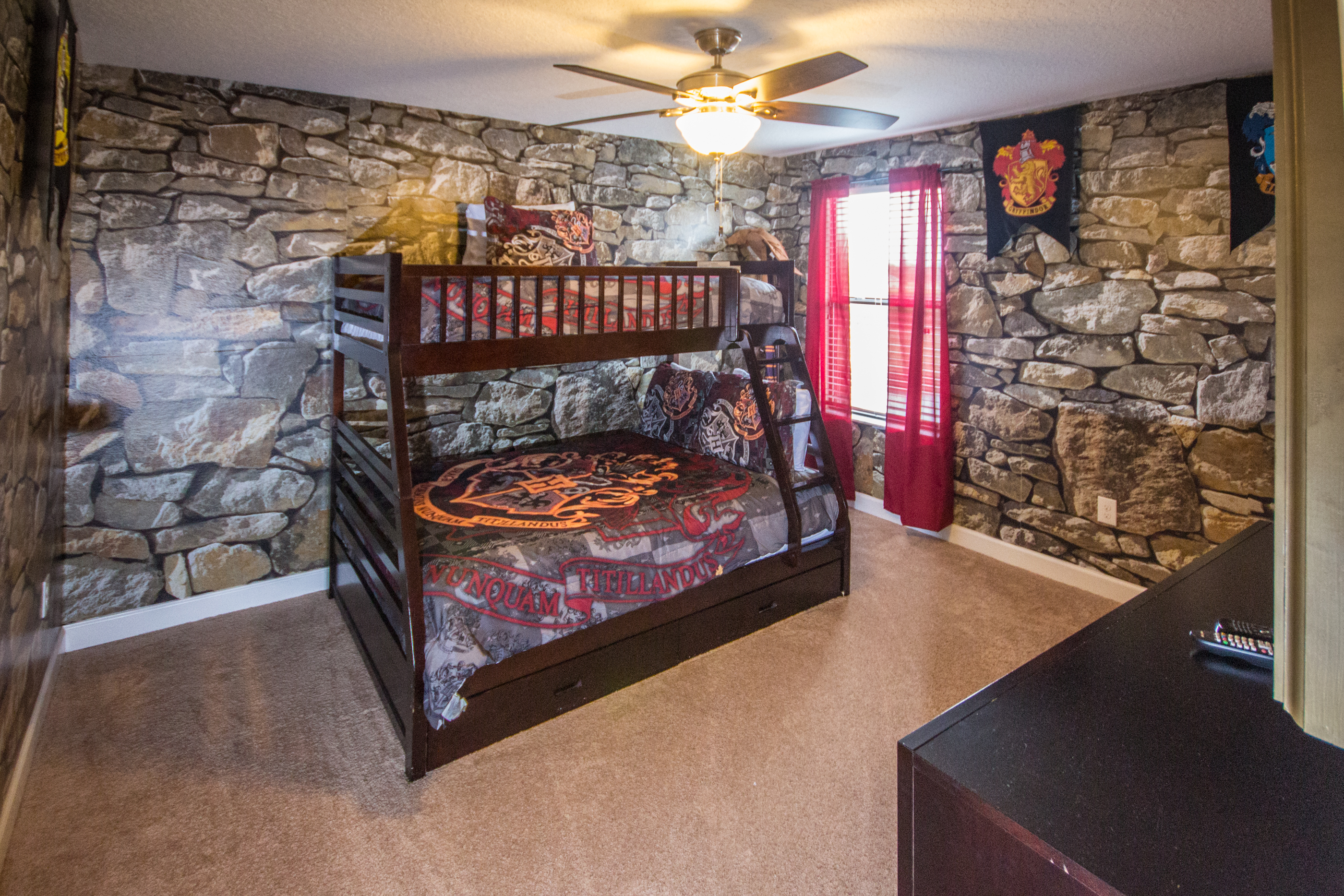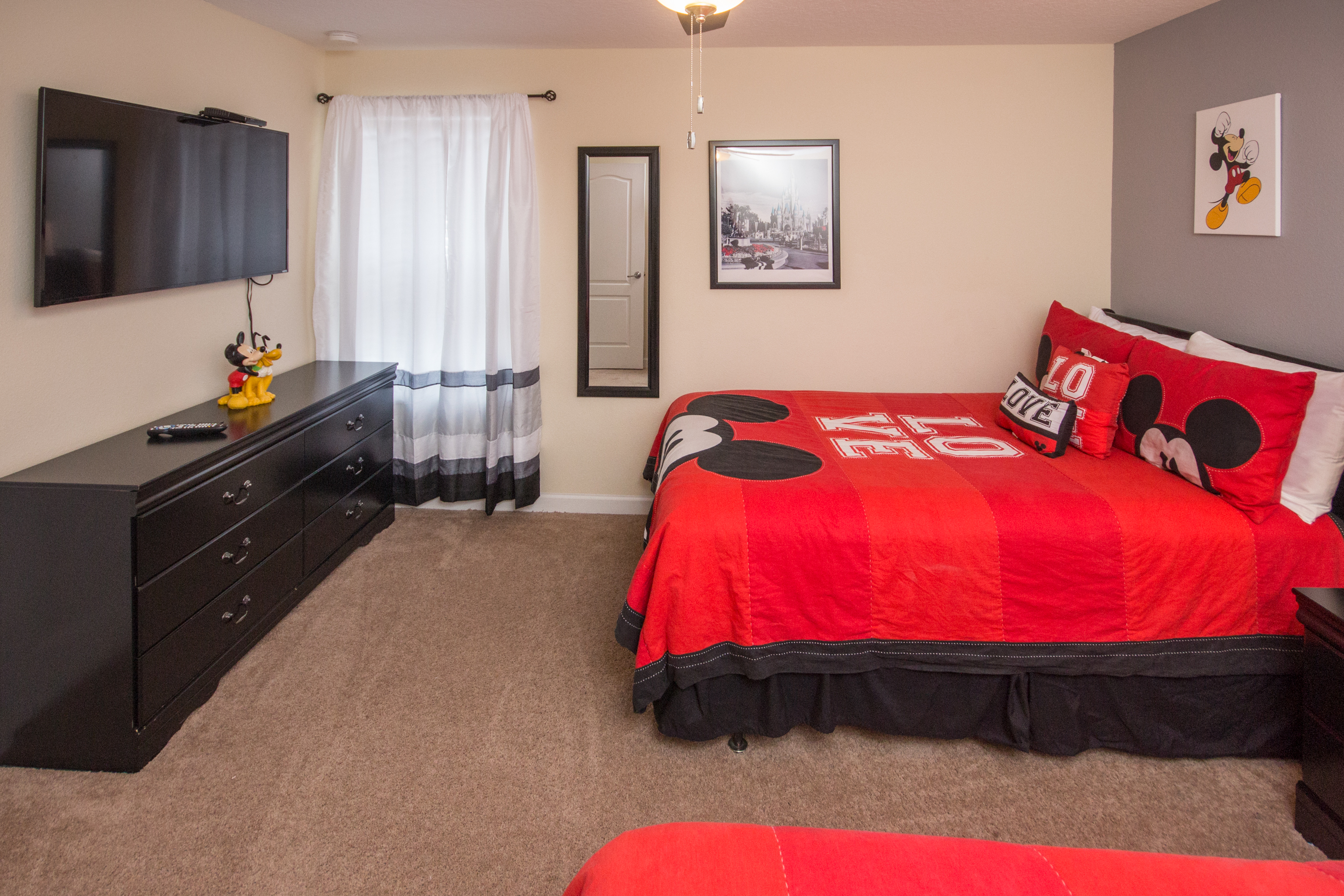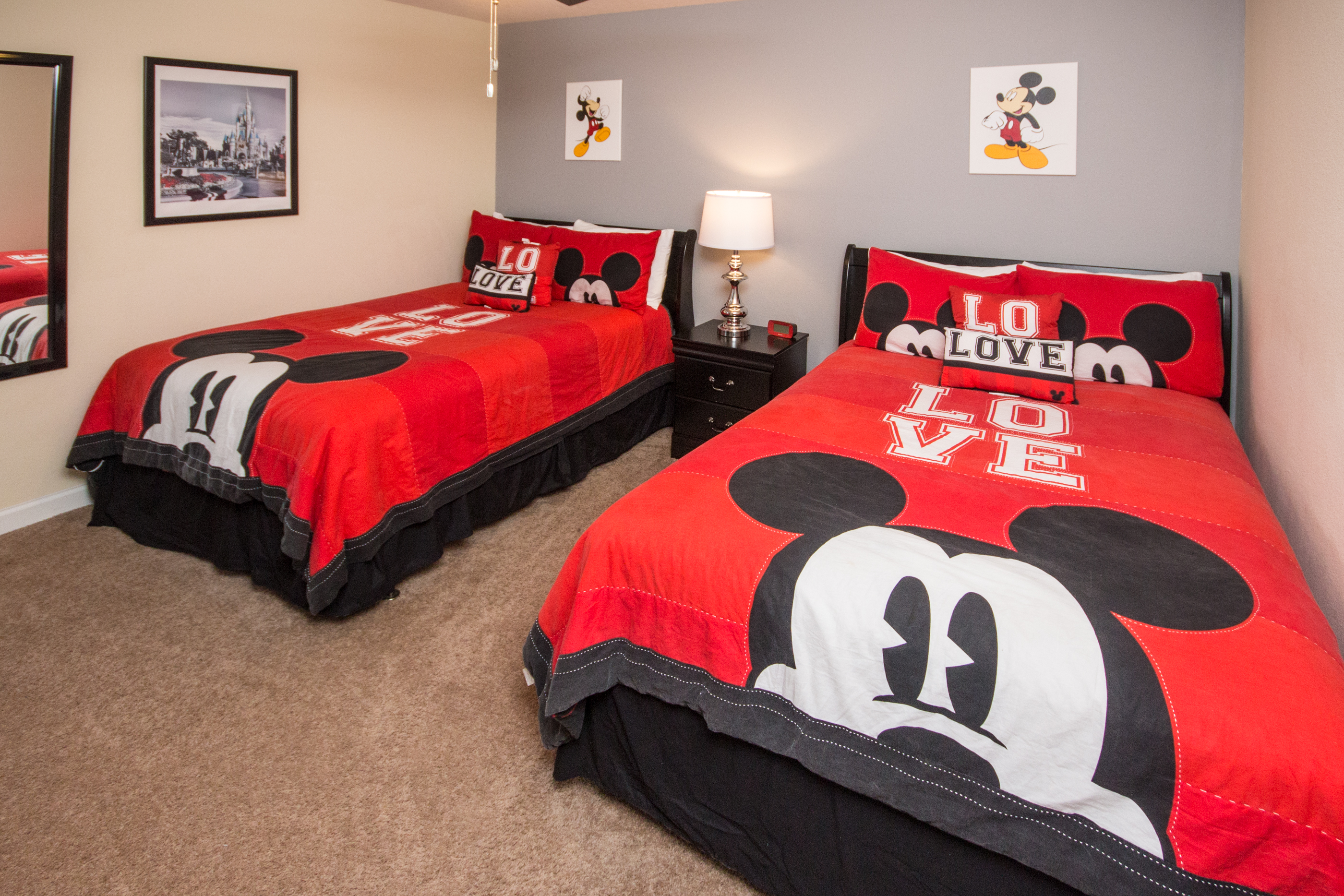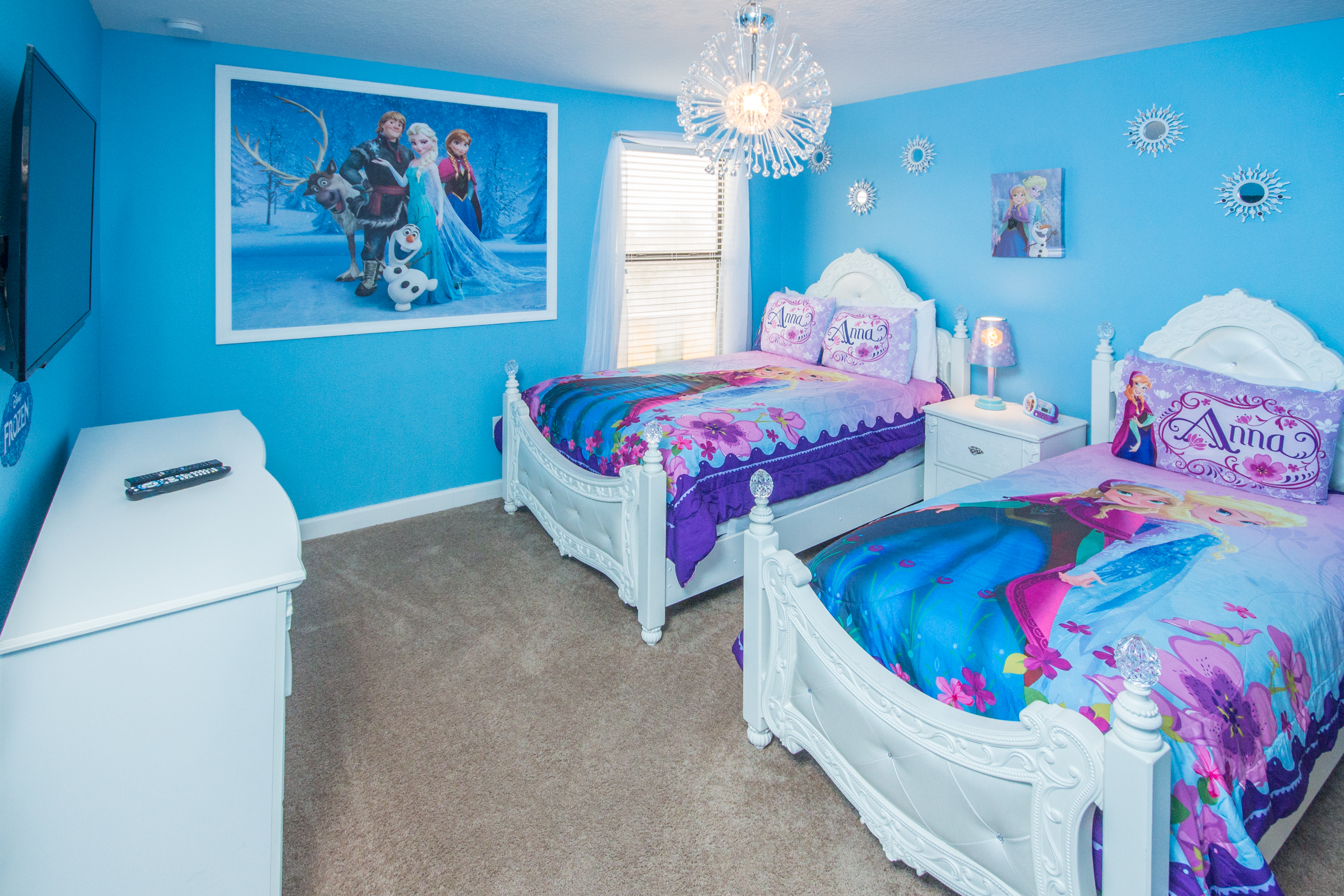 There are 8 bedrooms. Four bedrooms have a king-size bed, a flat screen TV, and an en-suite bathroom. The 5th bedroom also has a king-size bed and flat screen TV, but it does not have an en-suite. Harry Potter fan? You’ll love the 6th bedroom. It has been decorated superbly in a Harry Potter theme. It has bunk beds with a single on the top and a full size on the bottom. It also has its own TV. Mickey Mouse fan? Try out the Mickey Mouse themed bedroom, which has two single beds and, of course, a flat screen TV. If Disney’s Frozen is more your style, there is one final room that has been decorated to the theme of Frozen. It has two single beds and a flat screen TV mounted to the wall.