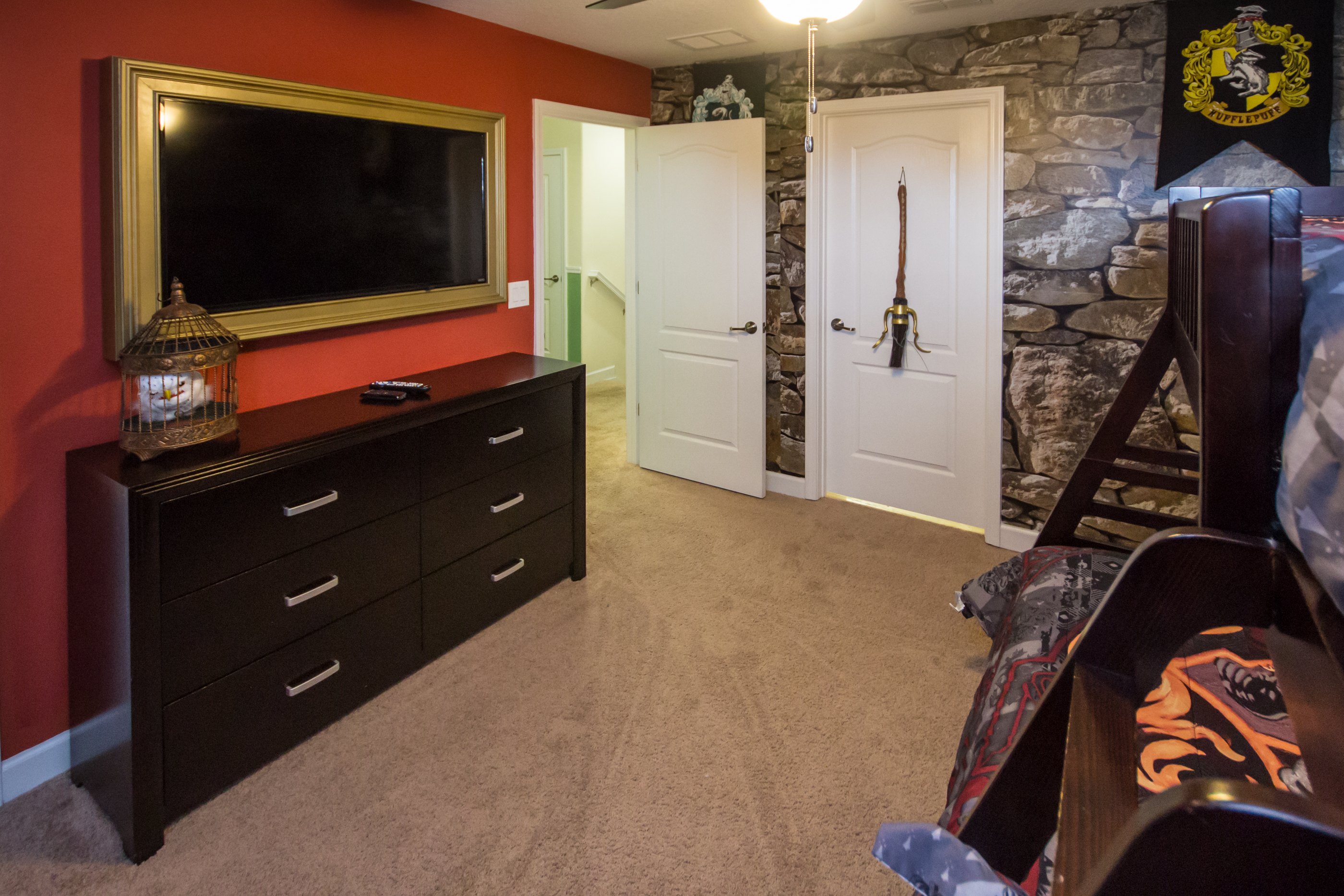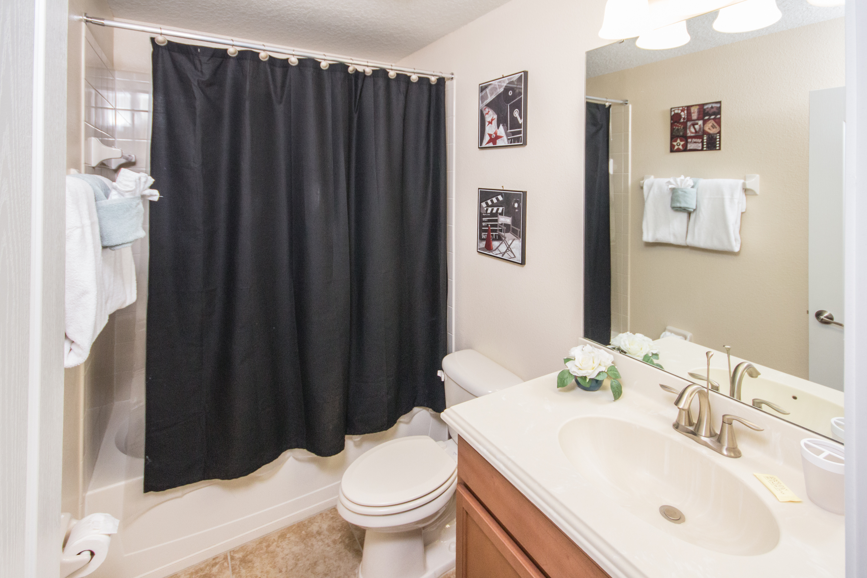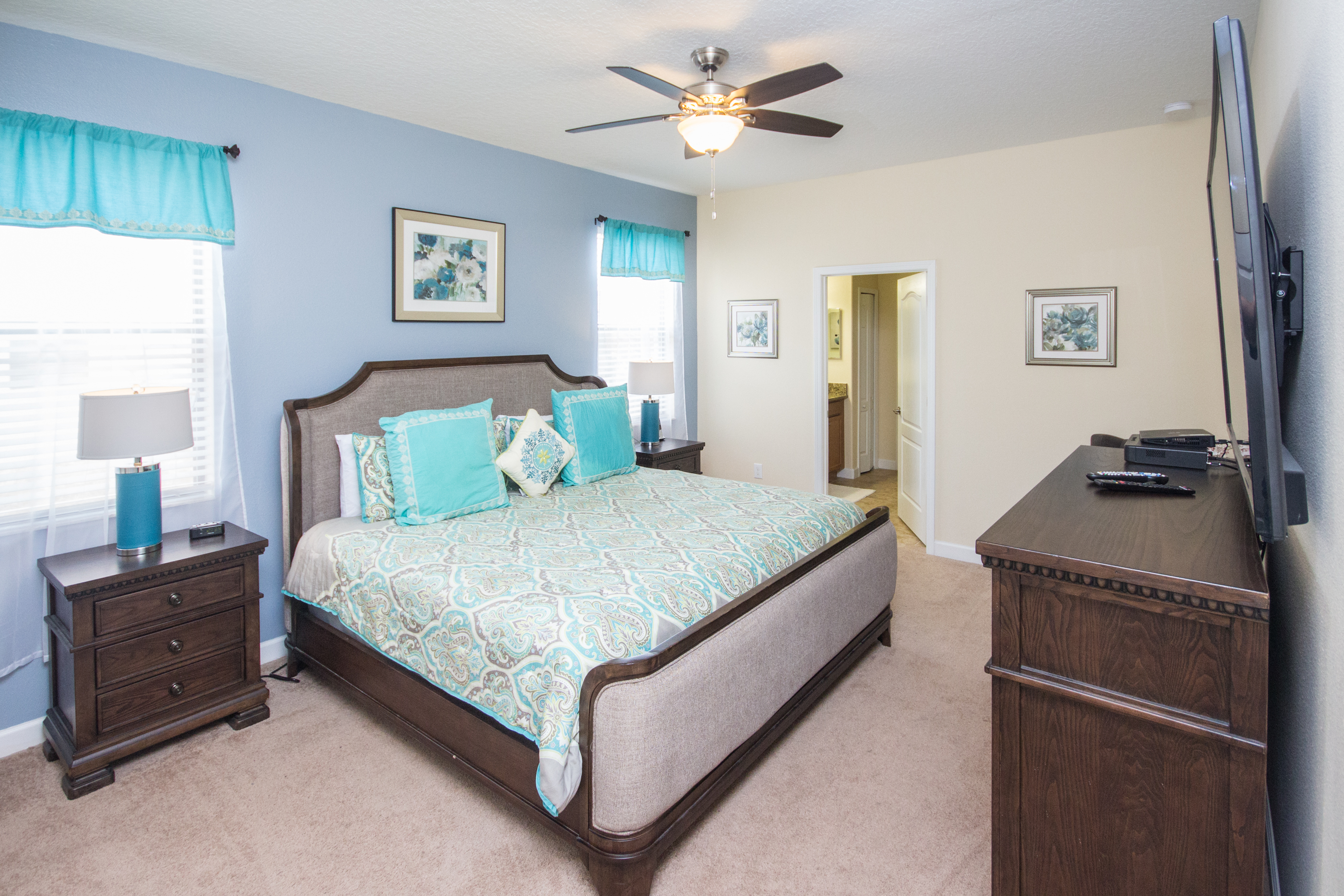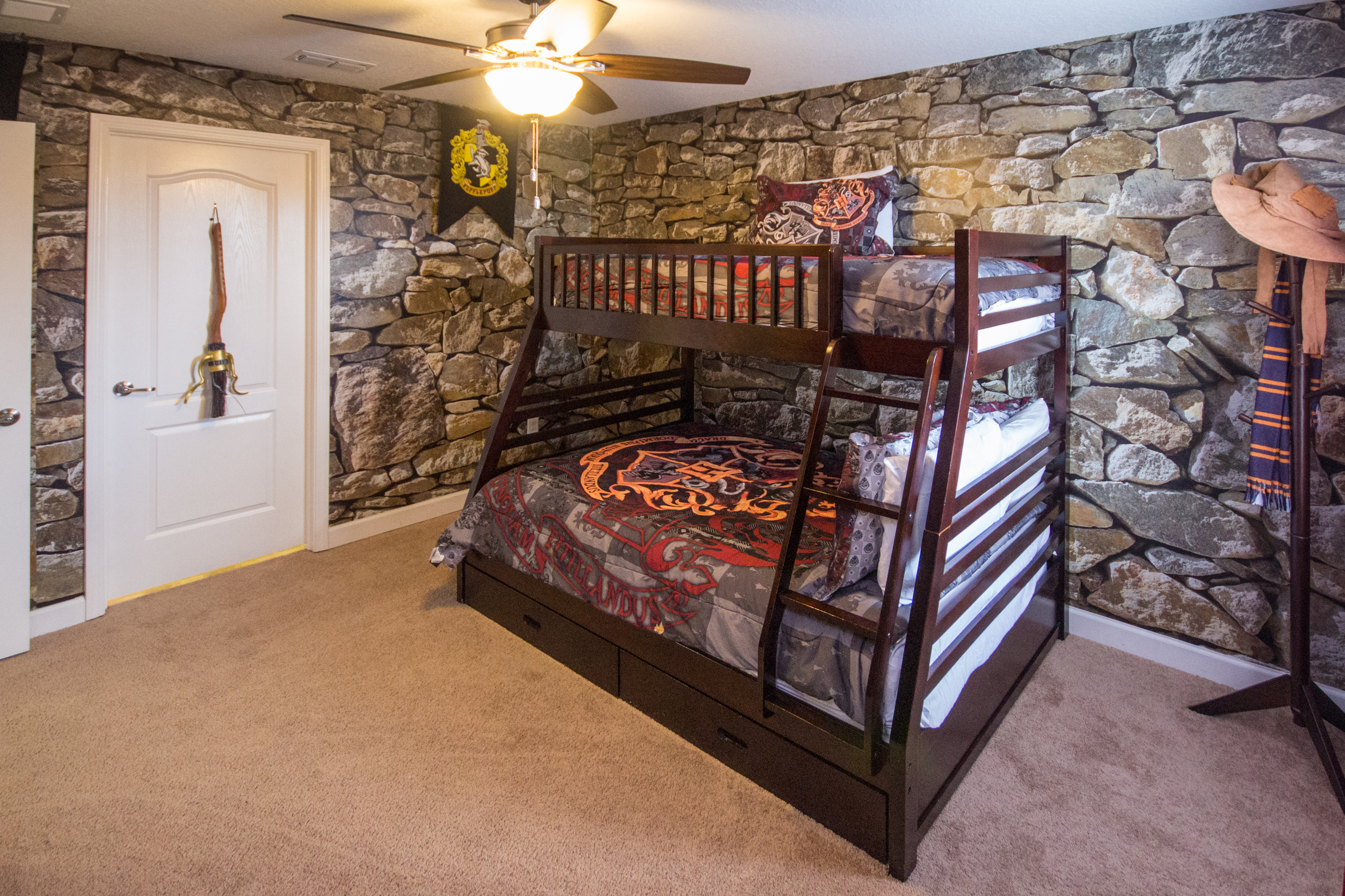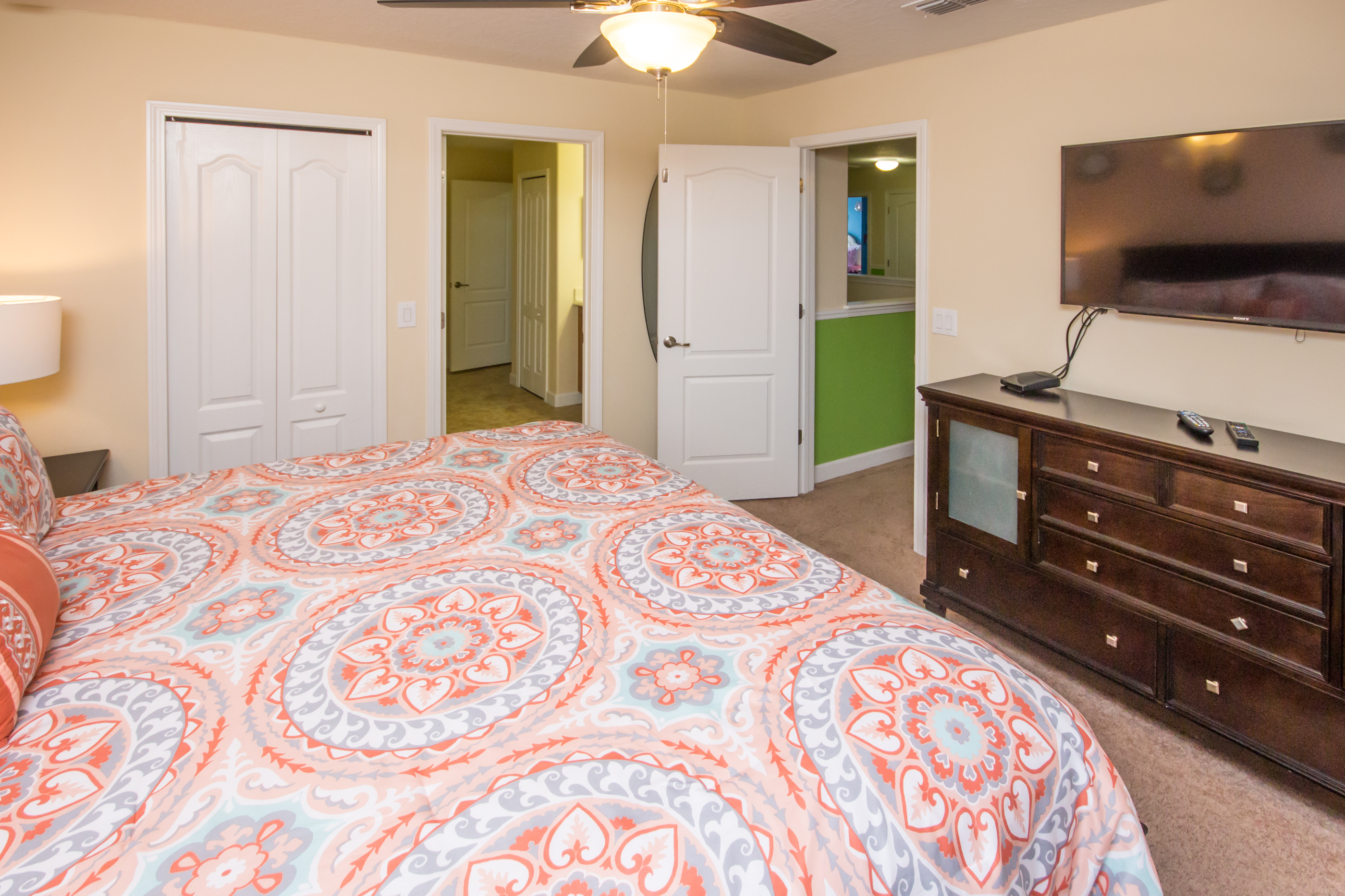 There are 8 bedrooms. Four bedrooms have a king-size bed, a flat screen TV, and an en-suite bathroom. The 5th bedroom also has a king-size bed and flat screen TV, but it does not have an en-suite. Harry Potter fan? You’ll love the 6th bedroom. It has been decorated superbly in a Harry Potter theme. It has bunk beds with a single on the top and a full size on the bottom. It also has its own TV. Mickey Mouse fan? Try out the Mickey Mouse themed bedroom, which has two single beds and, of course, a flat screen TV. If Disney’s Frozen is more your style, there is one final room that has been decorated to the theme of Frozen. It has two single beds and a flat screen TV mounted to the wall.