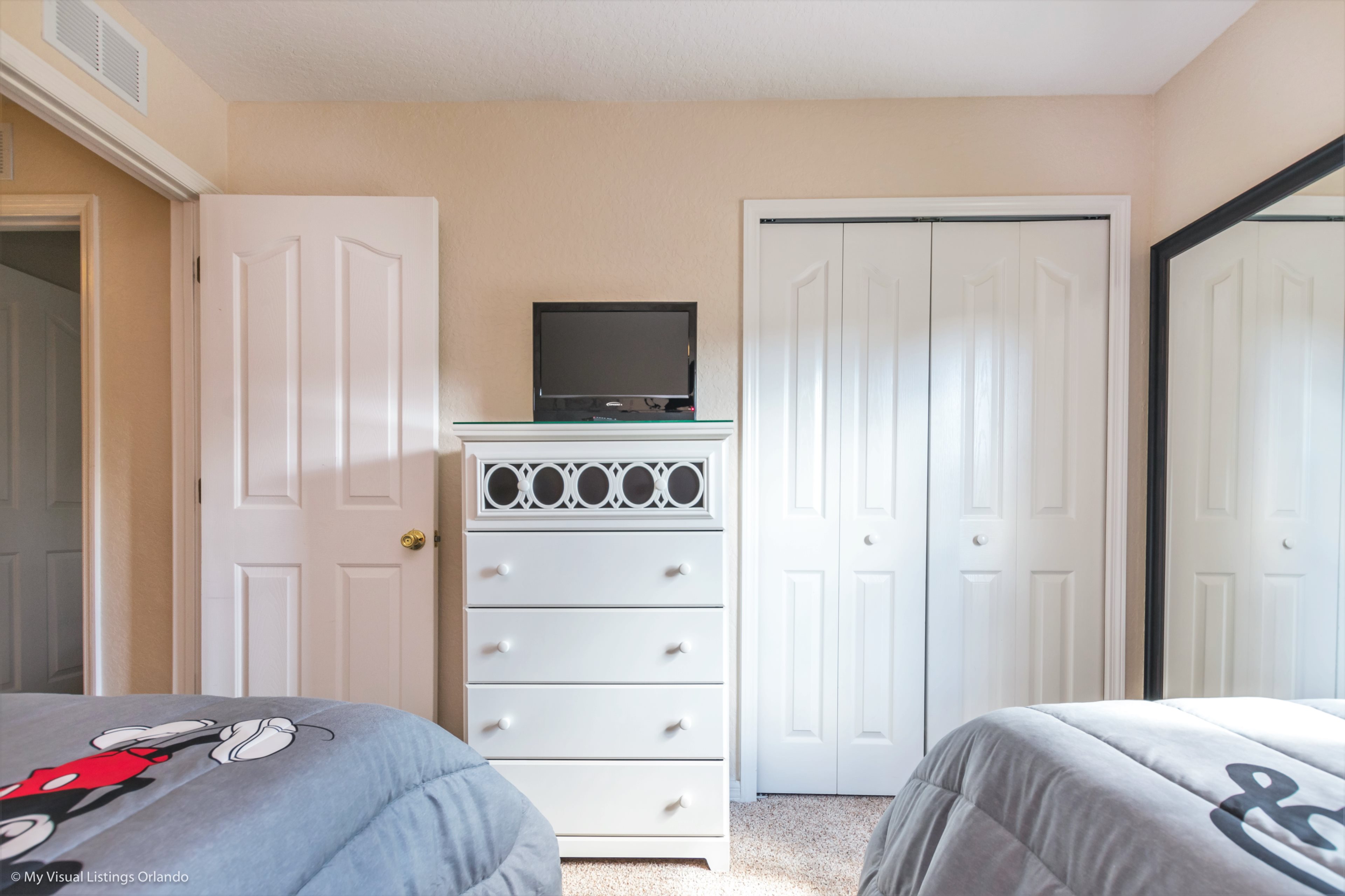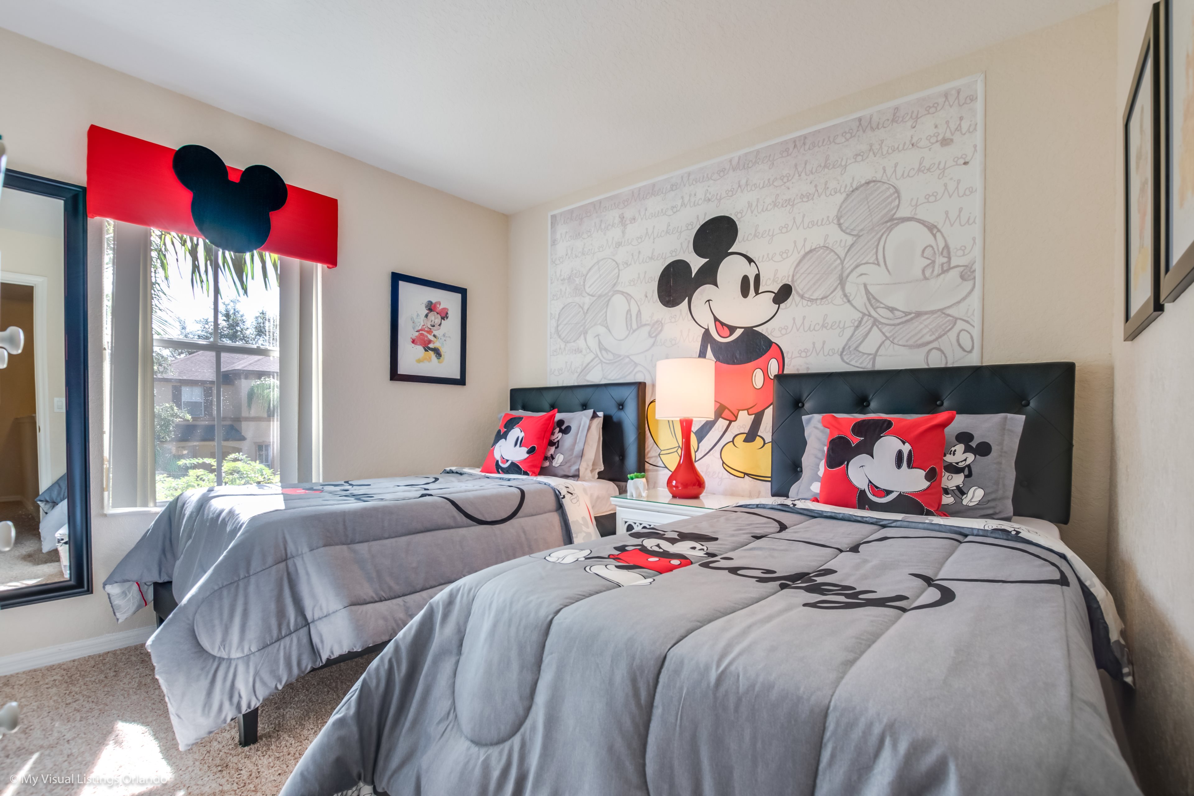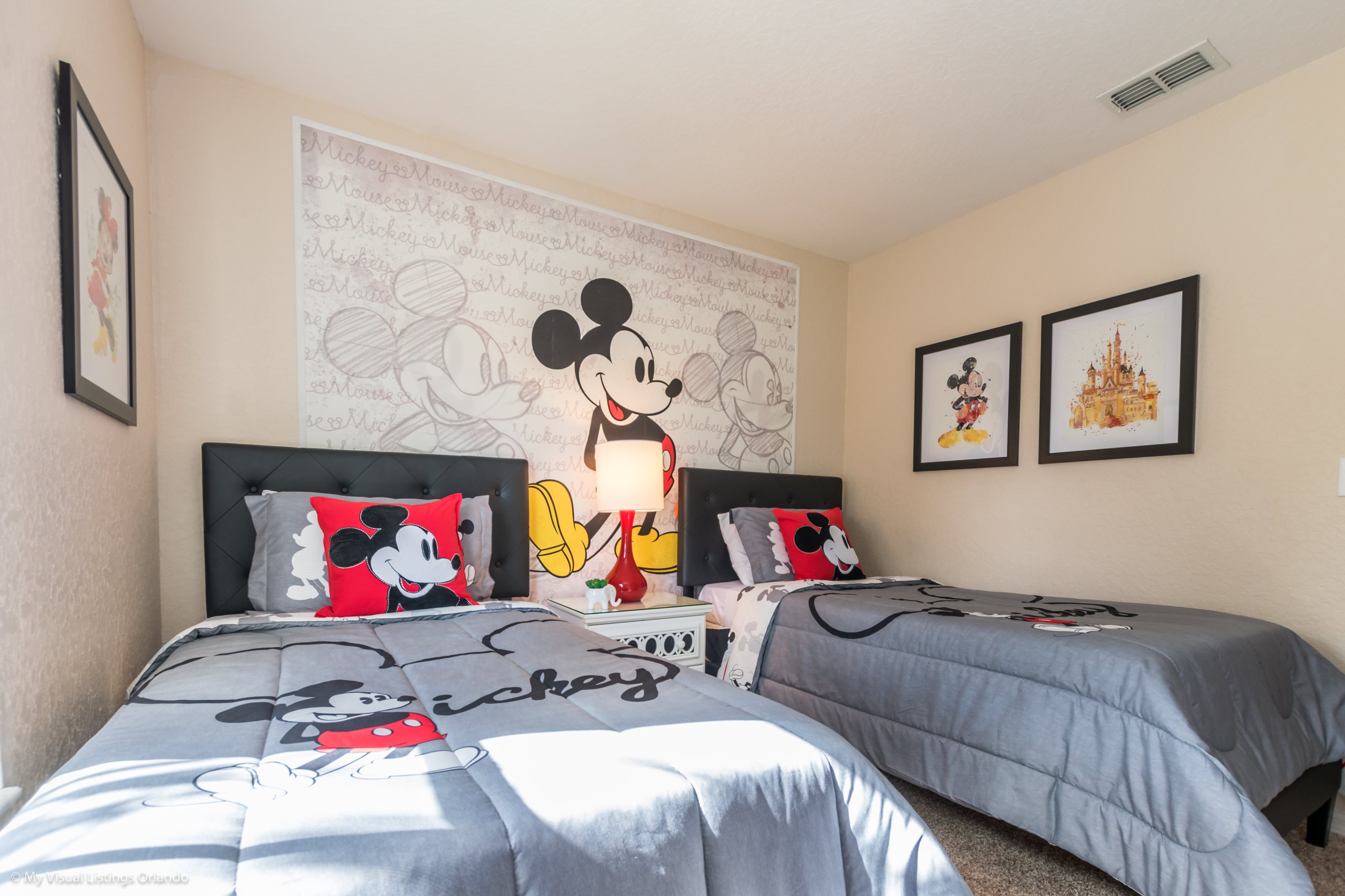 The third bedroom has a set of twins in a Mickey Mouse themed room.