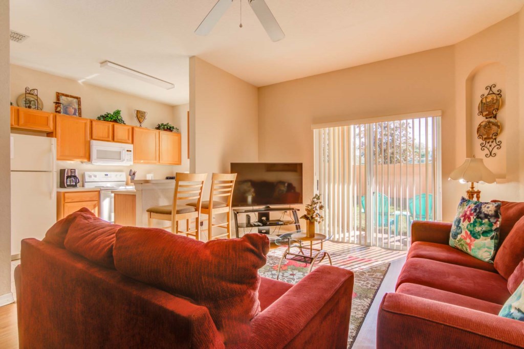 The living room has brand new furniture, which you will definitely feel comfortable enough to lounge around all day. But don't lounge too much, because you want to make sure that you have enough time to spend the day in the resort pool, lazy river and water slide. In the clubhouse, there is also a fitness center, and a spa for those of you that want to sneak away for a massage or facial.