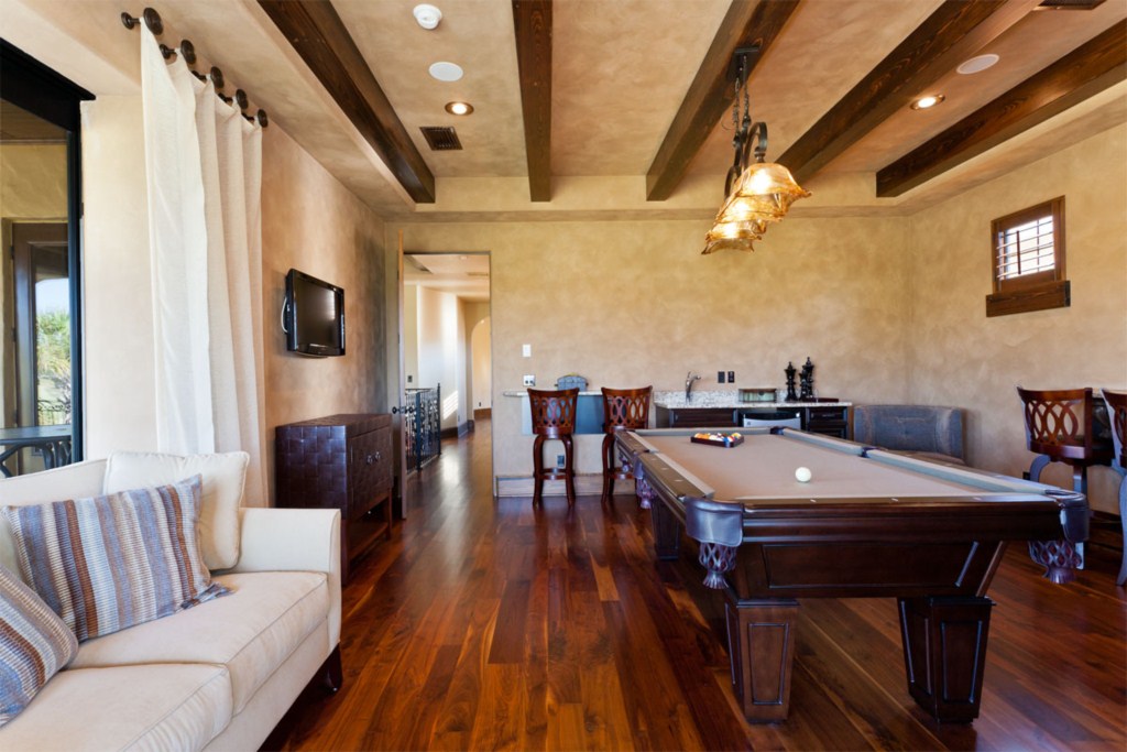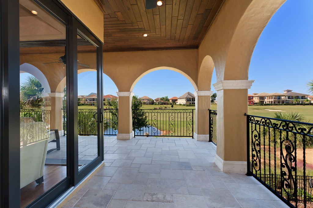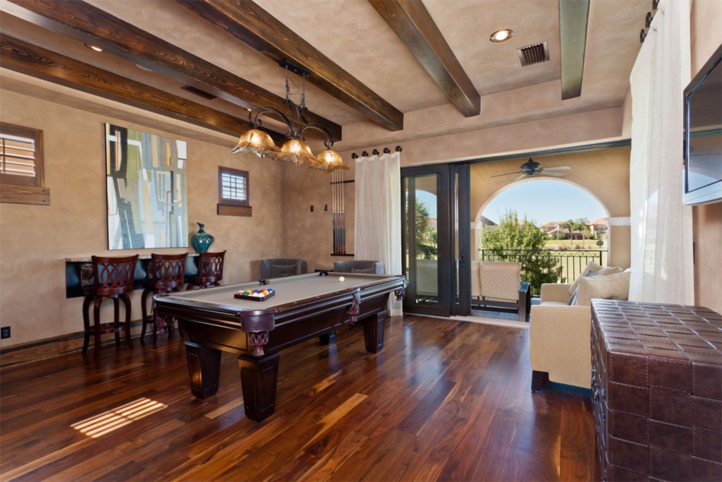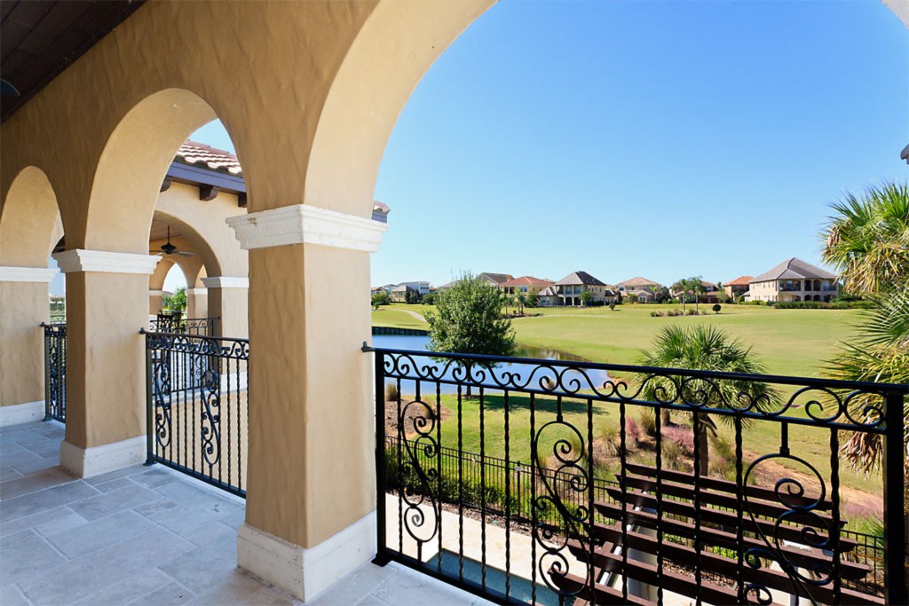 Upstairs to the front are two more bedroom suites, the first having two full size beds and the second with a queen bed. Both these rooms have a bathroom ensuite, fitted closet, flat screen TV's and offer access onto the front balcony. o the rear of the house is the fifth bedroom suite with a queen bed, bathroom ensuite, fitted closet and access via the French doors onto the rear balcony with picture perfect views. You will find a second guest bathroom along the hallway for the convenience of guests using either the dedicated movie theatre with it's huge screen and tiered seating or the games room incorporating a pool table, built in wet bar and seating with access onto the rear balcony providing breathtaking views of the golf course. This really is the perfect spot for watching the sun go down.