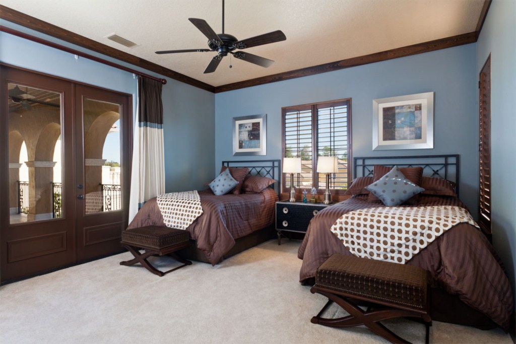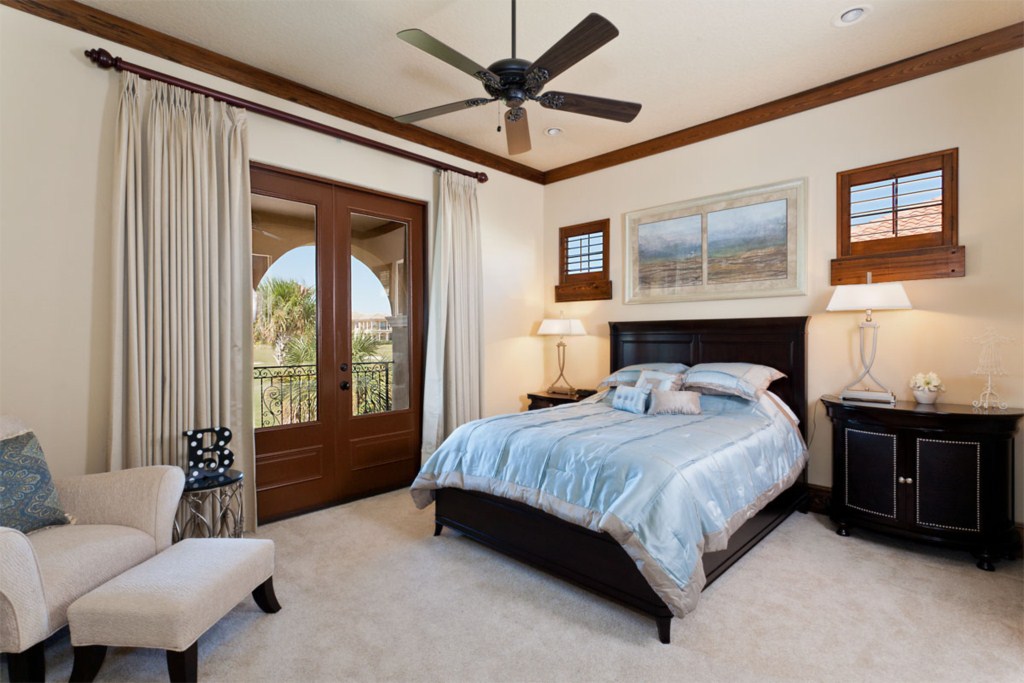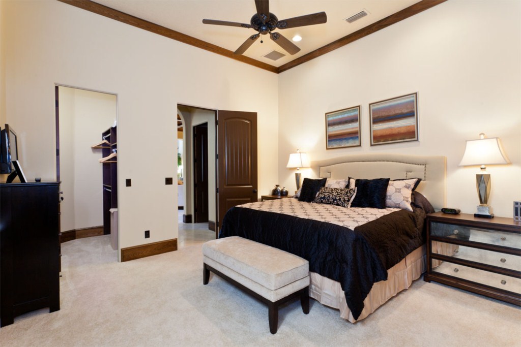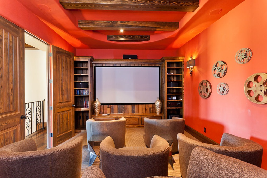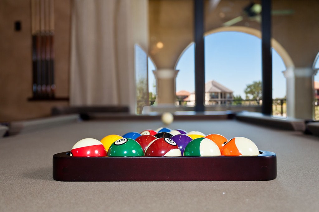 Upstairs to the front are two more bedroom suites, the first having two full size beds and the second with a queen bed. Both these rooms have a bathroom ensuite, fitted closet, flat screen TV's and offer access onto the front balcony. o the rear of the house is the fifth bedroom suite with a queen bed, bathroom ensuite, fitted closet and access via the French doors onto the rear balcony with picture perfect views. You will find a second guest bathroom along the hallway for the convenience of guests using either the dedicated movie theatre with it's huge screen and tiered seating or the games room incorporating a pool table, built in wet bar and seating with access onto the rear balcony providing breathtaking views of the golf course. This really is the perfect spot for watching the sun go down.