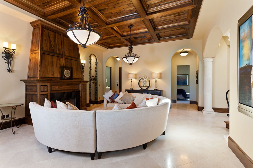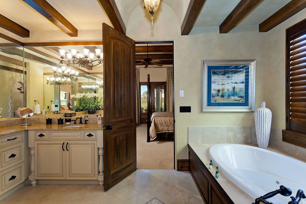 As you enter this home into the beautiful entrance foyer with it's feature staircase of wood, wrought iron and ceramic tile the standard is set for the amazing architectural details that are displayed throughout nearly 5000 sq ft of living space. The center of the house is dominated by the elegant formal living and dining areas which include a feature fireplace and one wall of French doors overlooking and allowing access onto the paved travertine pool deck. Off this area to one side is the gourmet kitchen with 42" custom cabinets, granite counter tops and central island, stainless steel appliances and many labour saving accessories including an over the range faucet. The kitchen adjoins the comfortable family living area which incorporates the informal dining and seating with over sized comfortable sectional seating surrounding the large flat screen TV. A large expanse of sliding doors open onto the covered area of the pool deck overlooking the golf course. On the other side of the formal area is the spacious kingsize master bedroom suite with sitting area and large wall mounted TV, there is also access via the French doors onto the pool deck. The large bathroom of this suite has twin feature vanities, a makeup vanity, jacuzzi tub, walk in shower and fully fitted walk in closets. In addition to the laundry room and guest bathroom there is a second kingsize bedroom suite located at the front of the property with a flat screen TV, bathroom ensuite and fitted closet.