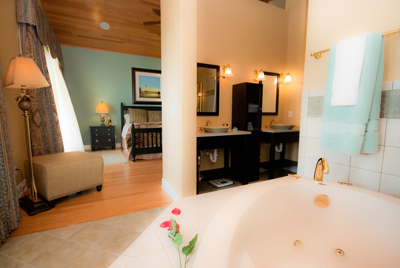 A perfect choice for those guests looking for a cozy home, but still wanting the luxury associated with custom built homes. On the ground floor of the main house is a King-size bedroom with ensuite bathroom. There is also a guest powder room, an open plan living area incorporating comfortable seating, large flat screen TV, dining area, and fully equipped kitchen with granite counter tops and stainless steel appliances. The living area has a wall of windows with beautiful views across the golf course and opens onto the ground floor rear furnished patio area perfect for that evening cocktail whilst watching the sun set. On the first floor overlooking the courtyard is a queen-size bedroom with ensuite bathroom and to the rear is the large King-size master suite, a truly unique room with it's timber vaulted ceiling, large ensuite bathroom including a sunken jacuzzi bath, multi head walk in shower and tapestry wall decor. From the bedroom and bathroom you can access the private balcony and probably some of Reunion's best views.