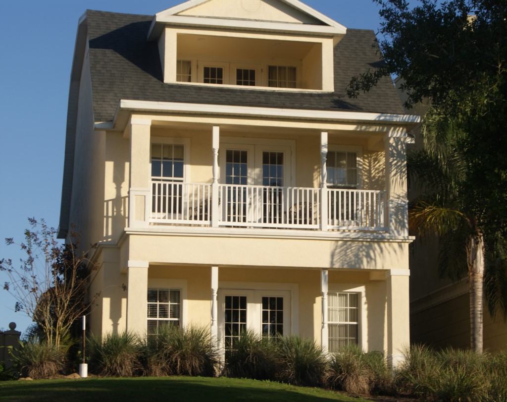 If it's relaxed living and plush surroundings you're looking for, then this courtyard style villa has it all . Situated in the Liberty Bluff division of the Reunion Resort overlooking one of the three PGA golf courses makes this a perfect location. Every room has been decorated and furnished to the highest standard with flat screen TV's in all the bedrooms. The ground floor of the main house is where you will find the fully equipped kitchen with it's granite counter tops, a formal seating area, formal dining room and the family gathering area. At either end of the ground floor are French doors, the rear opening onto a seating area overlooking the golf course and the front onto the pool deck. On the first floor there is a second kingsize master suite and bathroom with a private balcony overlooking the golf course. There are two futher bedrooms, one queen size and the other having two twin beds and a private balcony, with both sharing the family bathroom and overlooking the pool deck. The laundry facilities are also found on the first floor. The second floor offers complete privacy for the main master suite offering a sitting area, work station and private balcony with breathtaking views across the golf course and resort. The bathroom is large with a sunken tub, walk in shower and twin vanities.