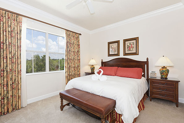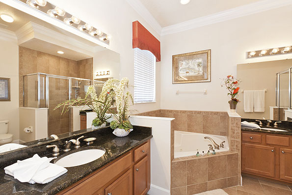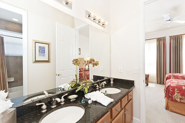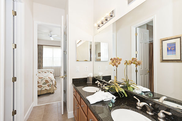 Upstairs there are three further bedrooms, one to the front of the house has two twin beds and access to the balcony offering views of the golf course, the second having two full size beds. These two bedrooms share a 'jack n jill' bathroom with twin vanities and a tub shower combination. The fourth bedroom is the second king-size master suite located at the rear with an ensuite bathroom offering a Jacuzzi tub, walk in shower and twin vanities.
