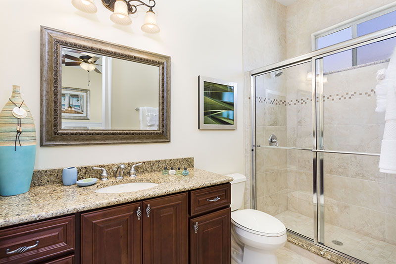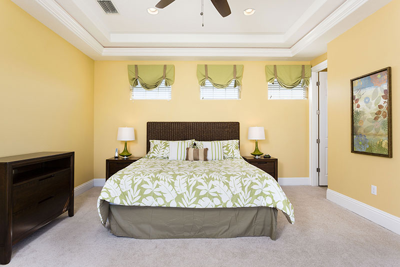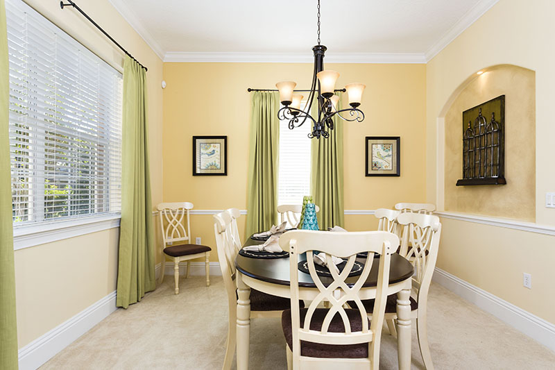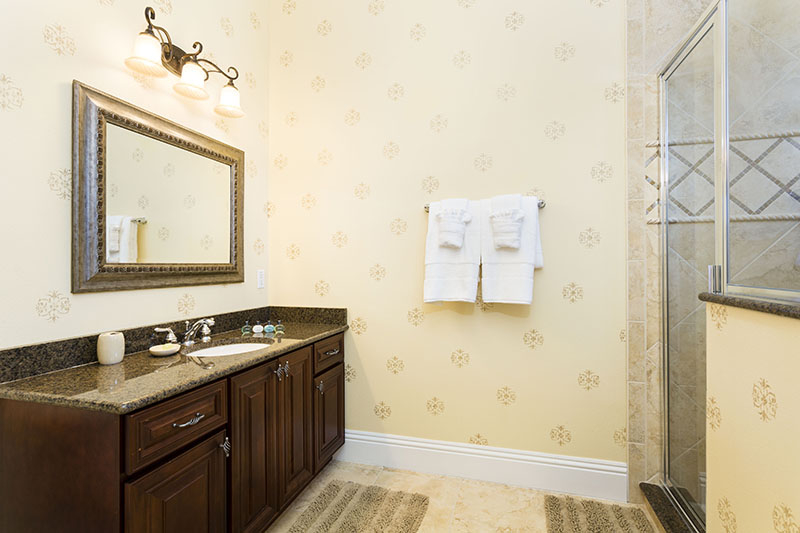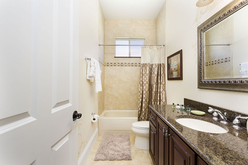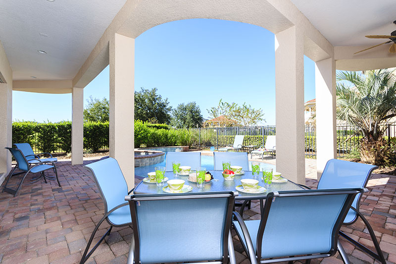 This large spacious home also offers a large driveway for ample off road parking. The decor and furnishings have been chosen to the high standards associated with the Reunion Resort. The open hallway features a sweeping stair case, and to the left is the bright formal dining area which leads onto the open plan living areas of the home. This incorporates the laundry room, a guest bathroom, an open plan fully equipped kitchen complete with large central island, breakfast bar, granite counter tops, and brand new stainless steel appliances. The kitchen area overlooks the family living area which includes casual dining and ample comfortable sofas surrounding the large flat screen TV. The family area has one wall overlooking the large pool deck with its heated pool and spa where you will be able to enjoy the extended lounging space. Also the shaded dining areas and picturesque views across the golf course, there is also a pool bathroom for your convenience. A second seating area off the kitchen has been designed to provide the perfect space for children to enjoy their games console, or for a guest to view their favorite program. The main master suite with its huge bathroom incorporating double vanities, a large corner tub, a wet room and having access onto the pool deck via French doors is the only bedroom suite on the ground floor. The movie theater/games room is located off the hallway and will provide hours of entertainment for the whole family.