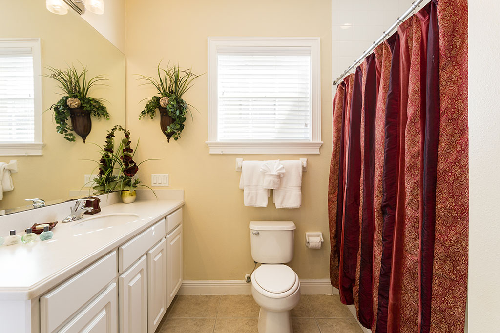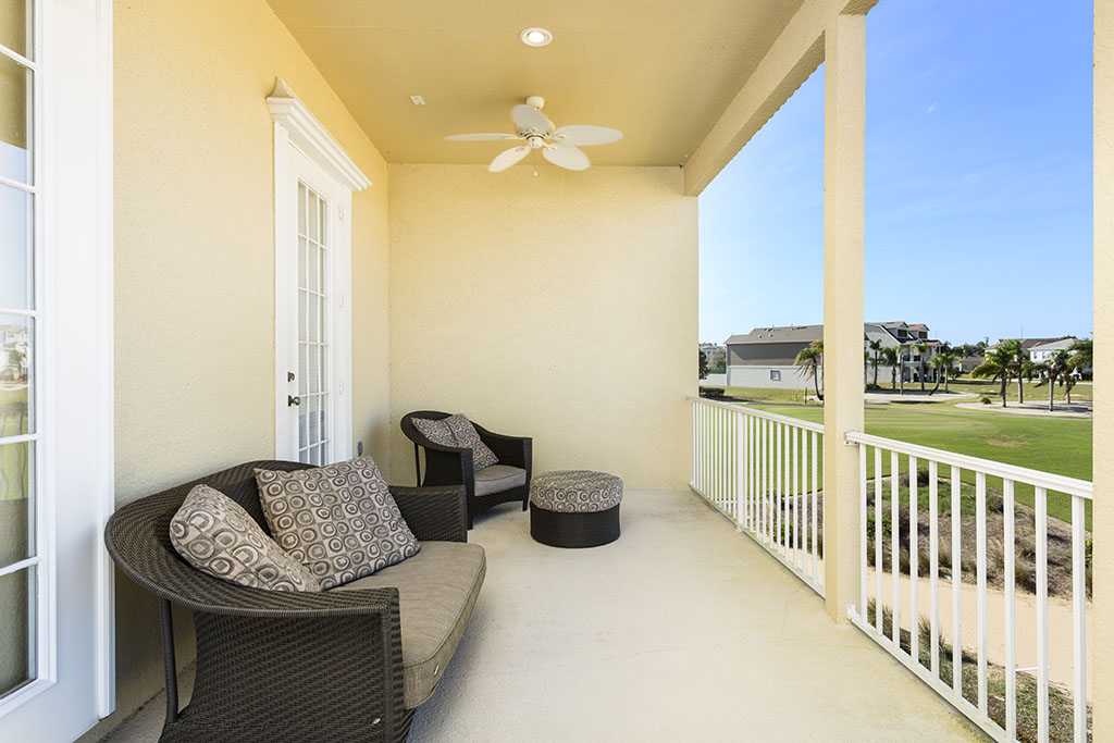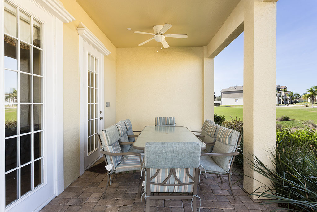 This beautiful 6 bedroom vacation home is the courtyard style home commands a fantastic position with breathtaking views across the Palmer golf course with the Reunion Grand Hotel in the background. On the ground floor of the main house are two bedrooms, one having two full size beds and the other a queen. These two bedrooms share a bathroom with a tub/shower combination also. The living area is open plan incorporating a comfortable seating area with large flat screen TV and surround sound as well as blue ray, fully equipped kitchen and dining area with access onto the rear patio with golf views, a perfect setting for an evening cocktail. Upstairs at the rear of the property is the king-size master suite and ensuite which includes a garden tub, walk in shower and double vanities with a private balcony. Two further bedrooms, one king-size, and one queen share a bathroom with a tub/shower combination, the laundry room is also located off the landing area.