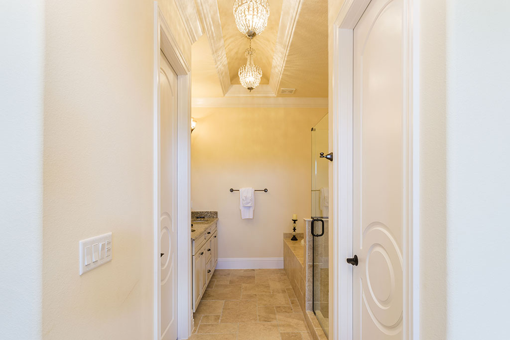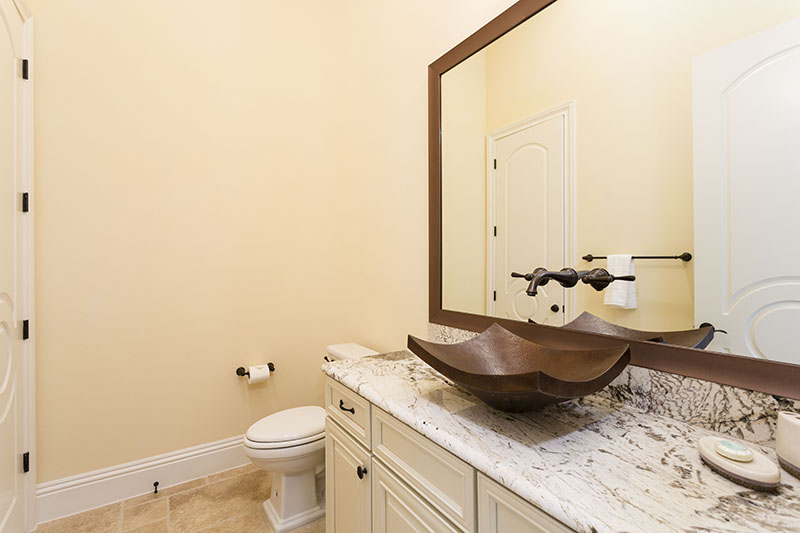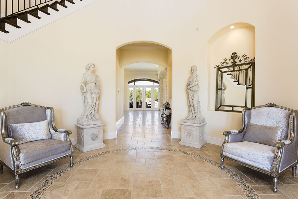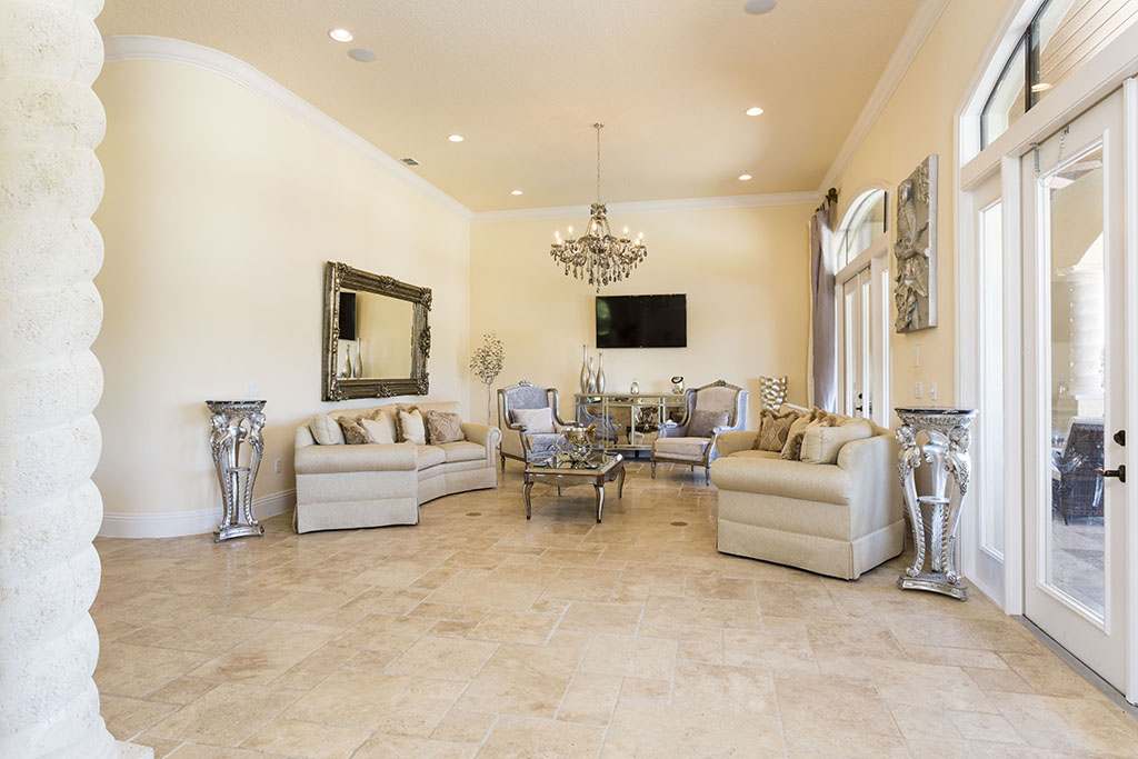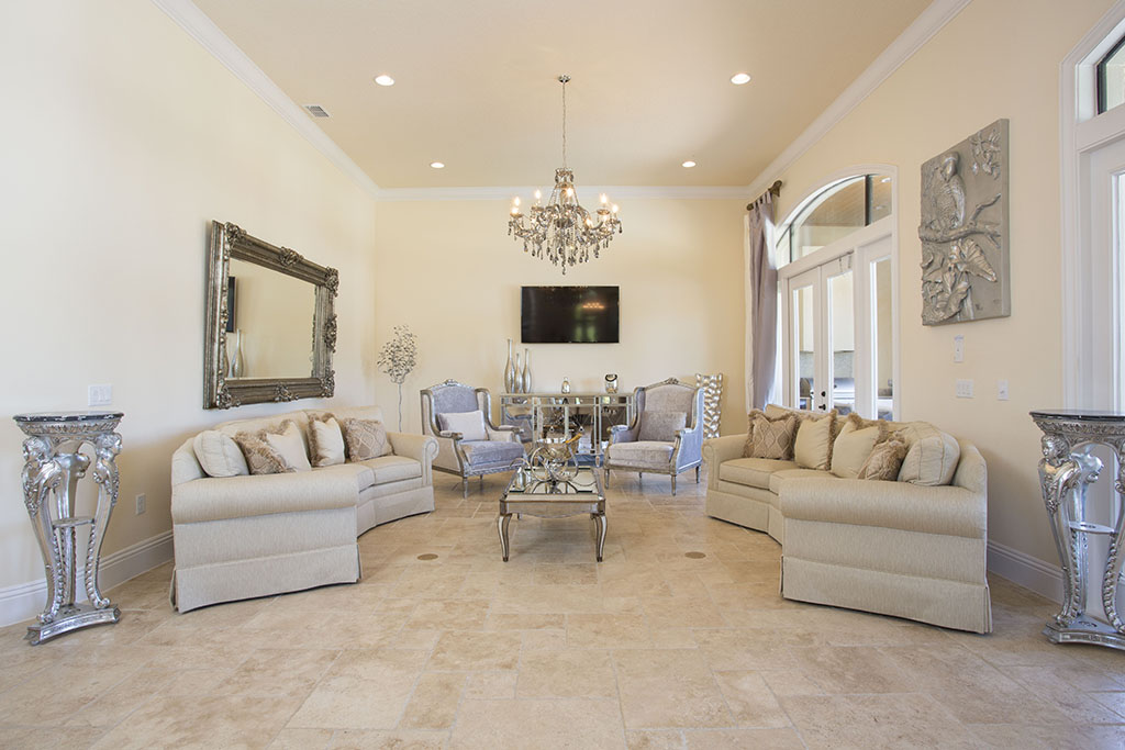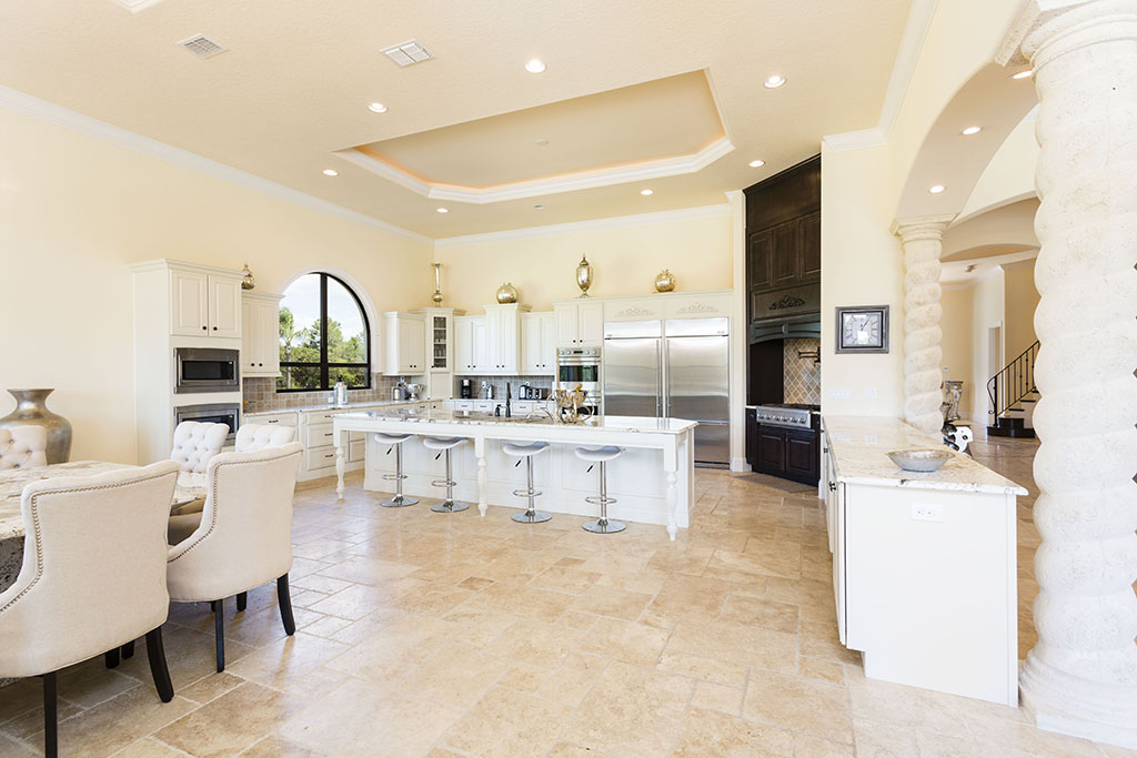 Outside will fulfill your every requirement for the perfect vacation with an over sized travertine deck surrounding the large pool and spa surrounded by lounging space, a slide, sunken bar, covered dining area, built in Summer kitchen, pool bathroom, putting green, and wall mounted flat screen TV. Come live the dream!