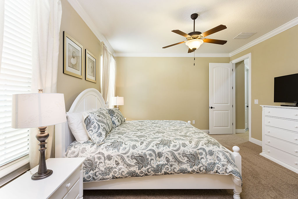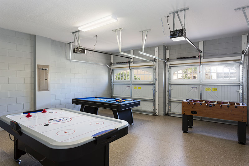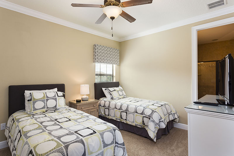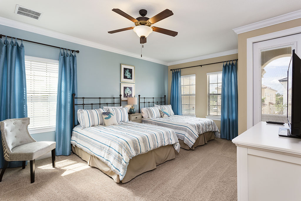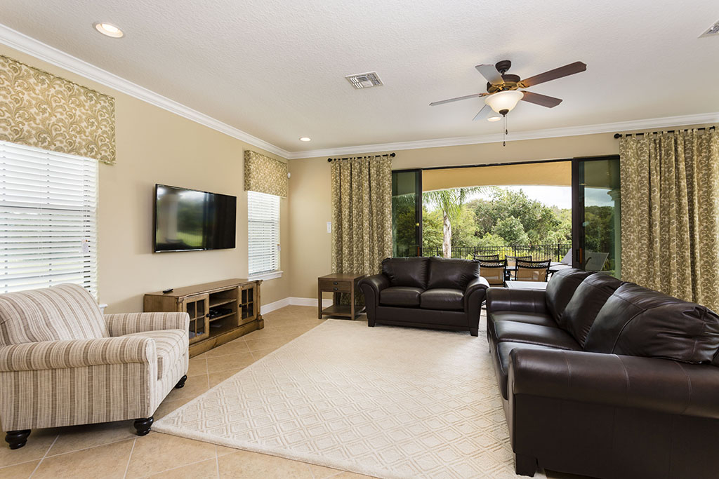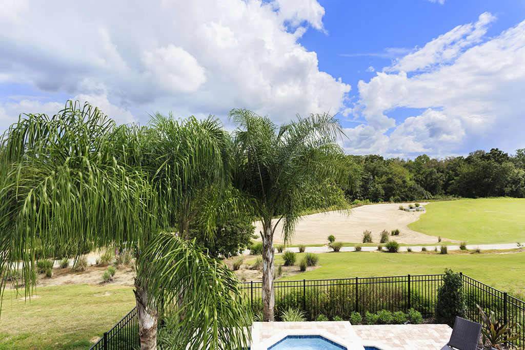 The ground floor living area is open plan at the rear of the home incorporating the kitchen with its granite counter tops, stainless steel appliances, and breakfast bar which overlooks the formal dining area and family room. The family room has comfortable seating, a large wall mounted flat screen TV, and a wall of patio doors offering access and amazing views of the outdoor living space and golf course beyond. To the front is games room with pool table, foosball, air hockey and seating which will provide hours of entertainment for the family and certain to give the adults some down time. The only bedroom on this floor is the first king-size master suite with the ensuite bathroom having twin vanities and walk in shower. There is also a guest powder room and fully equipped laundry room for added convenience. Upstairs the landing area provides a second lounge space with ample seating, large TV, and game console. To the rear is the second king-size master suite with its private balcony providing views of the pool area and beyond. The ensuite has twin vanities, tub and walk in shower. Off the landing are two bedrooms one with a king-size bed and the other two twin beds, both ensuite bathrooms offer walk in showers. At the front of the home is the fifth bedroom suite which has two full size beds, a private balcony, and the bathroom which offers a tub/shower combination.