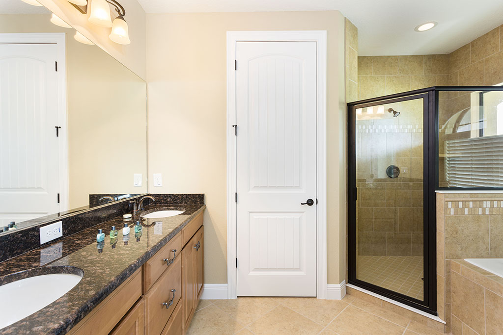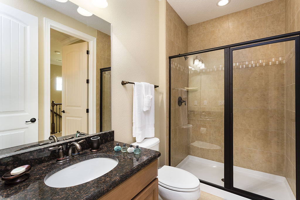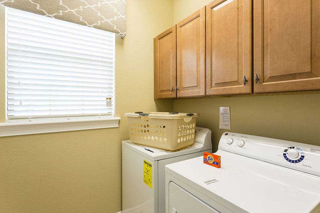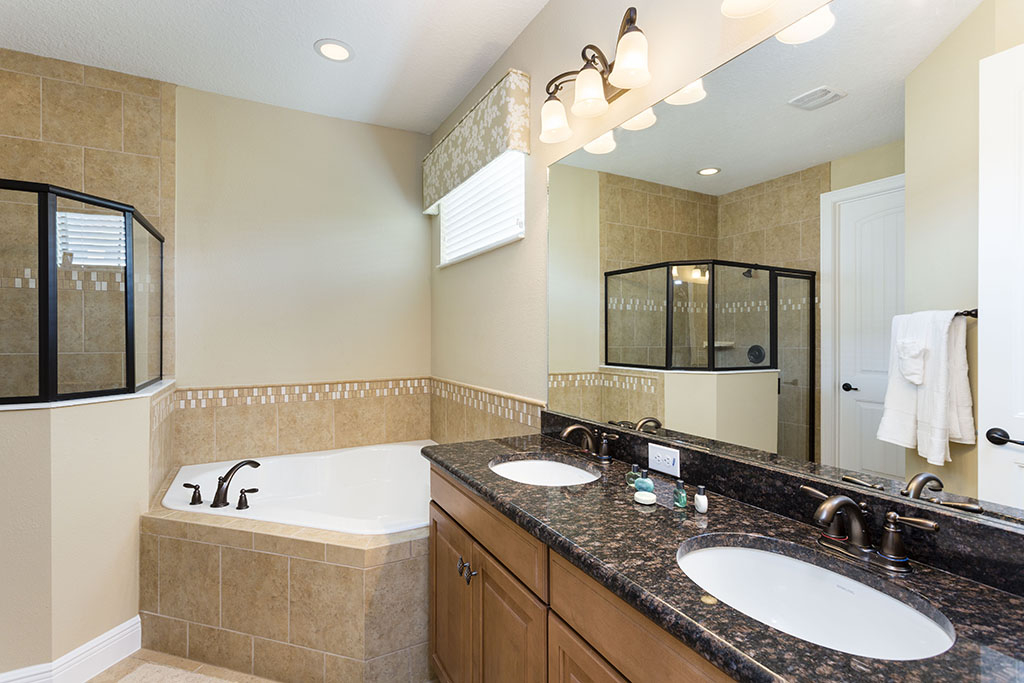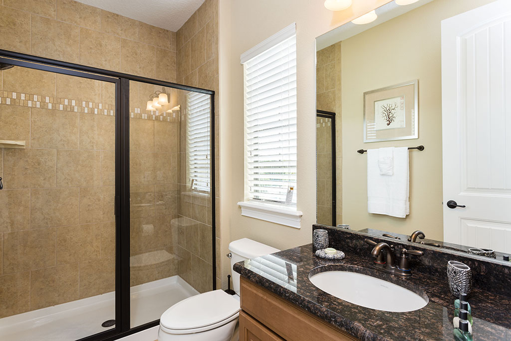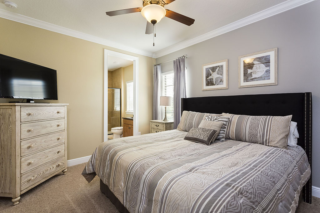 The ground floor living area is open plan at the rear of the home incorporating the kitchen with its granite counter tops, stainless steel appliances, and breakfast bar which overlooks the formal dining area and family room. The family room has comfortable seating, a large wall mounted flat screen TV, and a wall of patio doors offering access and amazing views of the outdoor living space and golf course beyond. To the front is games room with pool table, foosball, air hockey and seating which will provide hours of entertainment for the family and certain to give the adults some down time. The only bedroom on this floor is the first king-size master suite with the ensuite bathroom having twin vanities and walk in shower. There is also a guest powder room and fully equipped laundry room for added convenience. Upstairs the landing area provides a second lounge space with ample seating, large TV, and game console. To the rear is the second king-size master suite with its private balcony providing views of the pool area and beyond. The ensuite has twin vanities, tub and walk in shower. Off the landing are two bedrooms one with a king-size bed and the other two twin beds, both ensuite bathrooms offer walk in showers. At the front of the home is the fifth bedroom suite which has two full size beds, a private balcony, and the bathroom which offers a tub/shower combination.