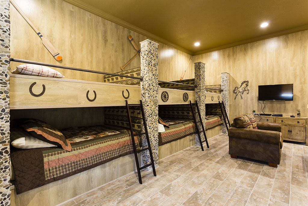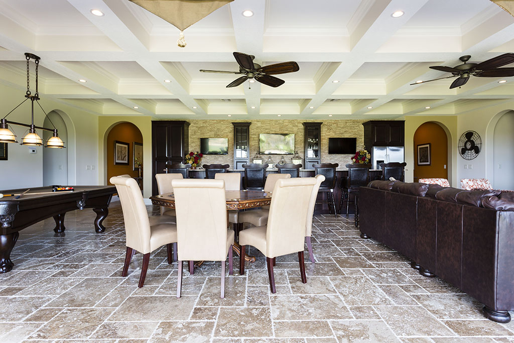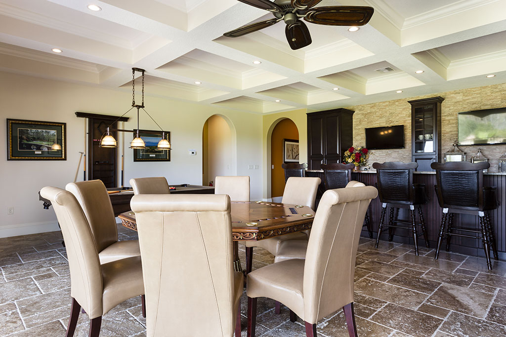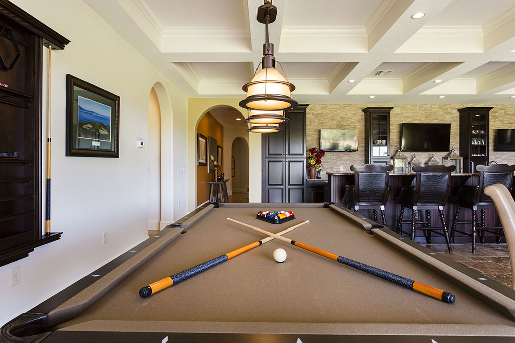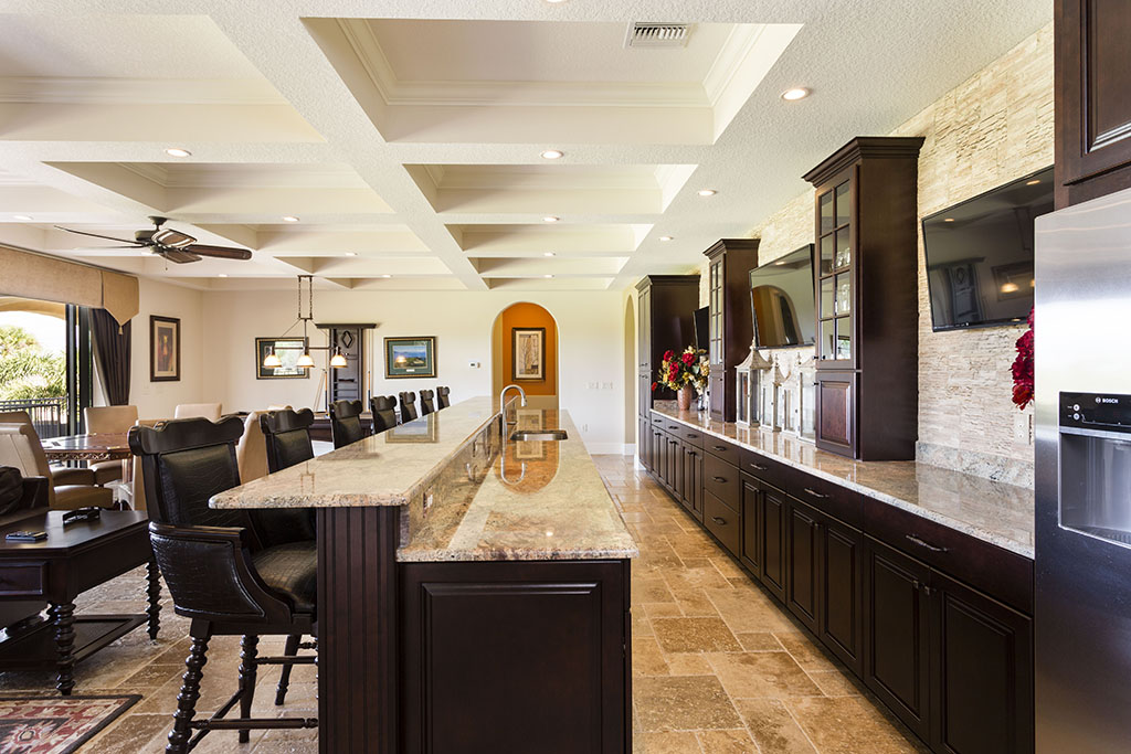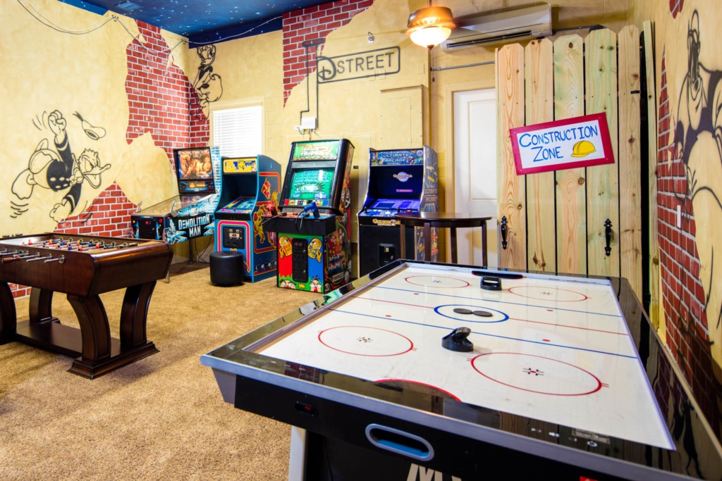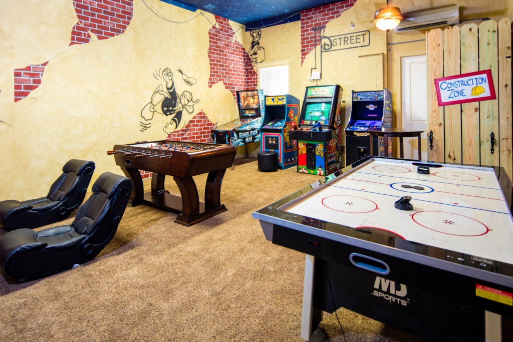 Whilst this luxurious custom built home looks impressive from the outside, your dream truly begins when you enter the home through the grand hallway with it's featured staircase, that is a central aspect highlighted by it's gallery landing. The games room is situated off the hallway and features an array of games that are guaranteed to keep the children occupied and entertained for hours and convenient to the purpose designed 'bunk' room that will be a haven for the children in the group, three sets of two full size bunks with a wall mounted TV and Playstation will be a haven for the younger children. If that wasn't enough, across the hallway is the games room offering airhockey, foosball, arcade game, wall mounted TV and games Xbox games console. There are four further kingsize bedrooms on the ground floor with ensuite bathrooms, two of them are king-size masters and located at the rear of the home, both offering access onto the pool deck, beautiful wooden floors, and bathrooms with twin vanities. One has an oval tub and walk in shower, and the other an over sized walk in shower with multiple shower heads. The open plan living area incorporates a separate powder room, a huge fitted kitchen complete with a long granite breakfast bar, two built in refrigerators, double oven, two dishwashers, and a large center island houses the commercial size hob. This truly is a gourmet kitchen with walk in pantry, two dishwashers, two refrigerators and an ice maker. The family seating area offers comfortable sofas from which to enjoy the large wall mounted TV and a formal dining area, a wall of glass doors open onto the covered lanai and overlooks the pool with golf course beyond.