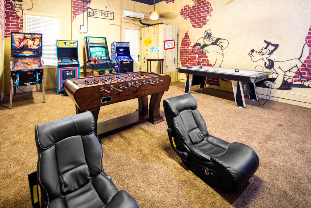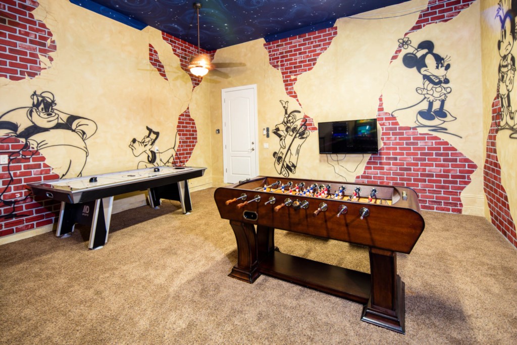 Upstairs there are six further bedrooms all ensuite with two bedrooms being the third and fourth king-size masters with access onto the rear balcony with it's breathtaking views. Two of the bedrooms offer two queen size beds in each and the final two are kingsize. At the front of the home is the exercise room with elliptical machine, exercise bike, and work bench. Also located on this floor is a second powder room and the impressive three tiered movie theatre which will be the perfect place to gather for movie night or for corporate groups to hold their presentations. The second gathering area of this magnificent home boasts a huge purpose built bar and preparation area offering a refrigerator, microwave, ice maker, and dishwasher all built into the granite counter top providing ample seating. With a card table, pool table, multiple TV screens perfect for game night and access onto the large wrap around style balcony overlooking the pool area and golf course this really is the perfect space to return to after a busy day at the parks or a conference.