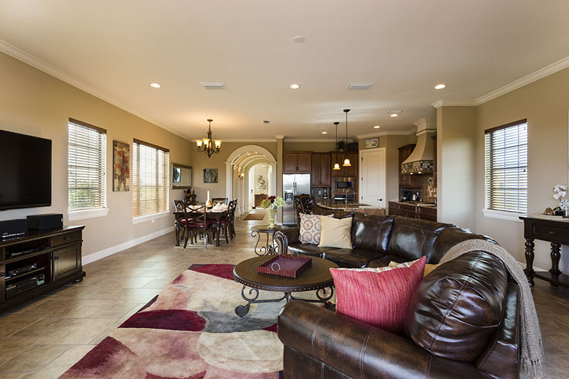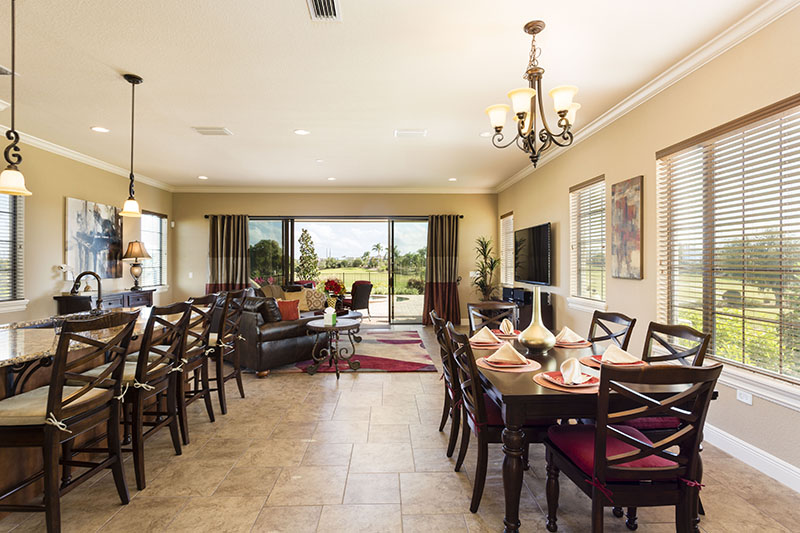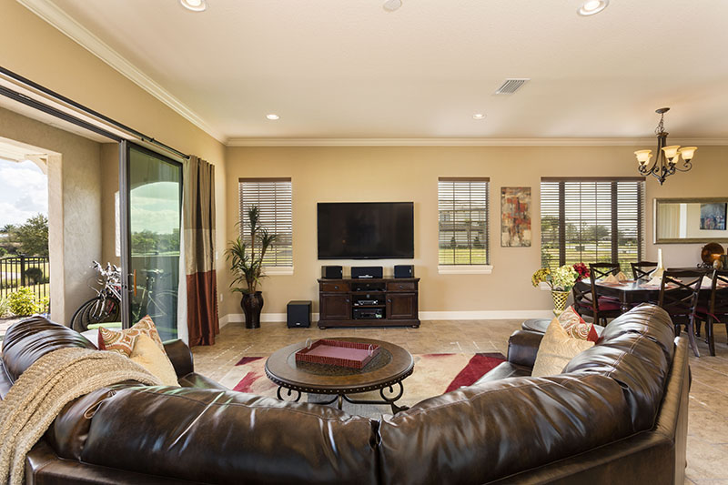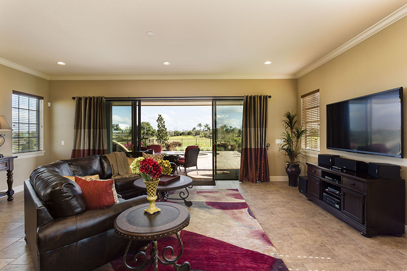 The main family living space has an open layout, with spectacular views over the pool deck and golf course beyond.