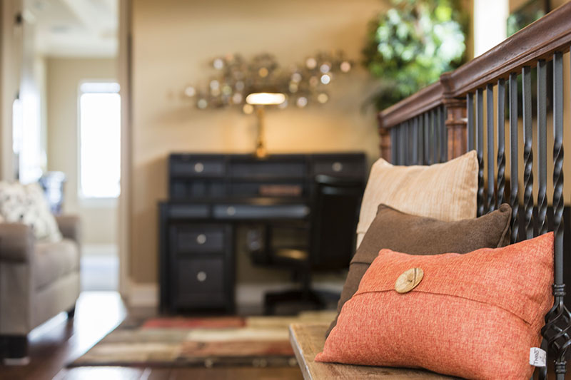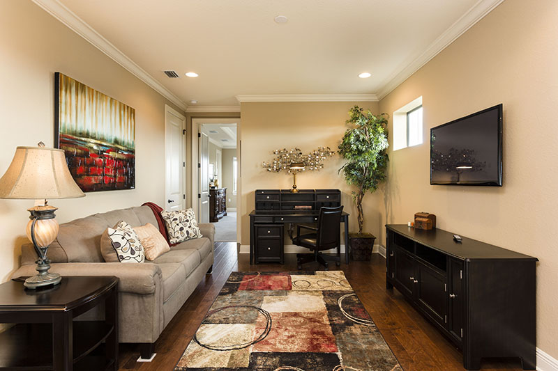 On the upper floor, a relaxing loft area includes comfortable seating and flat screen TV, along with a luxurious workstation area.